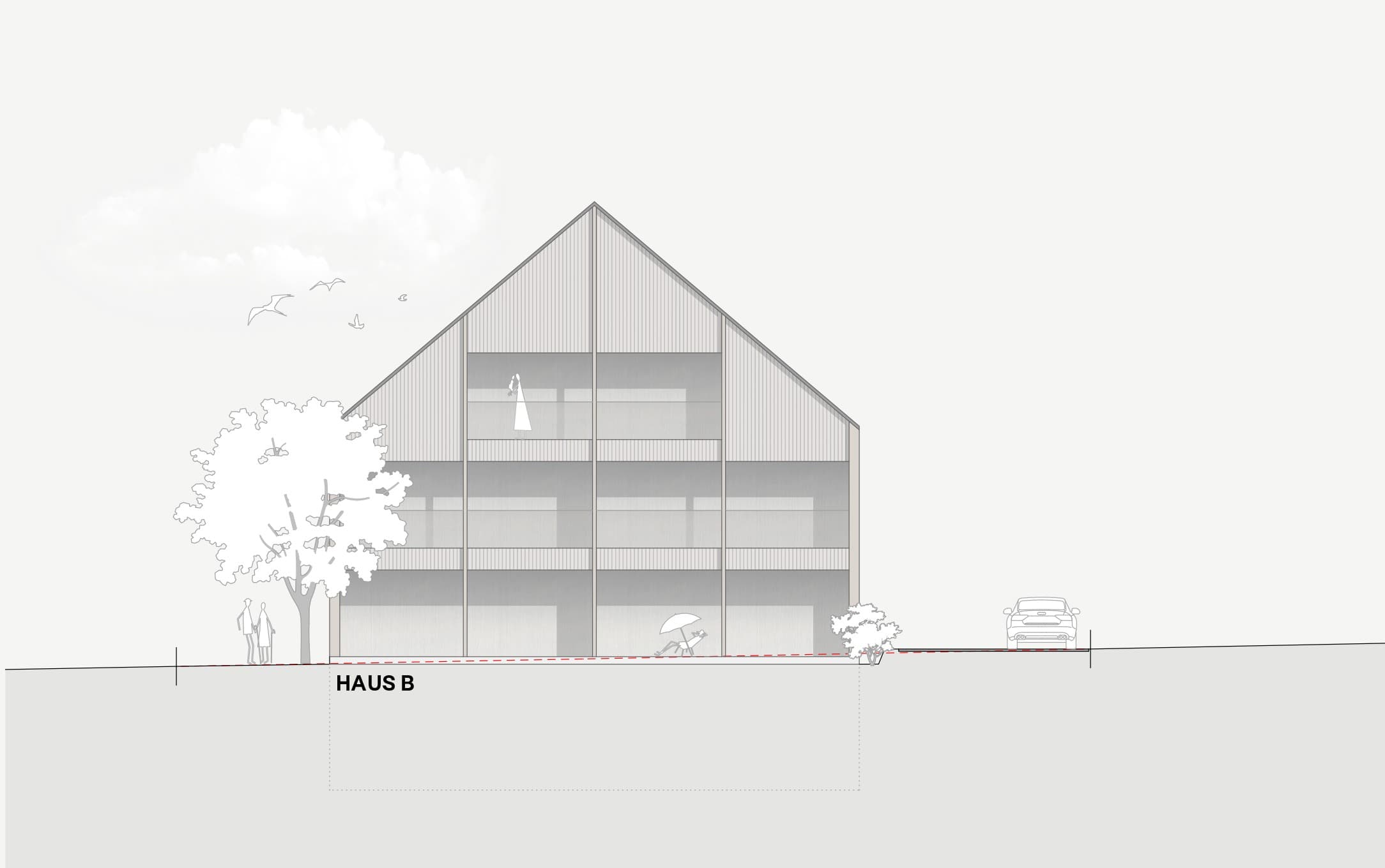 "Zwei ähnliche Bauvolumen fügen sich gut in die bestehende Siedlung ein. Während das nördliche der beiden Gebäude sich maximal in die Parzelle einpasst, wird das südliche leicht ausgedreht unter Beibehaltung der bestehenden Stützmauer in die angetroffene Topografie gesetzt.