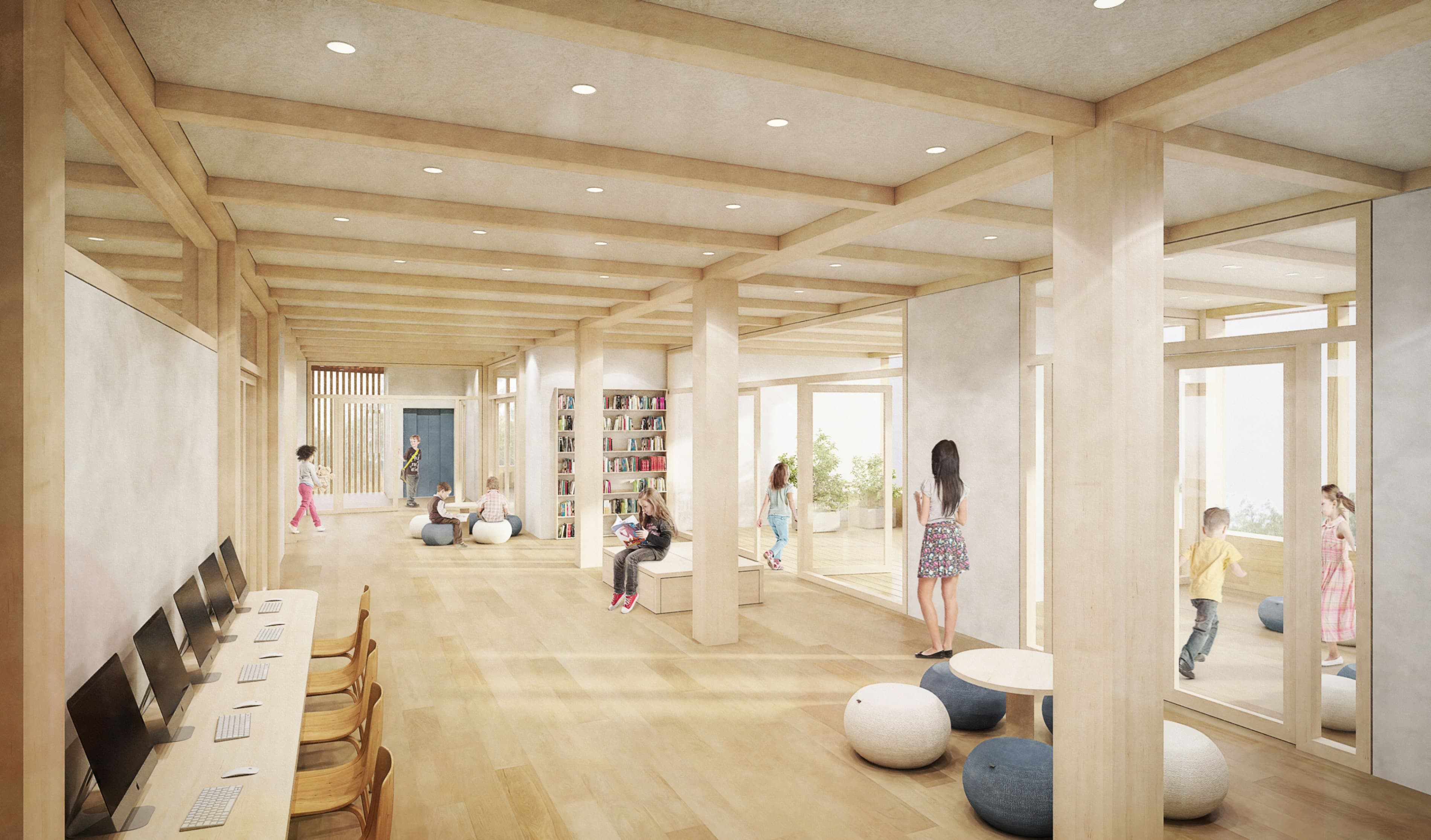 "Der Wettbewerbsbeitrag setzt die ostseitig zeilenförmige Bebauungsstruktur auf dem Wettbewerbsgrundstück mit einem markanten 6-7 geschossigen Längsbaukörper fort, der in reiner Holzkonstruktion angedacht ist. Die Zugangssituation erfolgt über einen großzügig gestalteten Freiraum zur Forachstraße, mit gelungenem Einbezug des Industriekanales Müllerbach, als wichtiges Landschaftselement. Über eine mögliche Begegnungszone in einem Teilabschnitt der Forachstraße, entsteht eine starke Verwebung mit dem westseitigem Forachwäldchen. Grundrisslich und funktional überzeugt das Projekt insbesondere im Erdgeschoss mit klar zonierten Abläufen und hohen Innenraumqualitäten, die sich über Sitzstufen und großzügig dimensionierter Treppenanlage im 1. Obergeschoss, mit den Gemeinschaftsräumen und der Verwaltung, fortsetzen. Die weiteren Obergeschosse nehmen die Kernlernbereiche und Fachraumbereiche gekonnt auf. Das geforderte pädagogische Konzept wird vollumfänglich erfüllt und auch seitens der Pädagoginnen wird die innere Organisation und der Entwurfsansatz als spannender, souveräner Beitrag beurteilt. Die klar getrennte Zugänglichkeit zum Sportbereich ermöglicht eine flexible außerschulische Nutzung."