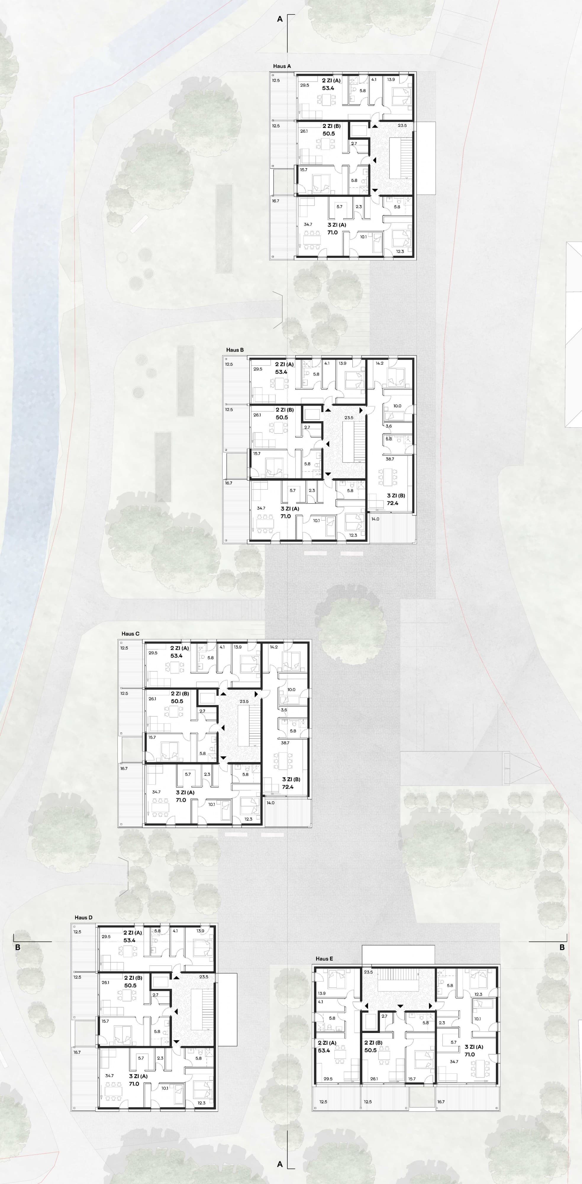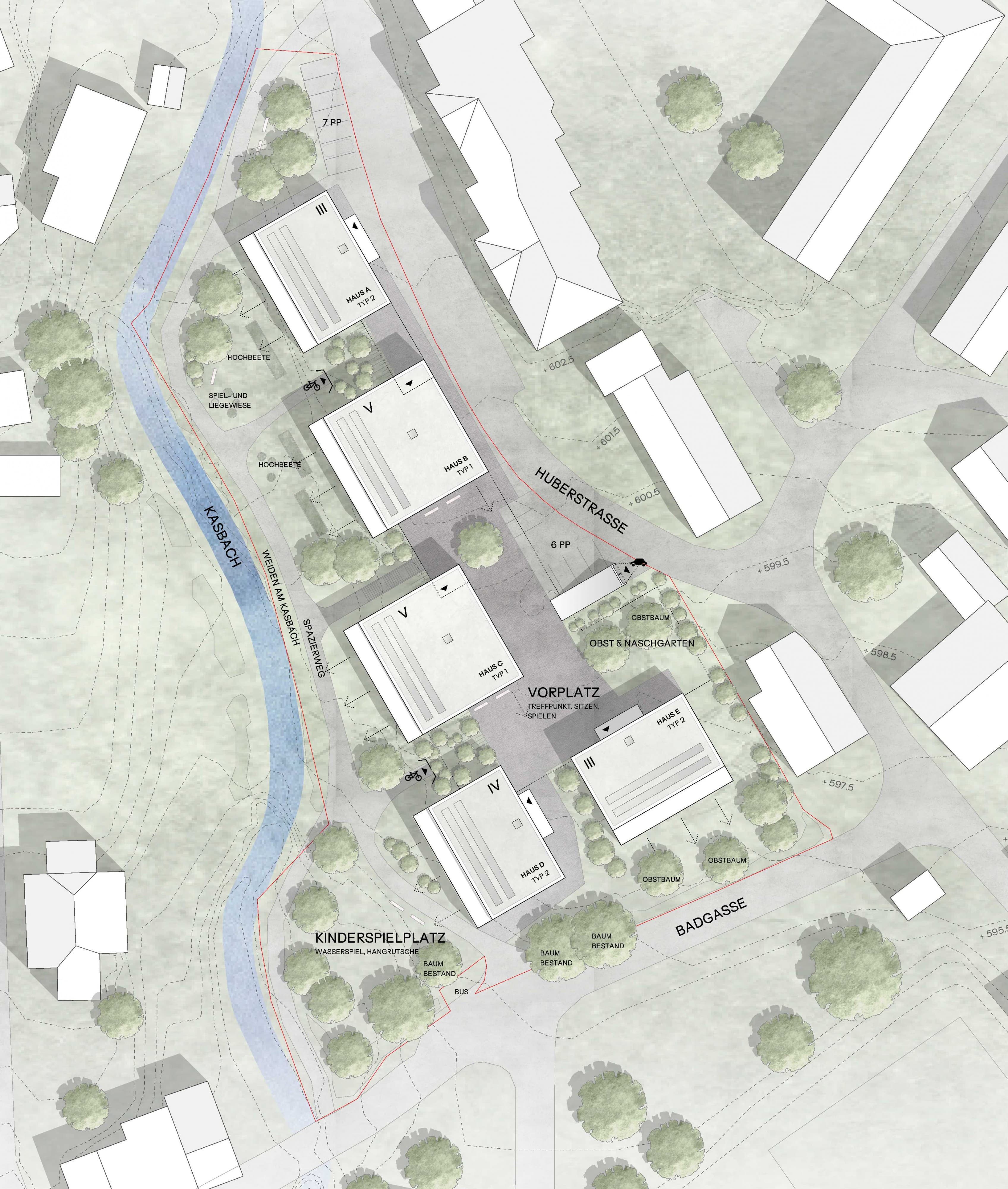 Fünf Baukörper bilden eine abgetreppte Silhouette, die Richtung Osten eine gefasste, hofartige Eingangssituation und auf der Westseite einen attraktiven Grünraum entlang des Kasbachs definiert. Durch die geschickte Anordnung der Stadtbausteine erhalten alle Wohnungen eine optimale, unverbaute Orientierung Richtung Süden oder Süd-Westen mit Blick in die umliegenden Berge. Der Grünsteifen entlang des Kasbachs soll als attraktive Erholungszone mit Spielplatz, Gemeinschaftsgärten, Grill- und Sitzmöglichkeiten und Spazierweg gemeinschaftlich genutzt werden.