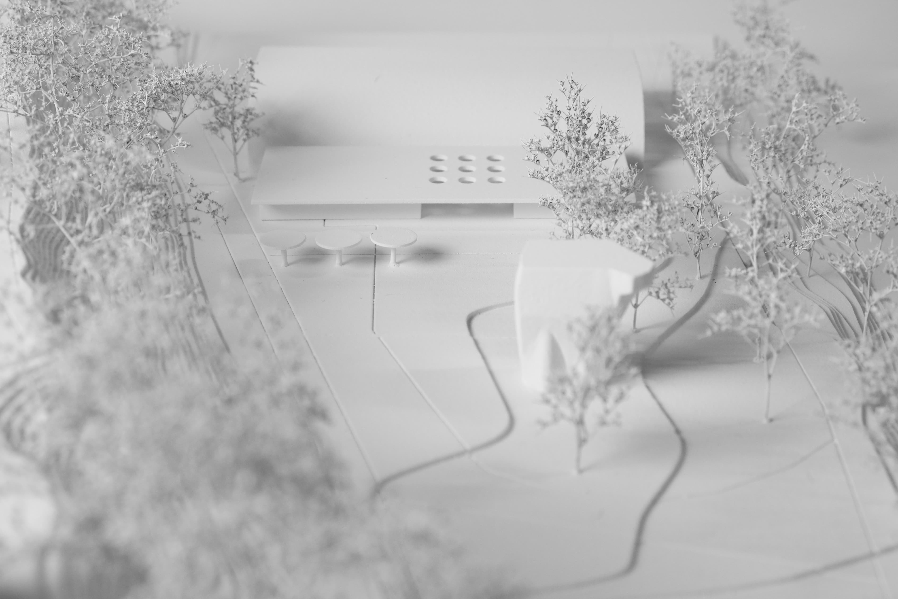 Die VerfasserIn sieht einen rechteckigen Baukörper, parallel zur Hallenlängswand vor. Dieser neue Baukörper ist voll unterkellert und schmiegt sich präzise, aber abgesetzt durch eine Fuge, an die Eingangsseite der Halle an. Die oberirdisch angeordneten Nutzungen sind in zwei Volumen aufgeteilt und werden von einem gemeinsamen Flachdach überspannt. Durch das Auseinanderrücken der beheimateten Nutzungen, wird die Eingangssituaion der Halle aufgewertet und eine Adresse gebildet. Unterstützt wird die neue Adressbildung durch die Einbringung von Tageslicht mitels Tageslichtkuppeln im neuen großzügigen Eingangsbereich.