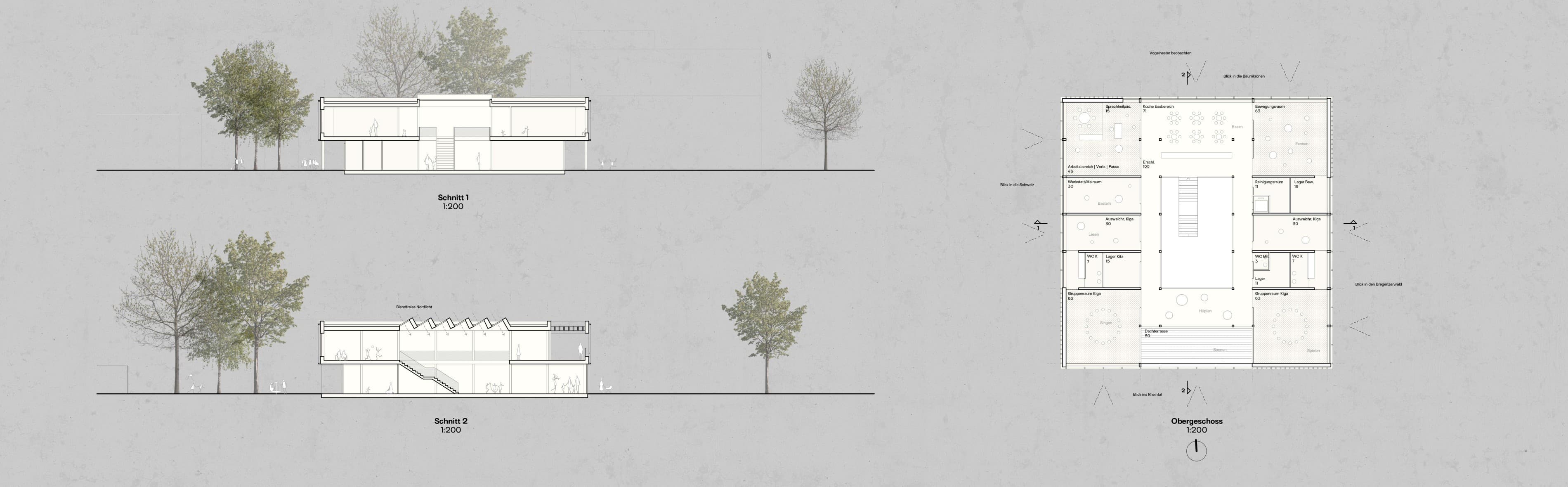 Eine breite, in Nord-Süd-Richtung durchgesteckte Mittelzone erschließt die gut orientierten Gruppenräume. Ein mittig gesetztes Atrium verbindet Erd- und Obergeschoß auf großzügigere Weise.