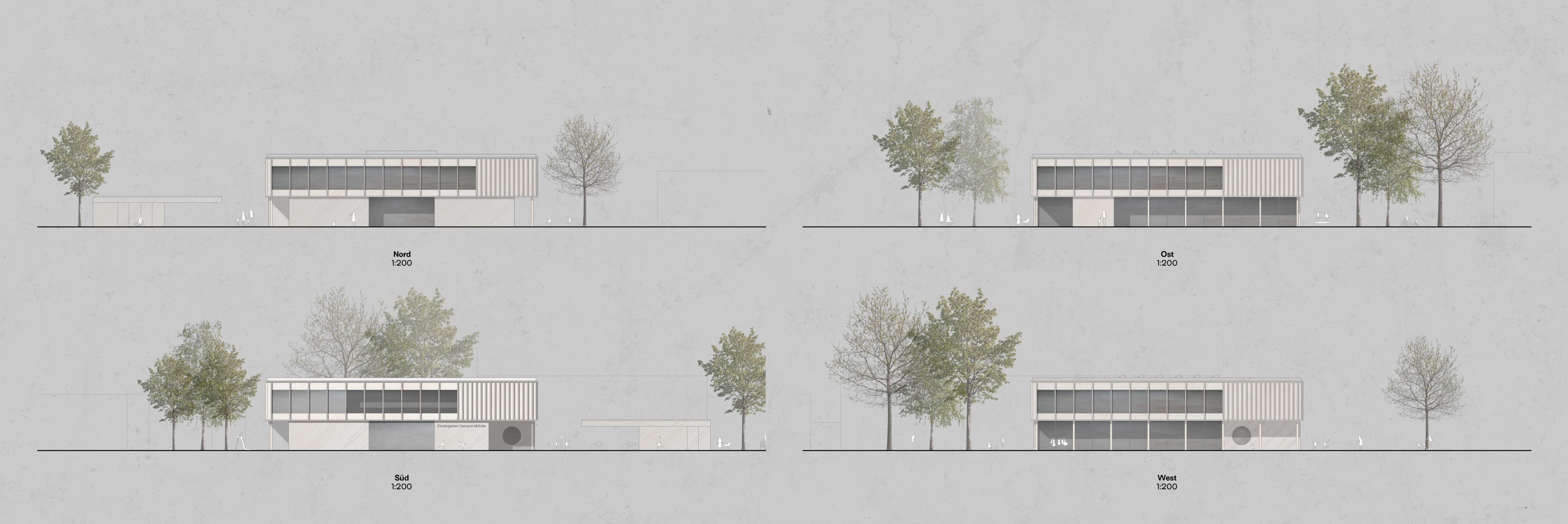 Das zurückversetzte Sockelgeschoß bildet einen gedeckten Freiraum, und schafft somit einen selbstverständlichen Außenbezug für die unteren Gruppenräume.