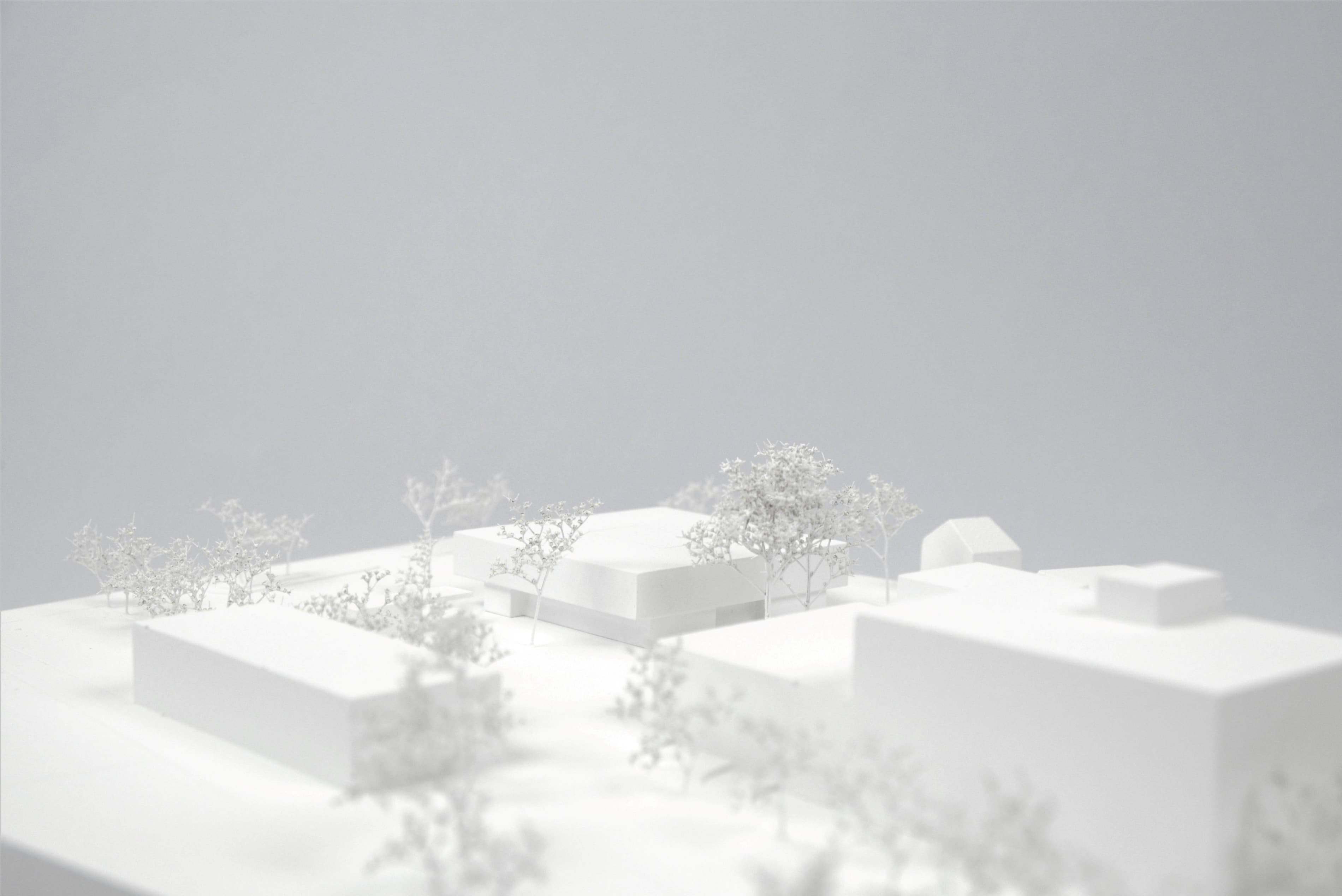 Ein quadratischer 2-geschossiger Solitär wird an die Süd-Westecke des Baufeldes gesetzt, und bildet dadurch differenzierte und gut proportionierte Außenräume aus. Zwischen Lebenshilfe und neuem Kinderhaus wird eine räumliche Mitte für das Campusgelände geschaffen.