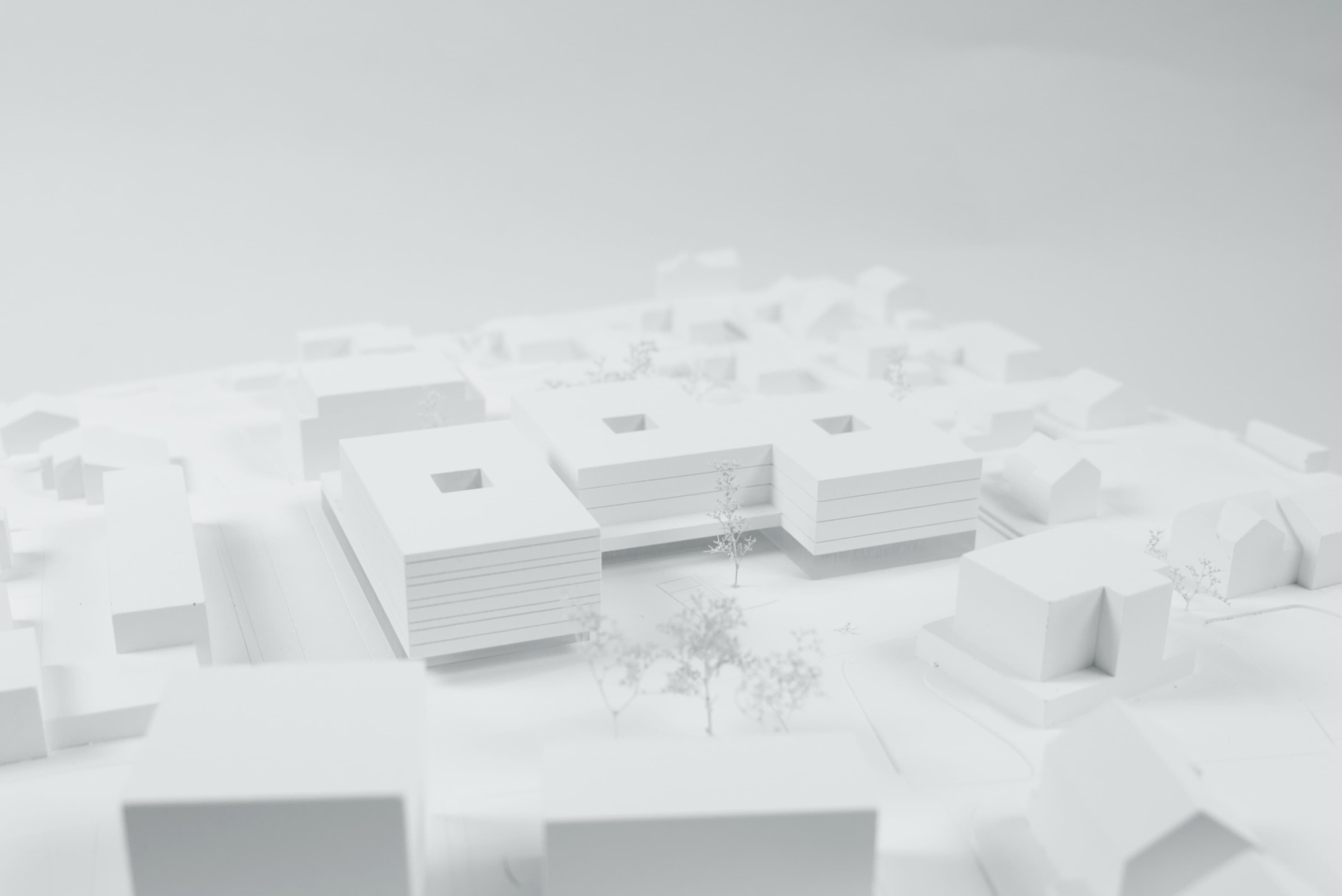 Durch die Gliederung der Baumasse in Teilvolumen werden die Gebäudelängen des Gesamtkomplexes entlang Landesstraße und Lauteracher Straße maßstäblich gegliedert und können sich so gut in die umgebende städtebauliche Körnung einfügen. Durch den Versatz zwischen Pflegeheim und Sozialzentrum entsteht darüber hinaus in Verlängerung der Kehlhofstraße eine Raumtasche zum zukünftigen Platz, die sich als neuer Endpunkt über eine Raumfolge bis in die historische Ortsmitte verbinden kann und als zentraler Erschließungsbereich für die neuen Programme anbietet.