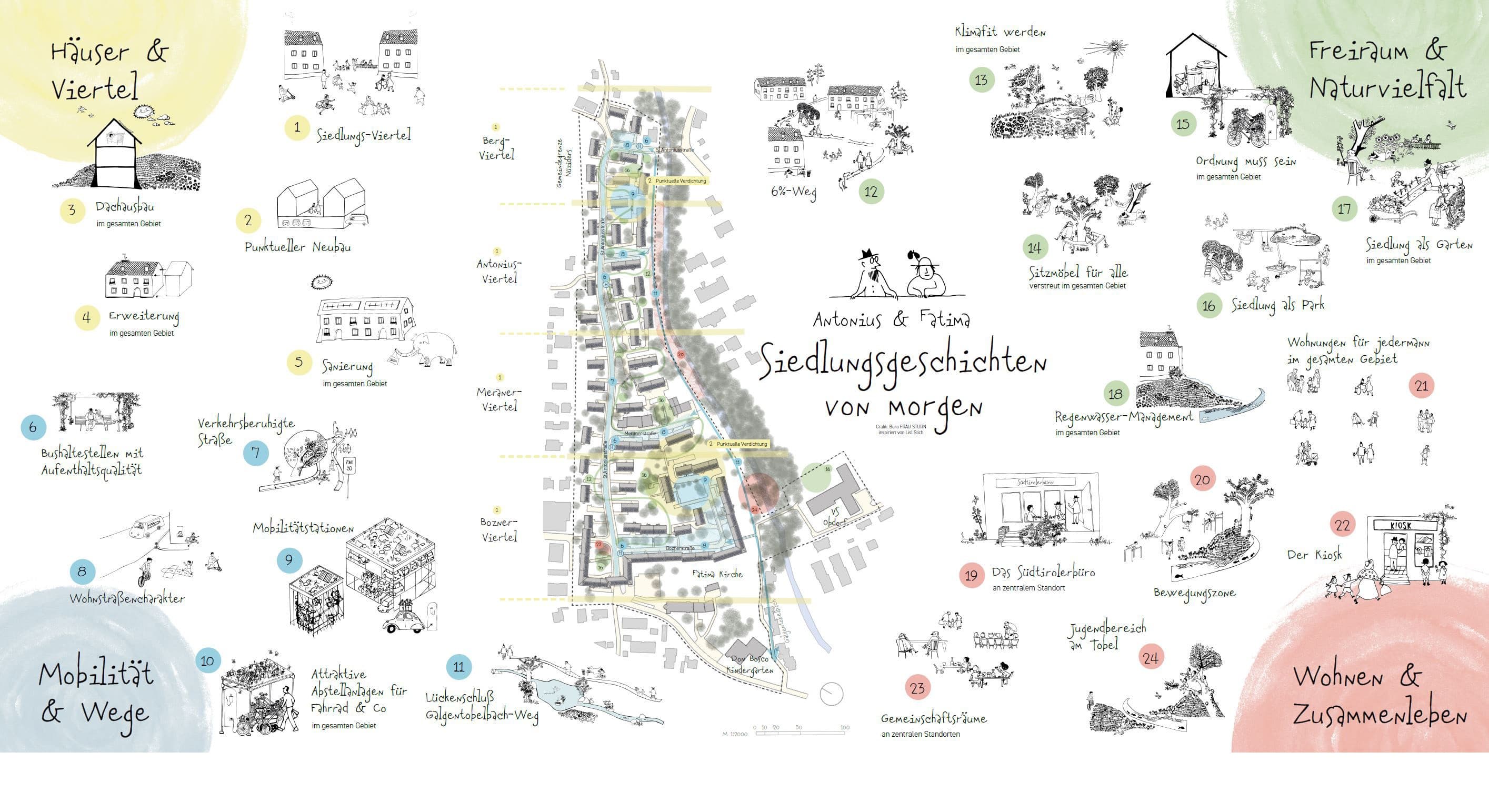 Ziel war die Entwicklung eins ganzheitlichen Modernisierungskonzeptes für die Siedlung mit den vier Schwerpunkten: Städtebau, Mobilität, Frei- und Grünräume sowie Zusammenleben und sozialgemeinschaftliche Infrastrukturen. Ein wesentlicher Bestandteil dieses Projektes war ein transparenter Beteiligungsprozess sowie die Einbindung der Bewohner:innen. Namensgeber des Projektes waren der Antonius-Wald, auf dessen Gebiet die Siedlung errichtet wurde, und die Fatima-Kirche, die ebenfalls der Siedlung angehört.