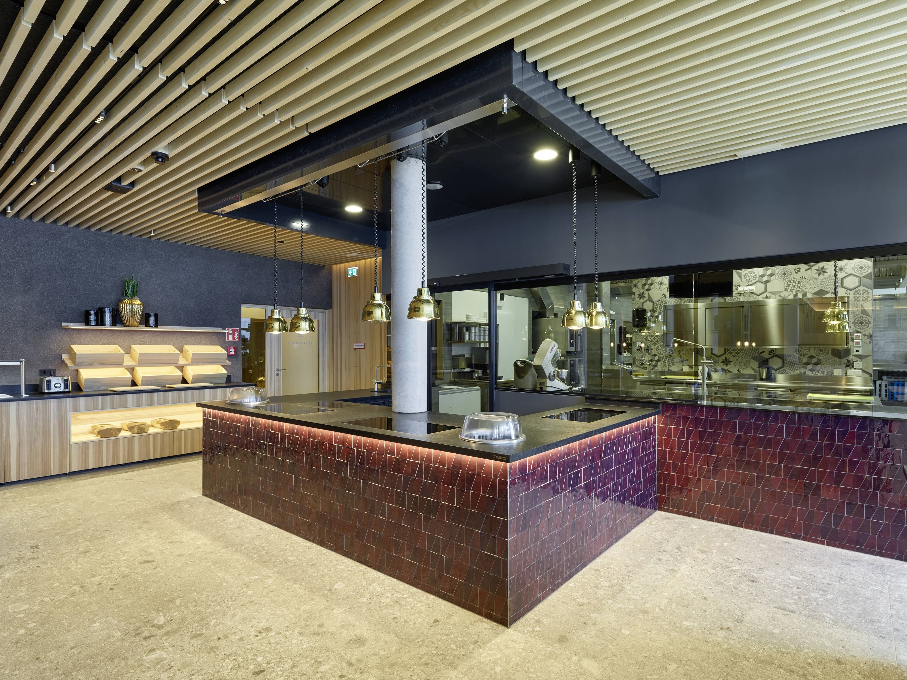 Bestehende Tiefgarageneinfahrt sowie die neue Anlieferung und der Zugang Winter sind im unmittelbaren Bereich der Zufahrtsstraße angeordnet und treten als massiv gehaltene Baukörper in Erscheinung.