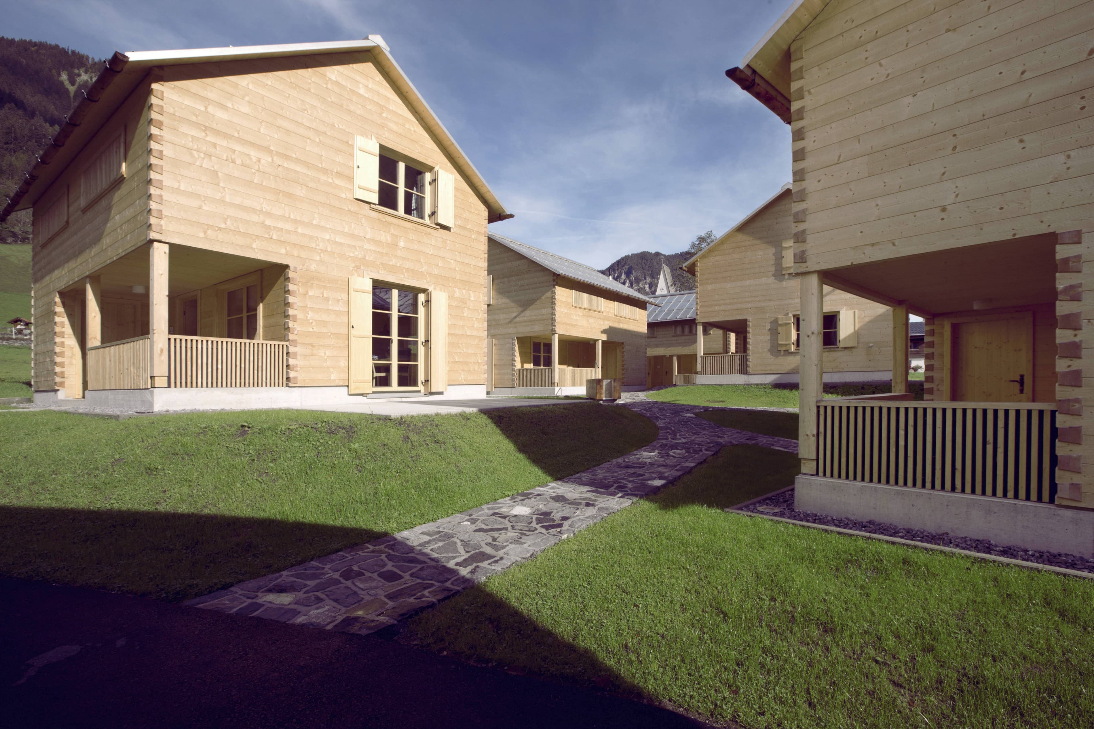 Die Ferienhausanlage liegt in mitten der Gemeinde Brand. Die sechs Hütten passen sich in die dörflich gewachsene Struktur sehr gut ein und sind abwechslungsweise nach Südosten bzw. Südwesten ausgerichtet.