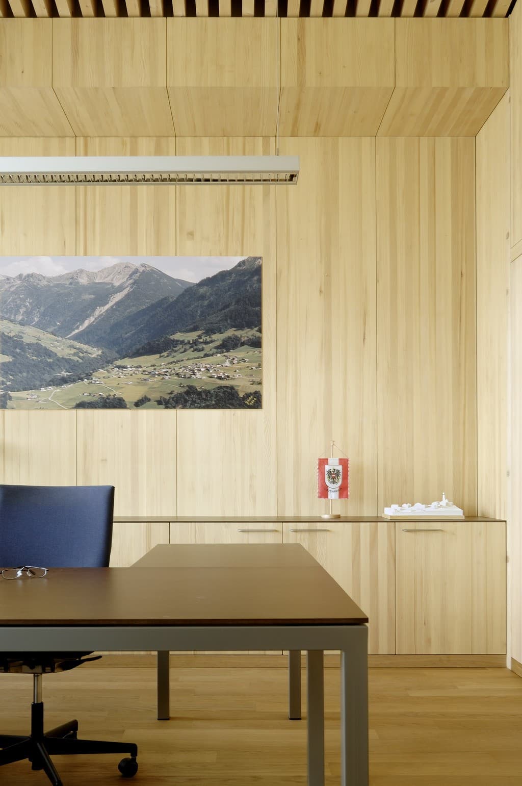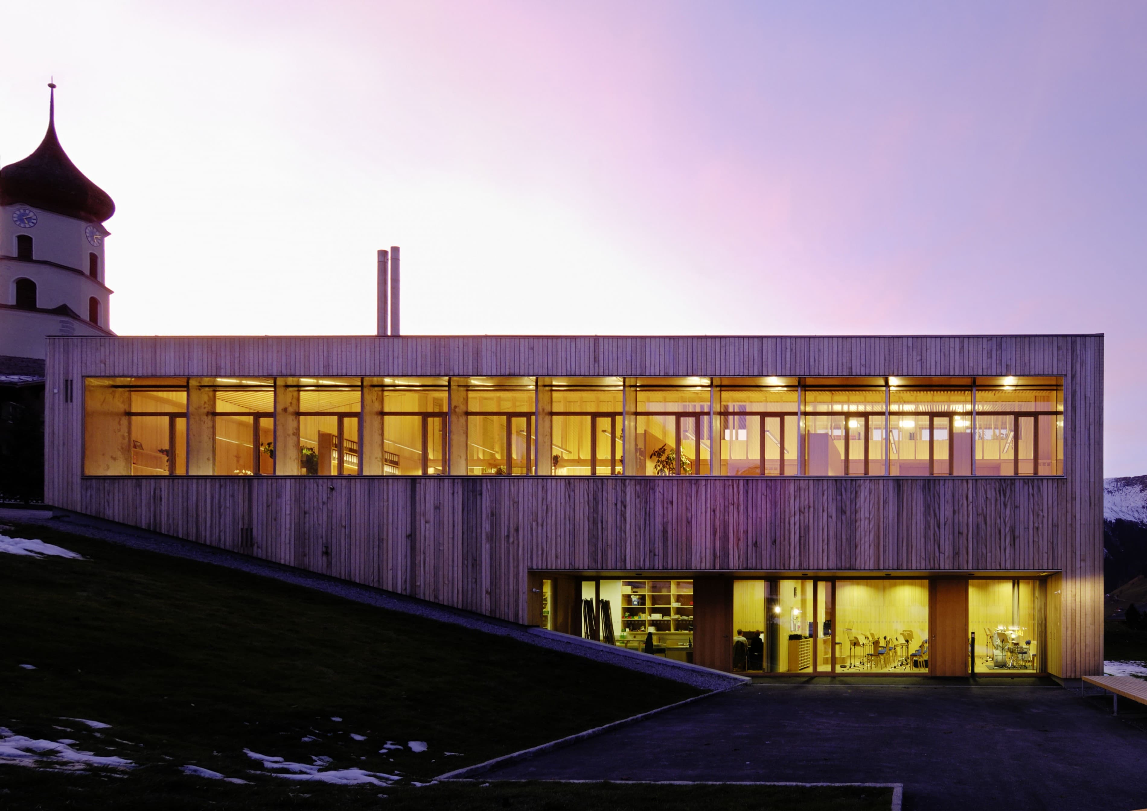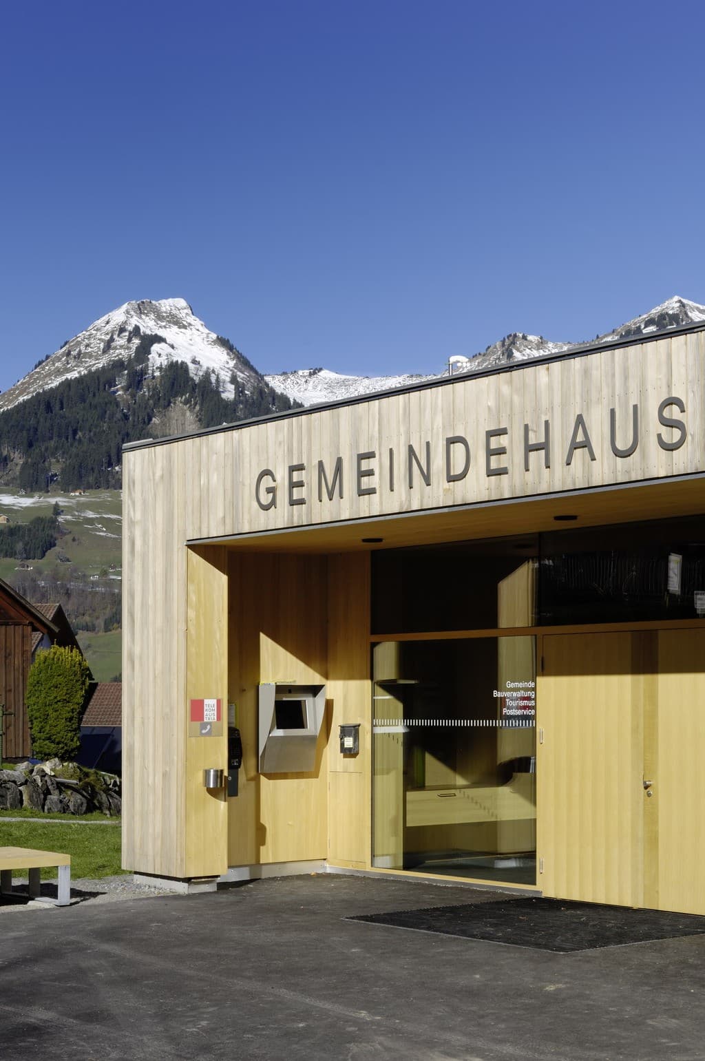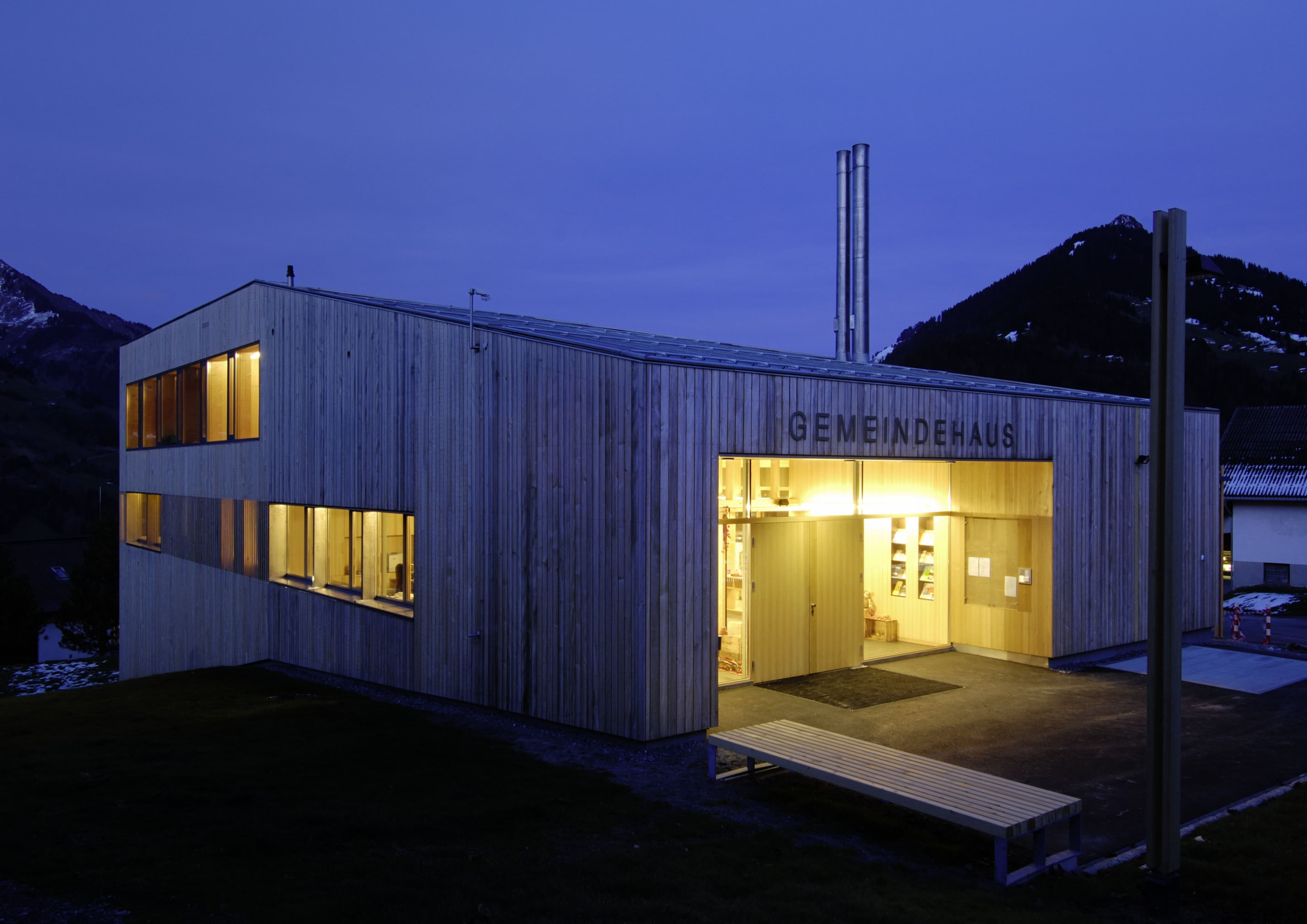 Der Neubau des Gemeindehauses ist zum bestehenden Dorfplatz hin situiert und ergänzt das bestehende Ensemble mit Kirche, Schulhaus und Gasthof. Um die Aussicht vom Kirchplatz taleinwärts möglichst wenig zu beeinträchtigen, wurde an der Straße ein eingeschossiger, nach Norden ansteigender Baukörper situiert. Die Dachform entwickelt sich aus der räumlichen Situation mit dem aufgesetzten Sitzungssaal, der Zuschnitt erzeugt spannende, großzügige Raumsituationen. Das neue Gebäude umfasst Untergeschoss, Erdgeschoss und ein Obergeschoss.