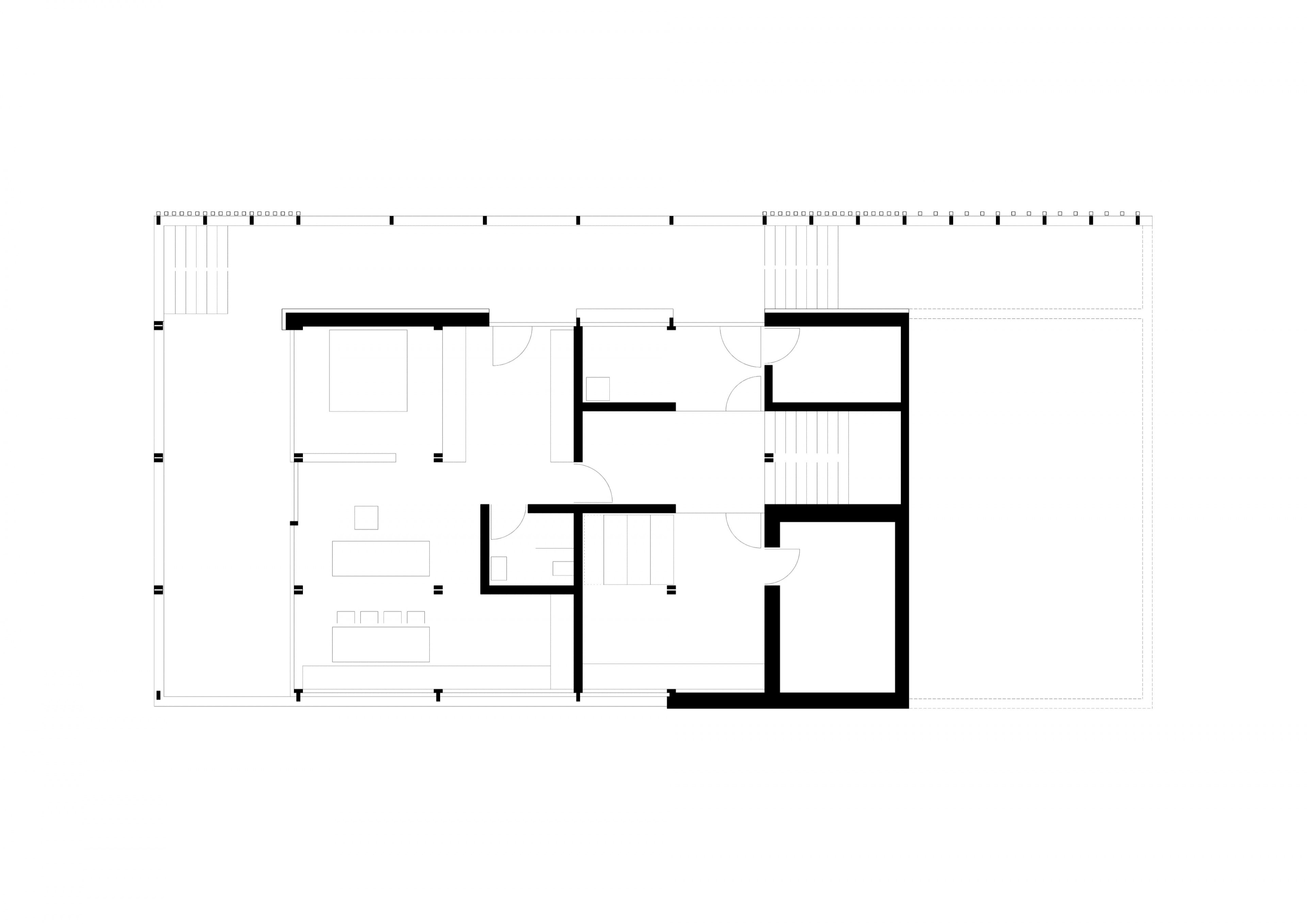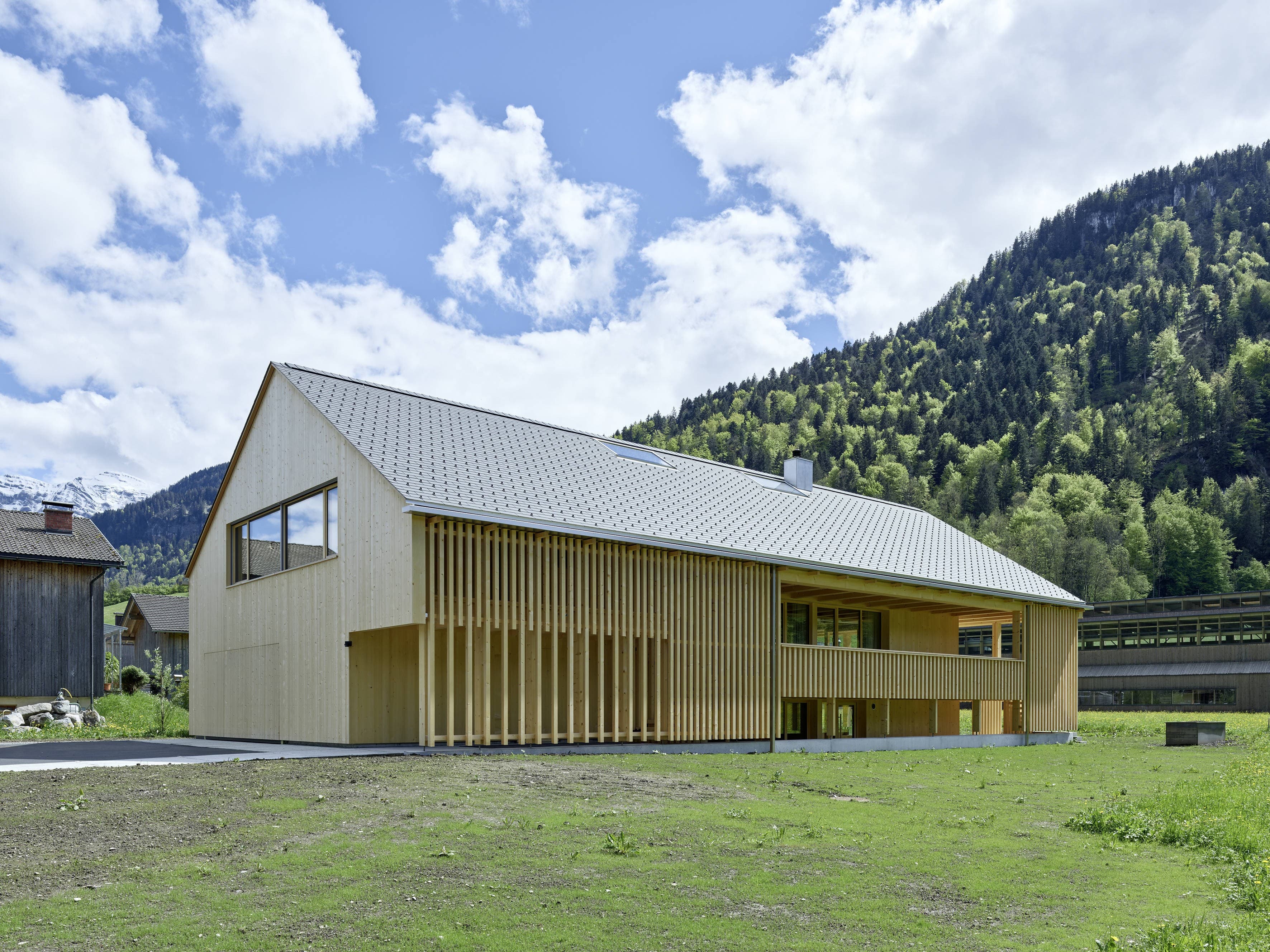 Ursprünglich sollte ein klassisches EFH entstehen, im Laufe der Planung entwickelte sich daraus ein flexibel nutzbares Gebäude mit mehreren Wohneinheiten. Eher zufällig ergaben sich viele Ähnlichkeiten zu der traditionellen Bautypologie eines Bregenzerwälder Hauses. Proportion und Größe sind vergleichbar. Auch das UG ist wie beim traditionellen Wälderhaus nur halb im Erdreich eingebettet, um eine natürliche Belichtung zu ermöglichen. Auch die Traufhöhe von 5 m mit einem vorgelagerten "Schopf" ergeben den Übergang zwischen Freiraum und Gebäude, wie beim traditionellen Bautypus. Und die Erschließung erfolgt über eine Mittelerschließung ergänzt durch ein "Hinterhaus" mit Garage und Mitarbeiterwohnung sind vergleichbar.