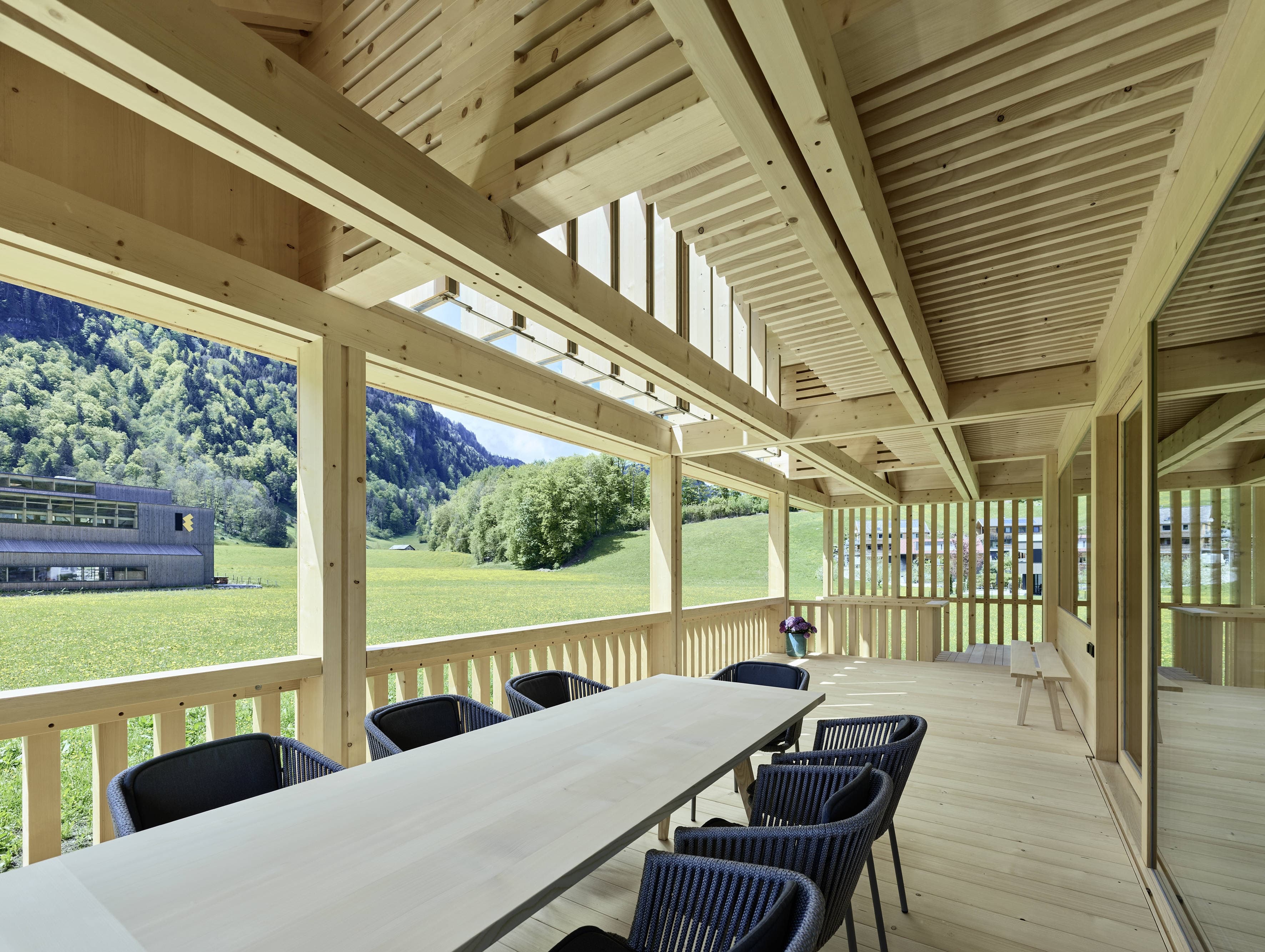 Das Holz, aus nordseitig am Hang gewachsenen Fichten, wurde mit nur ganz wenigen Querschnitten eingeschnitten. Das beste Holz wurde für die sichtbaren Balkenquerschnitte und Dielen verwendet. Aus dem Rest machte man Diagonalschalungen, Lattungen etc. Jeder Kubikzentimeter des Baumes fand seine Anwendung. Mit Ausnahme ganz weniger Dreischichtplatten, wurde alles leimfrei konstruiert. Beim Holz für die Tischlermöbel im Innenraum wurde ergänzend zur Fichte heimisches Buchenholz verwendet.