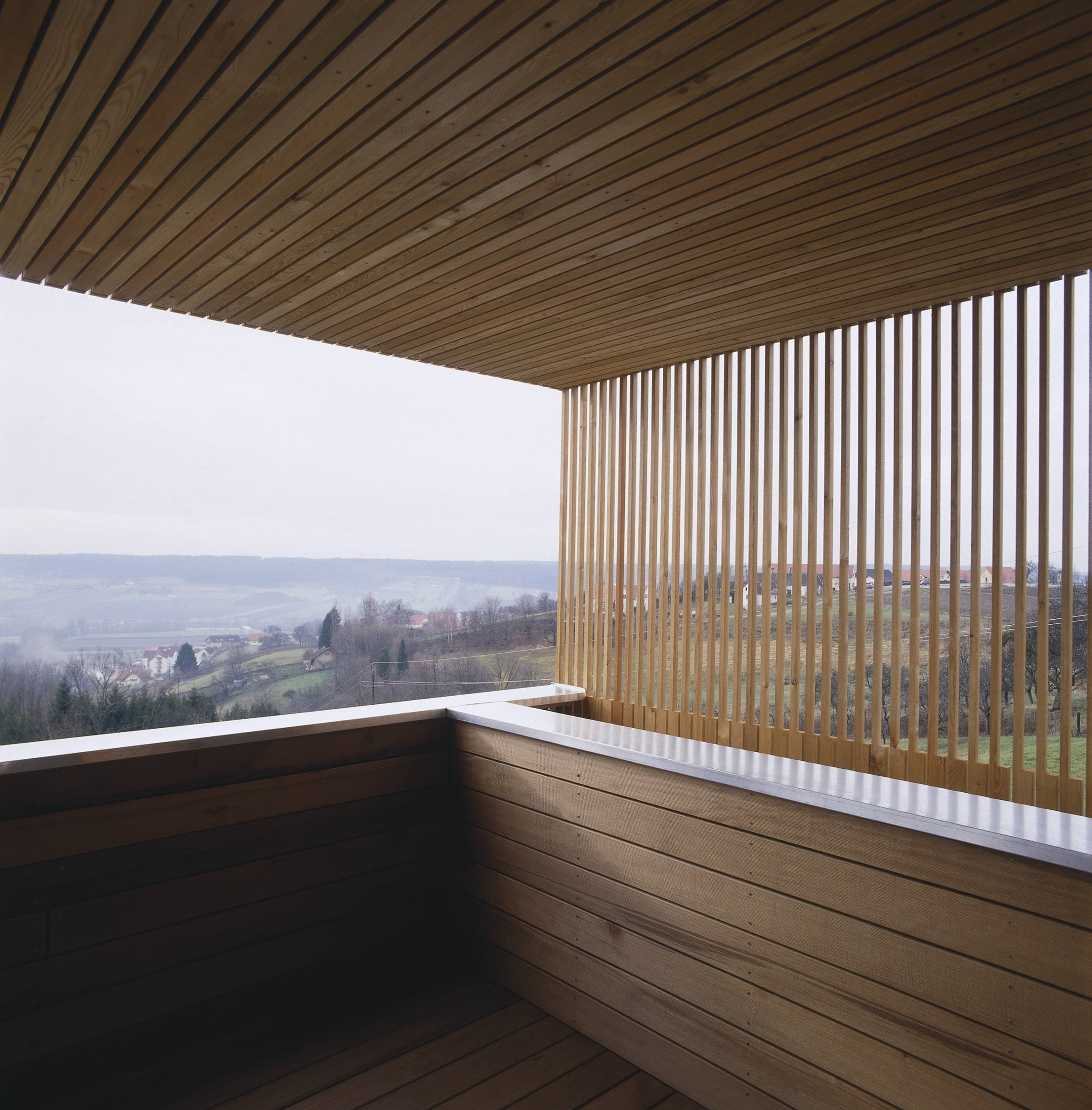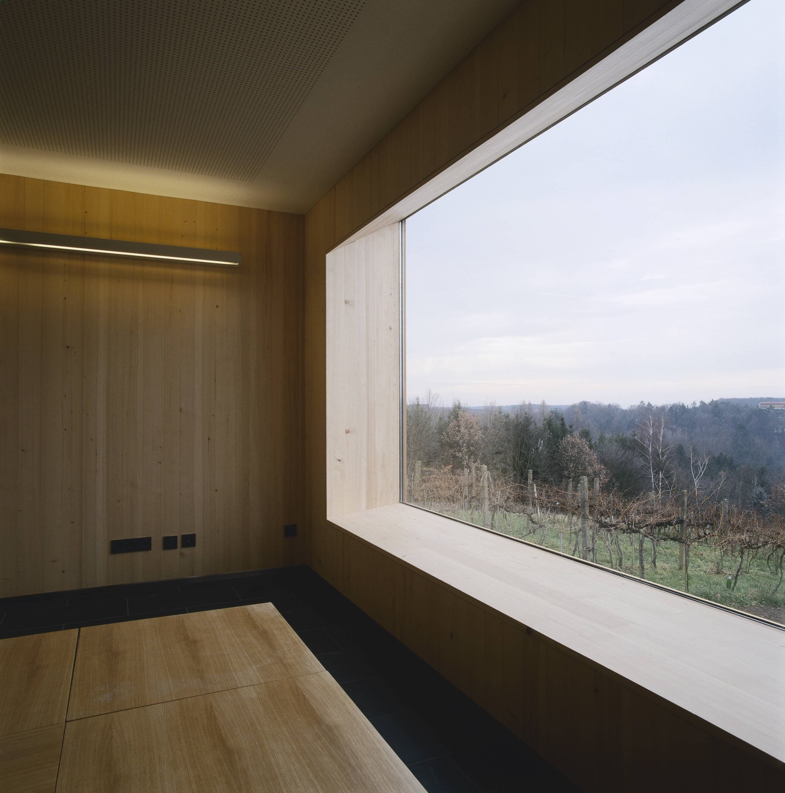 Das Grundstück: ein südlich abfallender, schmaler Streifen in einem Weinberg über Bad Waltersdorf. Die Erschließung erfolgt von Norden über eine schmale Zufahrt, die in den oberen flacher geneigten Bauplatz mündet. Man betritt das dreigeschossige Haus auf der mittleren Ebene, die auf der Südseite weit auskragt, während das in Massivbau errichtete Untergeschoss im rückwärtigen Teil zur Gänze im Hang sitzt und sich Richtung Pool und Talgrund öffnet. Das Obergeschoss, ebenso wie das Erdgeschoss in Holzbauweise ausgeführt, besitzt eine integrierte Terrasse, die sich ebenfalls über die gesamte Südseite erstreckt. Die Grundrisse sind durch einen mittigen Erschließungsstreifen gedrittelt, der eine funktionale Absonderung einzelner Funktionsbereiche ermöglicht. Die Sekundärbereiche sind in den nördlichen Teilen des Hauses untergebracht, Wellness und Wohnen dehnen sich nach Süden aus.