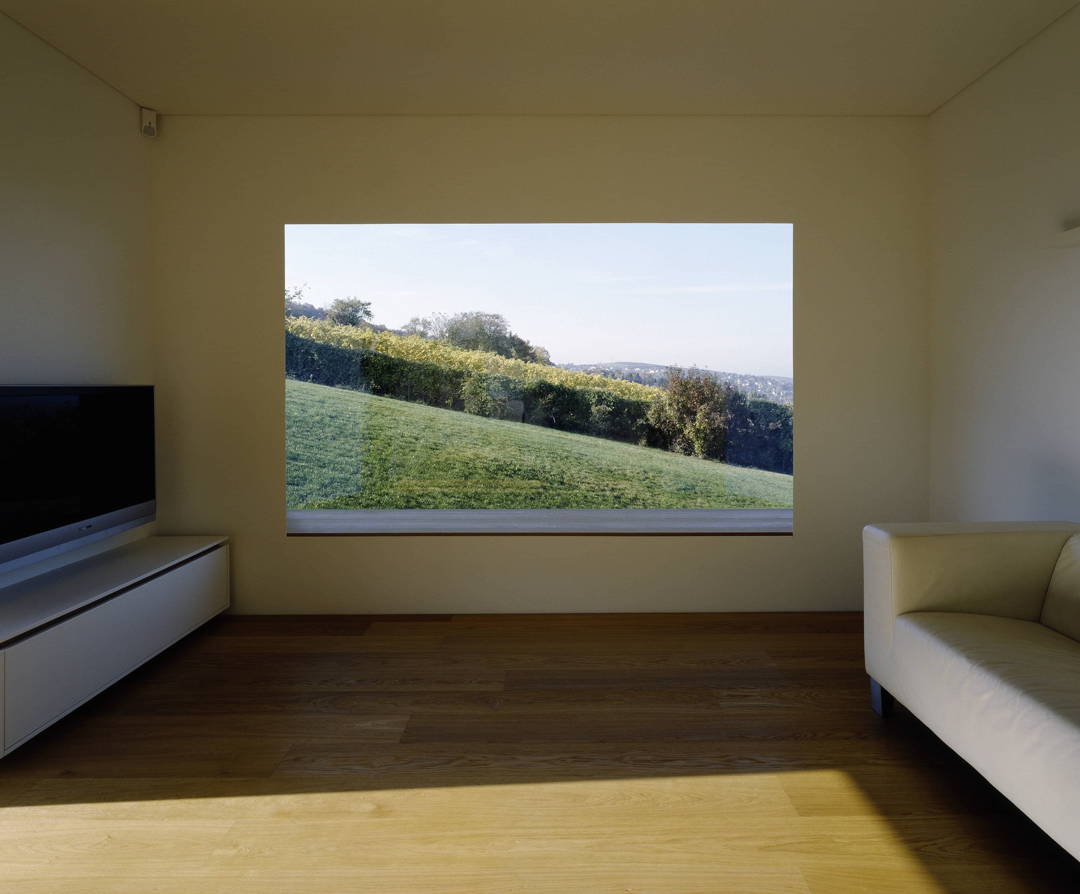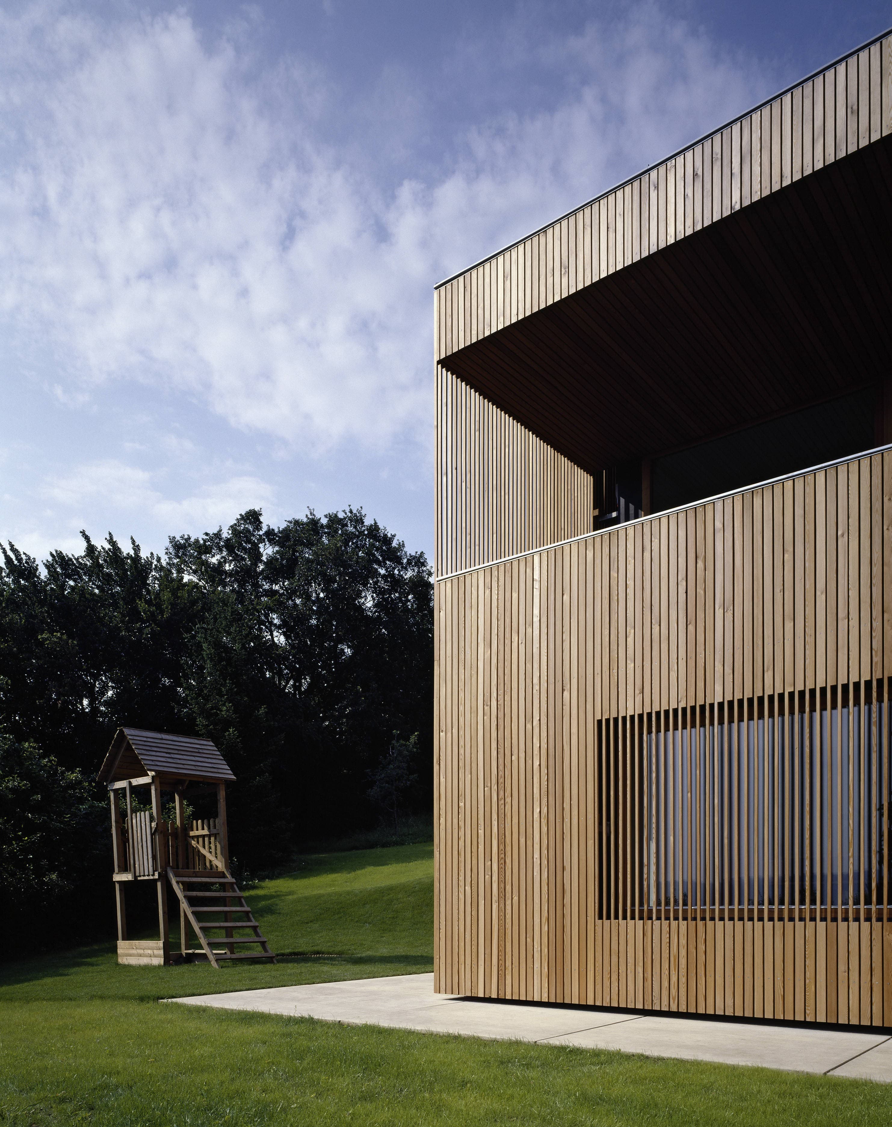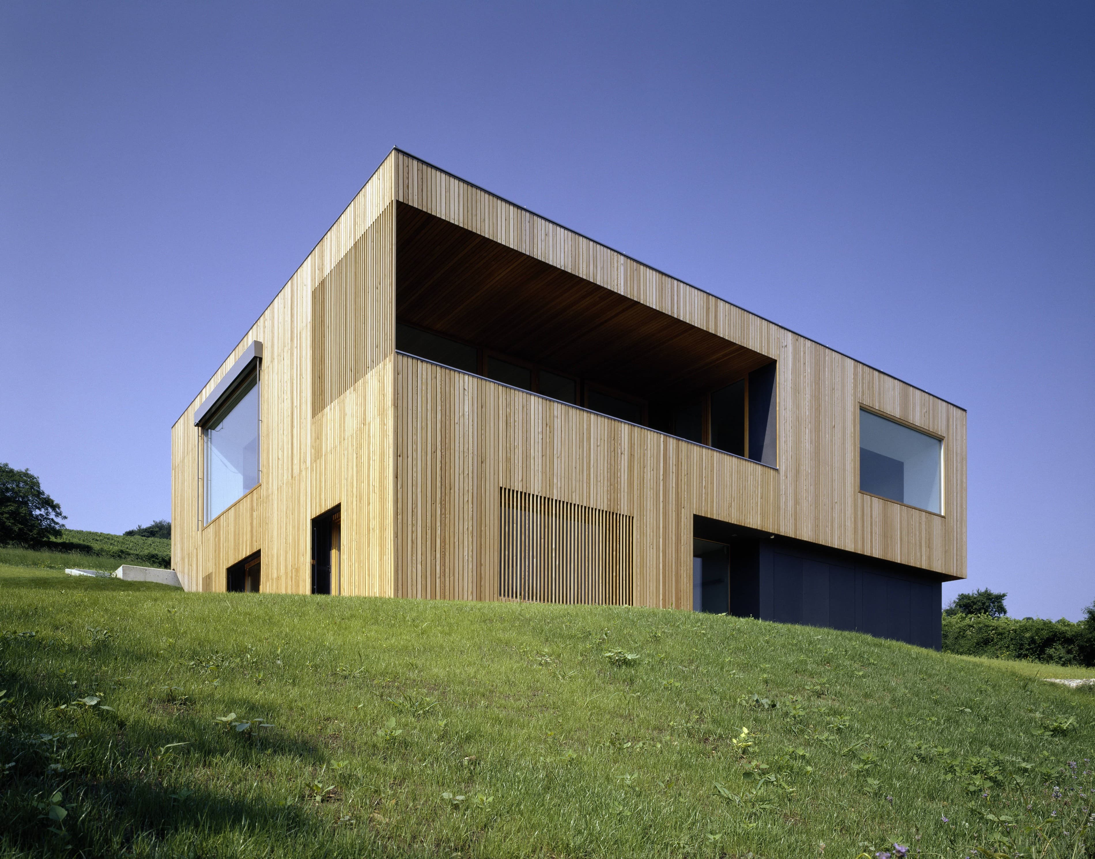 Sanft, aber massiv in den nordseitigen Hang gegraben, erhebt sich das Obergeschoss in Holz über die Weinberge von Niederösterreich. Die Terrassen und der Pool lassen den Wohnraum mit der Landschaft verschmelzen. Schlicht und echt die Materialisierung, sowohl im Hanggeschoss mit Eingang, Kinderzimmern und Nebenräumen, als auch im Obergeschoss mit Aufenthaltsräumen der Bauherren.