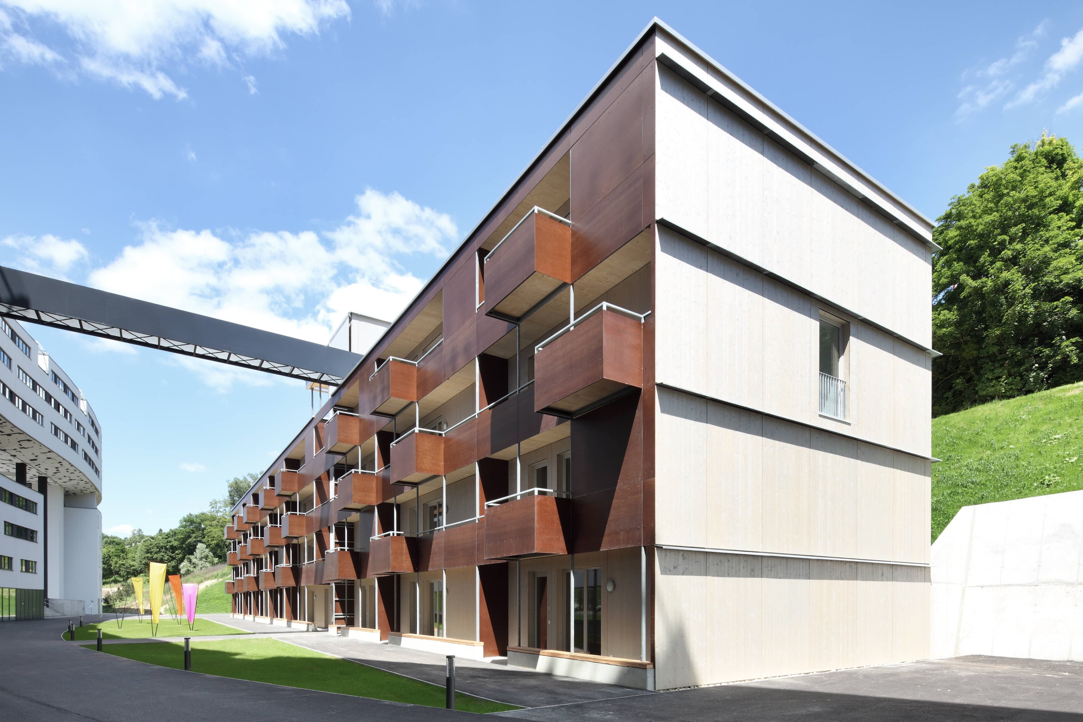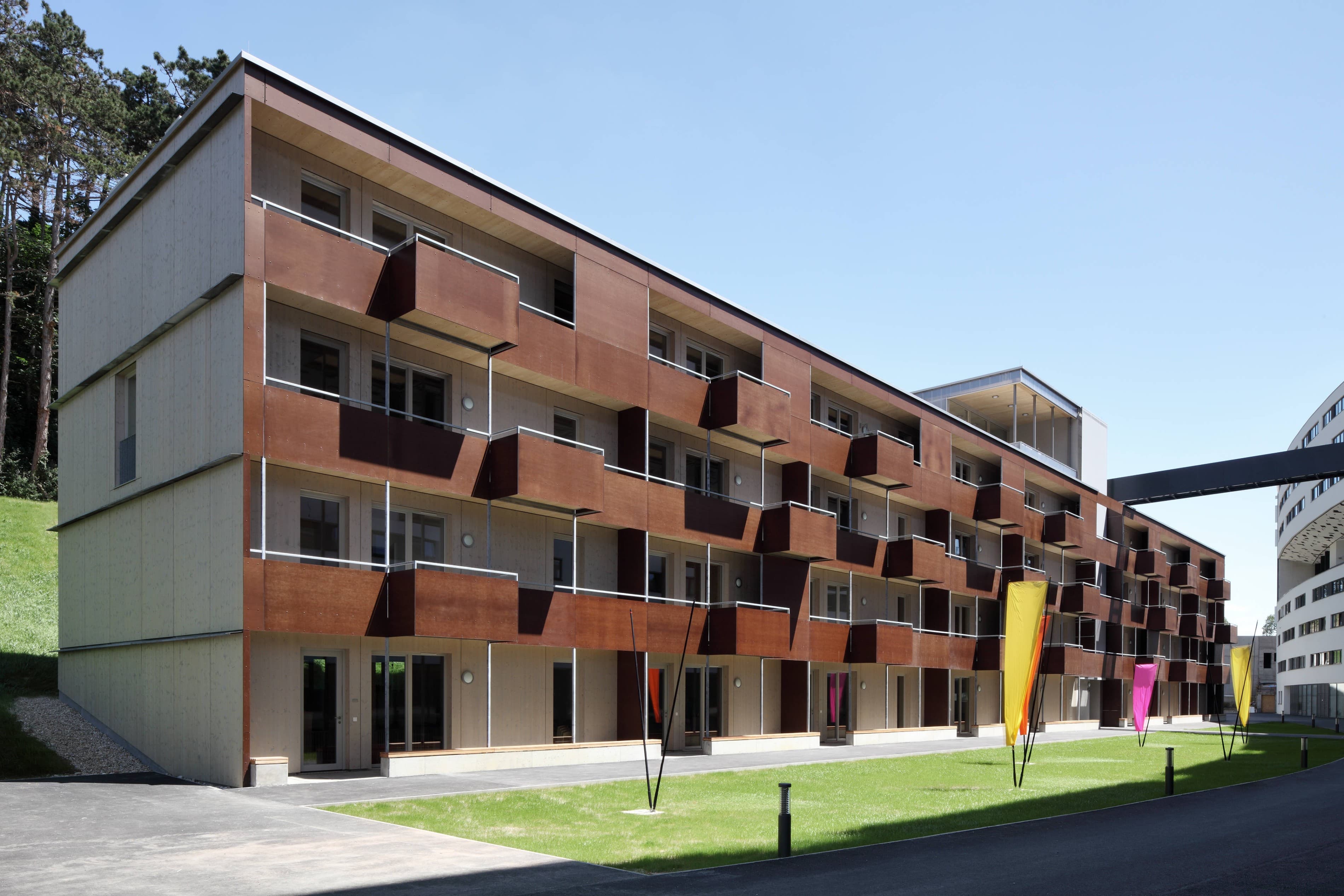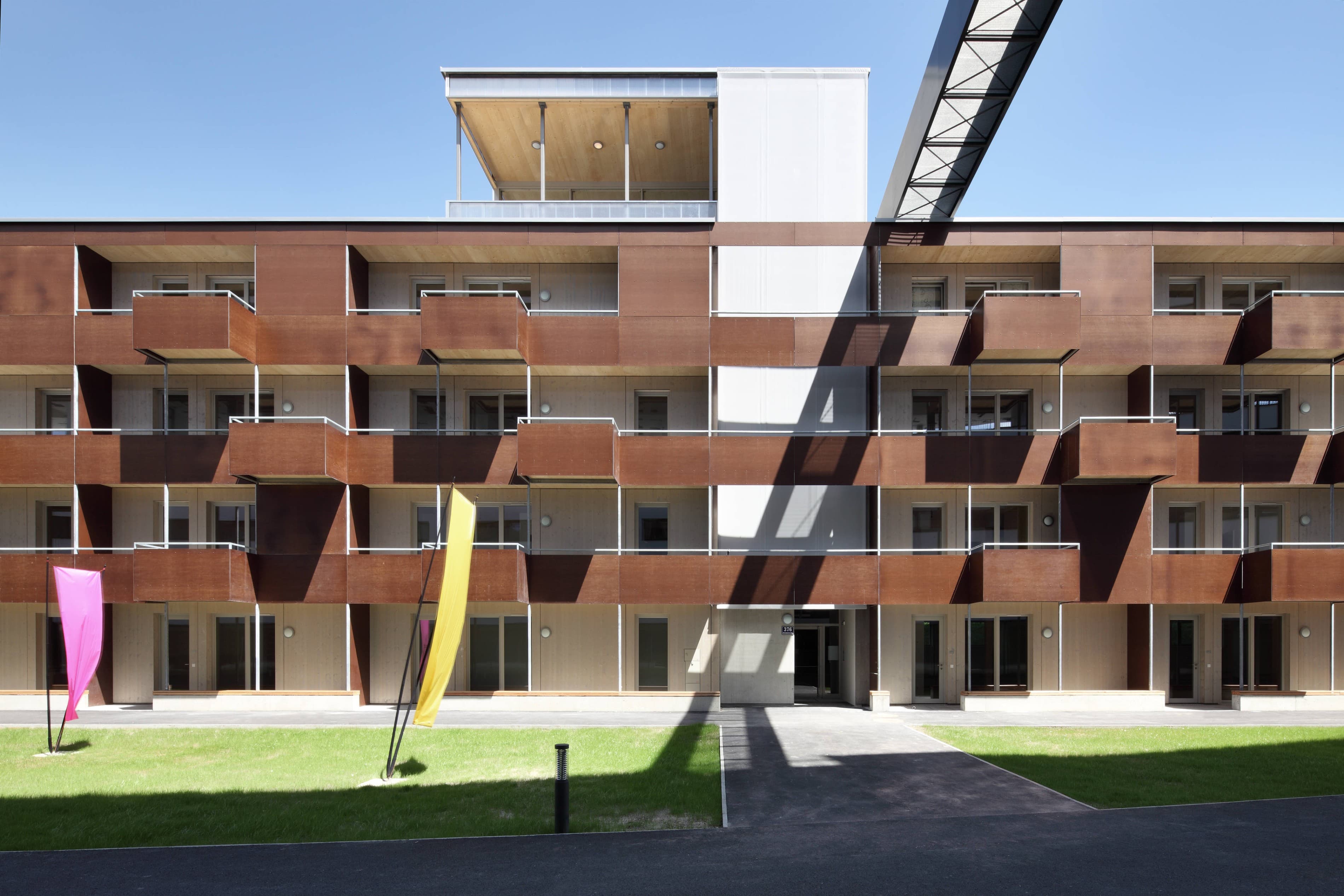 Ein viergeschossiges Kulturregal in moderner und ökologischer Holzfertigteilbauweise für Atelier- und Ausstellungsnutzung für Künstler und Freiberufler sowie für soziale Nutzungen. Das Gebäude wird viergeschossig vollständig in Holzbauweise errichtet. Dies ist erst seit Einführung der neuen Wr. Bautechnikverordnung und den OIB-Richtlinien möglich und stellt somit ein Pionierprojekt dar. Ein Holzskelettsystem übernimmt alle statischen Funktionen und gewährleistet hohe Flexibilität. Die einzelnen Einheiten können so direkt auf Nutzerwünsche abgestimmt werden. Die Errichtung der Außenwände erfolgt mit hochgedämmten Holzwandelementen welche den Niedrigenergiestandard gewährleisten. Das Holz bleibt auch im Inneren durch Holzsichtdecken und Holzstützen für die Nutzer erlebbar und trägt zu einer natürlichen und ökologischen Atmosphäre bei.