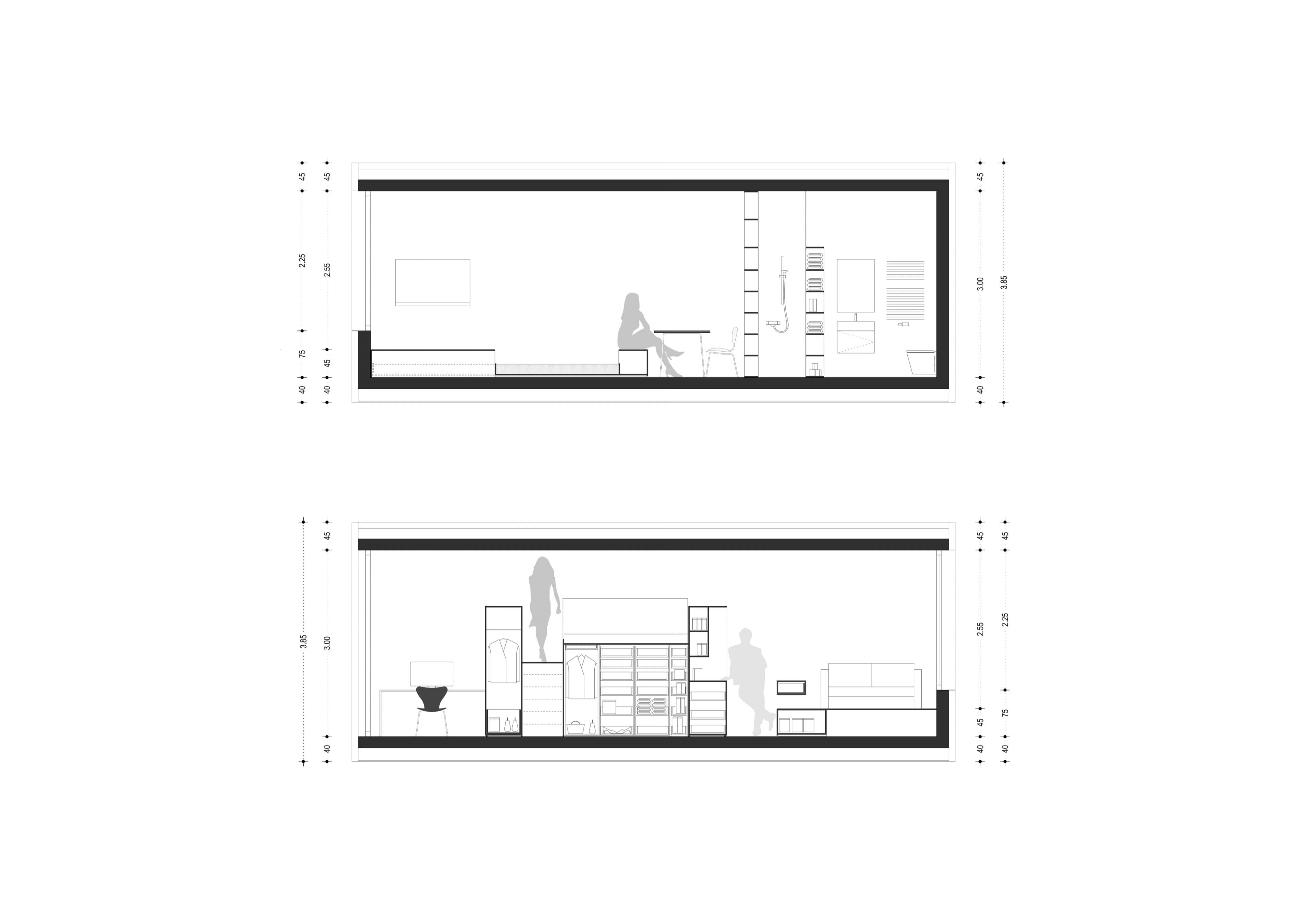 Das K33 ist eine in sich geschlossene Wohneinheit, welche den Ansatz hat, auf möglichst wenig Grundfläche, möglichst viel Nutzungen zu ermöglichen, ohne dafür auch nur im Geringsten auf Komfort zu verzichten. Das Wohnen, wie wir es gewohnt sind, soll ohne verschieben oder umbauen von Einrichtungen funktionieren. Ein Sofa bleibt Sofa und wird nicht zum Bett umgebaut. Ein Esstisch bleibt Esstisch und muss nicht noch Arbeitsplatz sein. Unter der Treppe ist eine Waschmaschine verstaut, aufhängen kann man die Wäsche an einer im Schrank eingebauten Wäscheleinenlade. Bis zu 4 Personen können übernachten, was speziell bei Patchworkfamilien oft notwendig und angenehm ist – und trotzdem hat jeder seinen Bereich. Das alles würde auf 33 m² nicht funktionieren, wenn nicht die dritte Dimension, die Höhe auch ausgenutzt wird. Der Innenraum mit einer lichten Raumhöhe von 3 m ist notwendig für Nutzungen und vermittelt überdies einen großzügigen Raumeindruck – man hat nie das Gefühl von Enge oder Platznot. Dies auch deswegen, weil auch jede nur so kleine Ecke für geschlossenen Stauraum für Schi, Koffer, Winterkleidung, Staubehältnisse, und alles was man so braucht ausgenutzt werden kann.