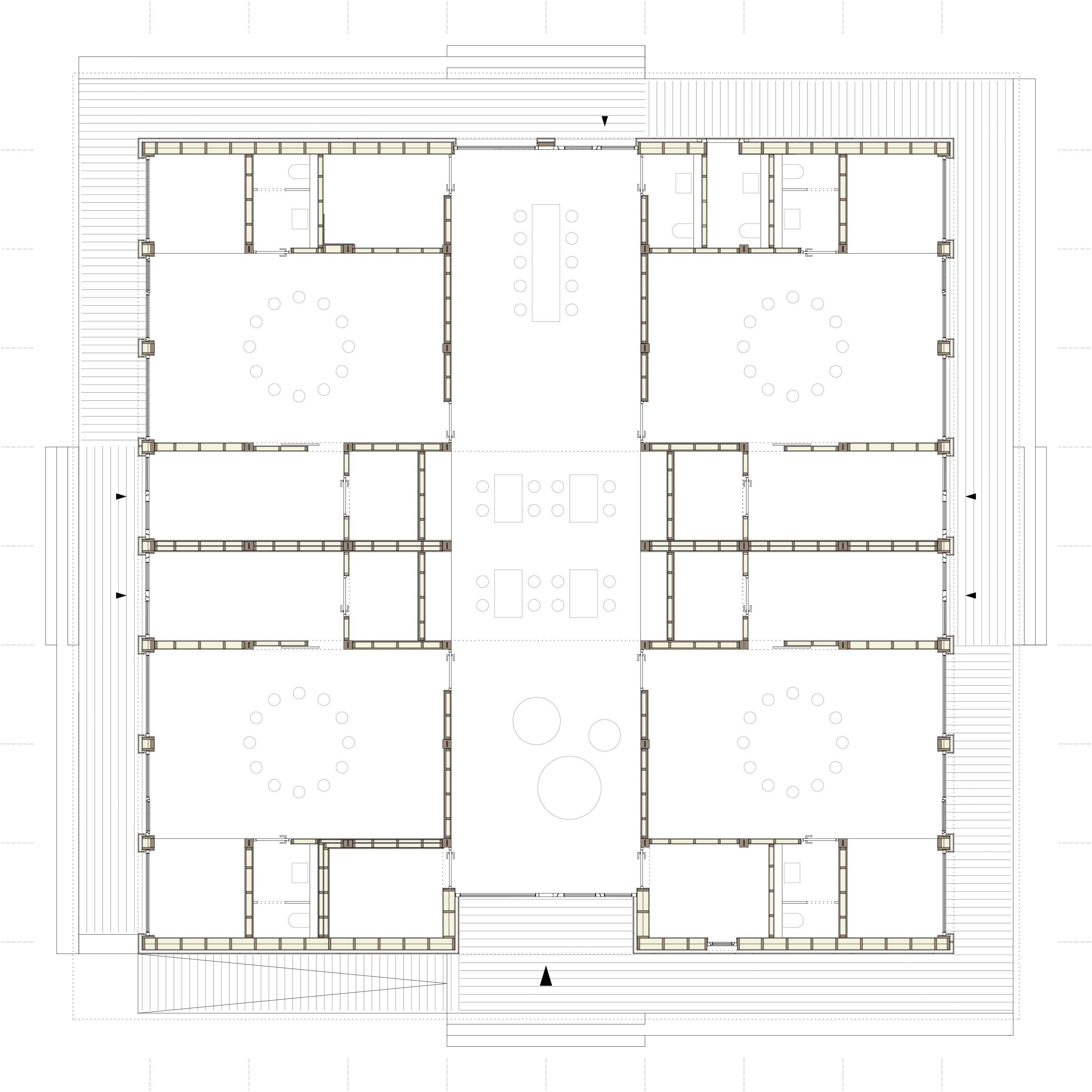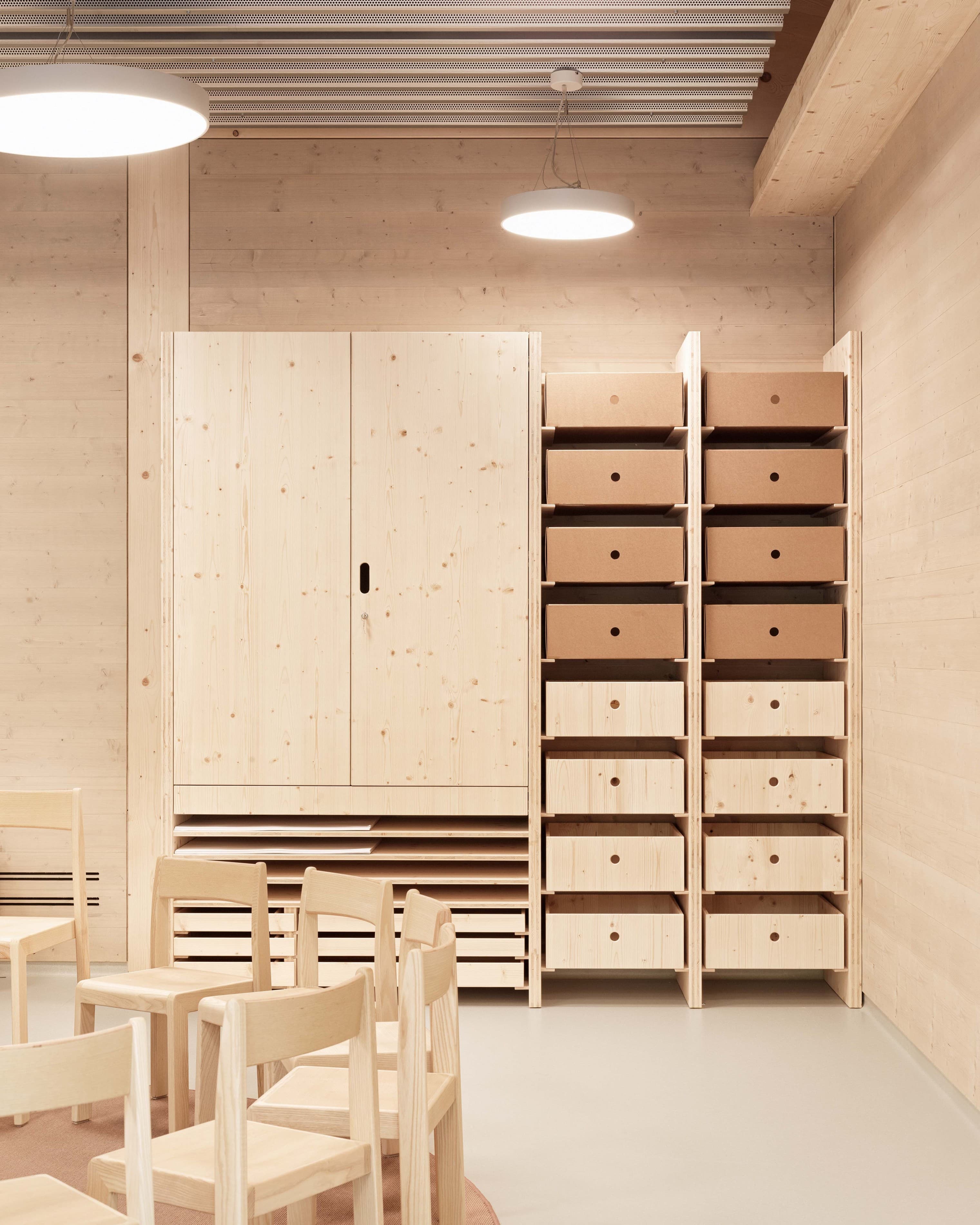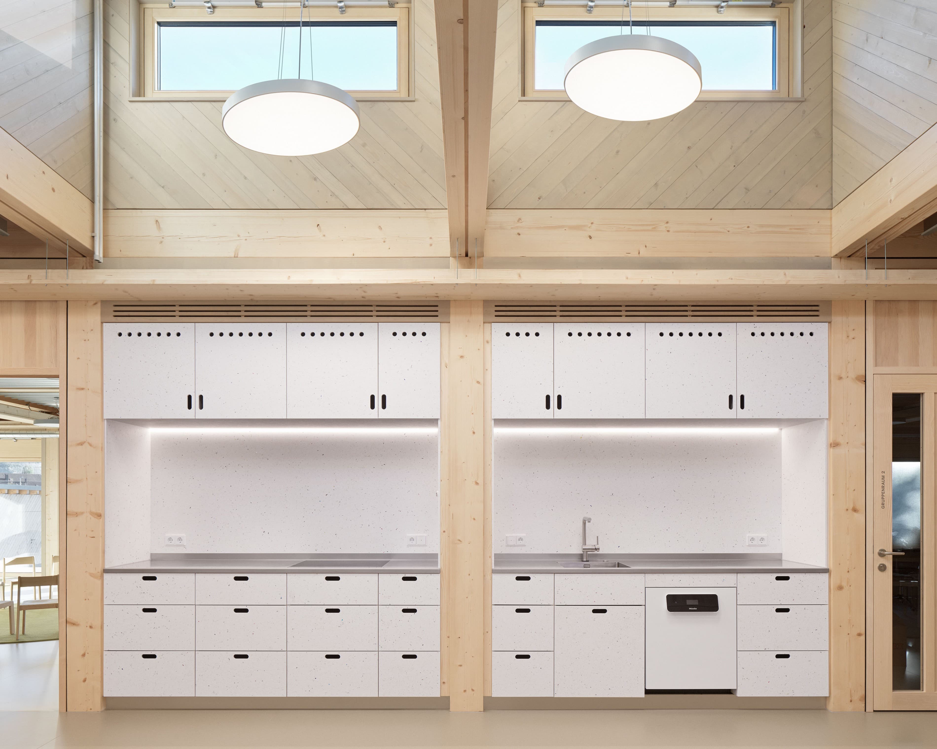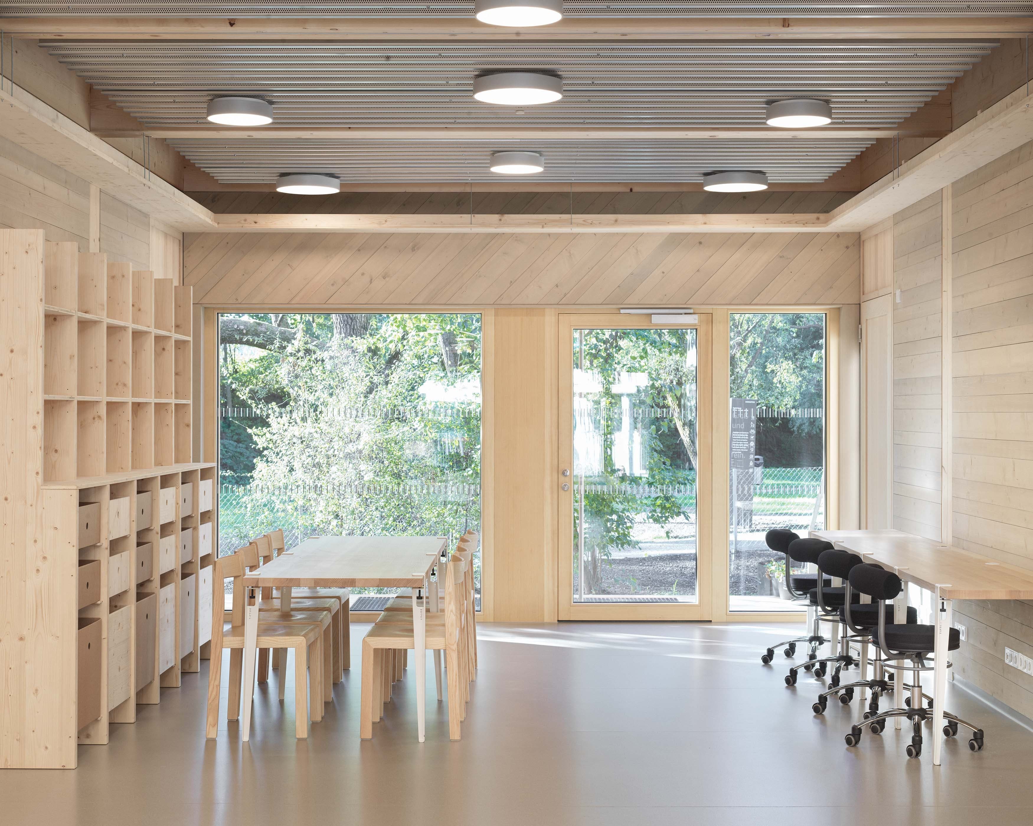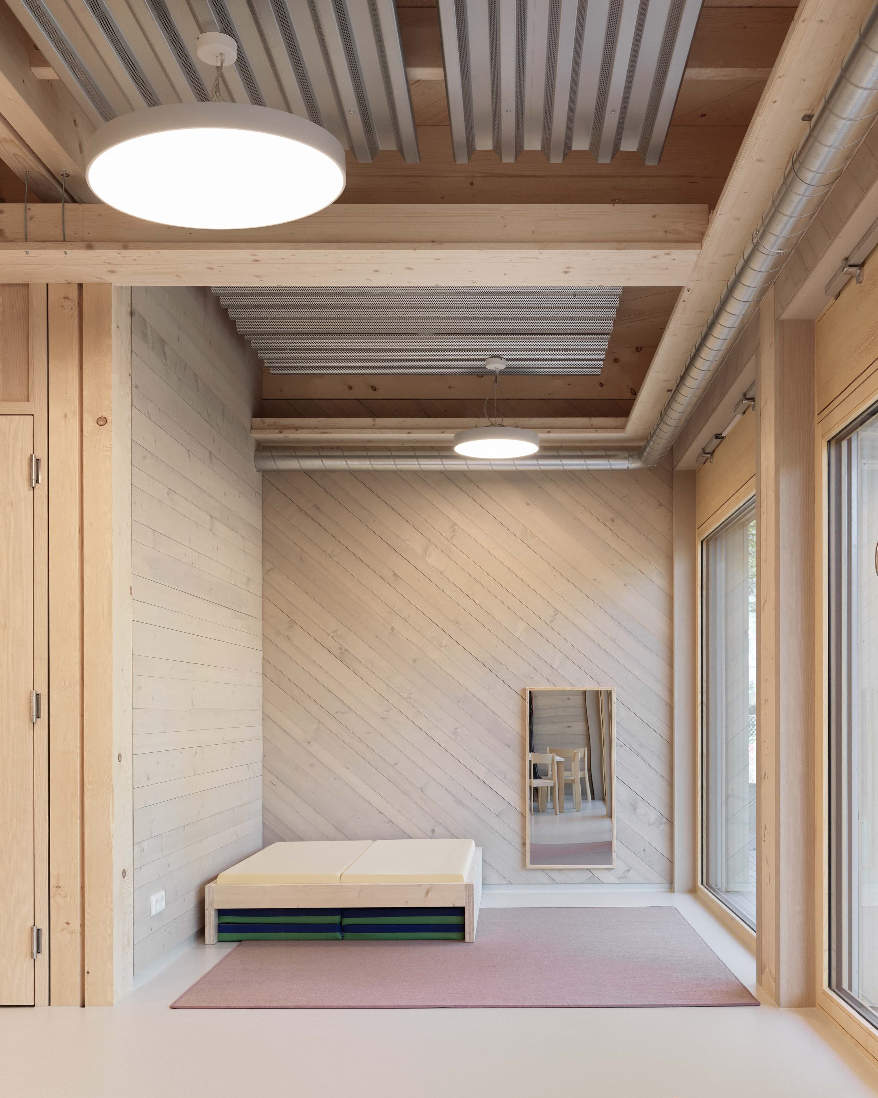 Da beim Entwurf des Kindergartens schon großer Wert auf die Ausschöpfung ökologischer Potentiale gelegt wurde, konnten viele Details dementsprechend realisiert werden. Dabei steht allem Voran die Nutzung von heimischem Holz in allen Bereichen wie Konstruktion, Beplankungen und Einbauten. Es kamen fast ausschließlich vorelementierte Holzbauelemente aus Vollholzquerschnitten zum Einsatz. Aufgrund dieser Konstruktionsmethode konnte die gesamte Bauzeit auf fünf Monate reduziert werden. Alle konstruktiven Verbindungen sind unverklebt und somit zerlegbar. Auch der vorherige Bestandsbau konnte zum Teil wiederverwendet werden. Die rund 30 Jahre alte Stahlbeton-Bodenplatte konnte als Punktfundierung für die umlaufende Veranda einen neuen Nutzen finden. Des Weiteren wurde beim Einsatz sämtlicher Metalle auf eine zusätzliche Beschichtung verzichtet. Die offene Leitungsführung für die Ringleitungen von Elektro, Heizung und Sanitär sind einerseits im Betrieb für eine eventuelle Wartung leicht zugänglich und ermöglichen zudem einen einfachen Rückbau.