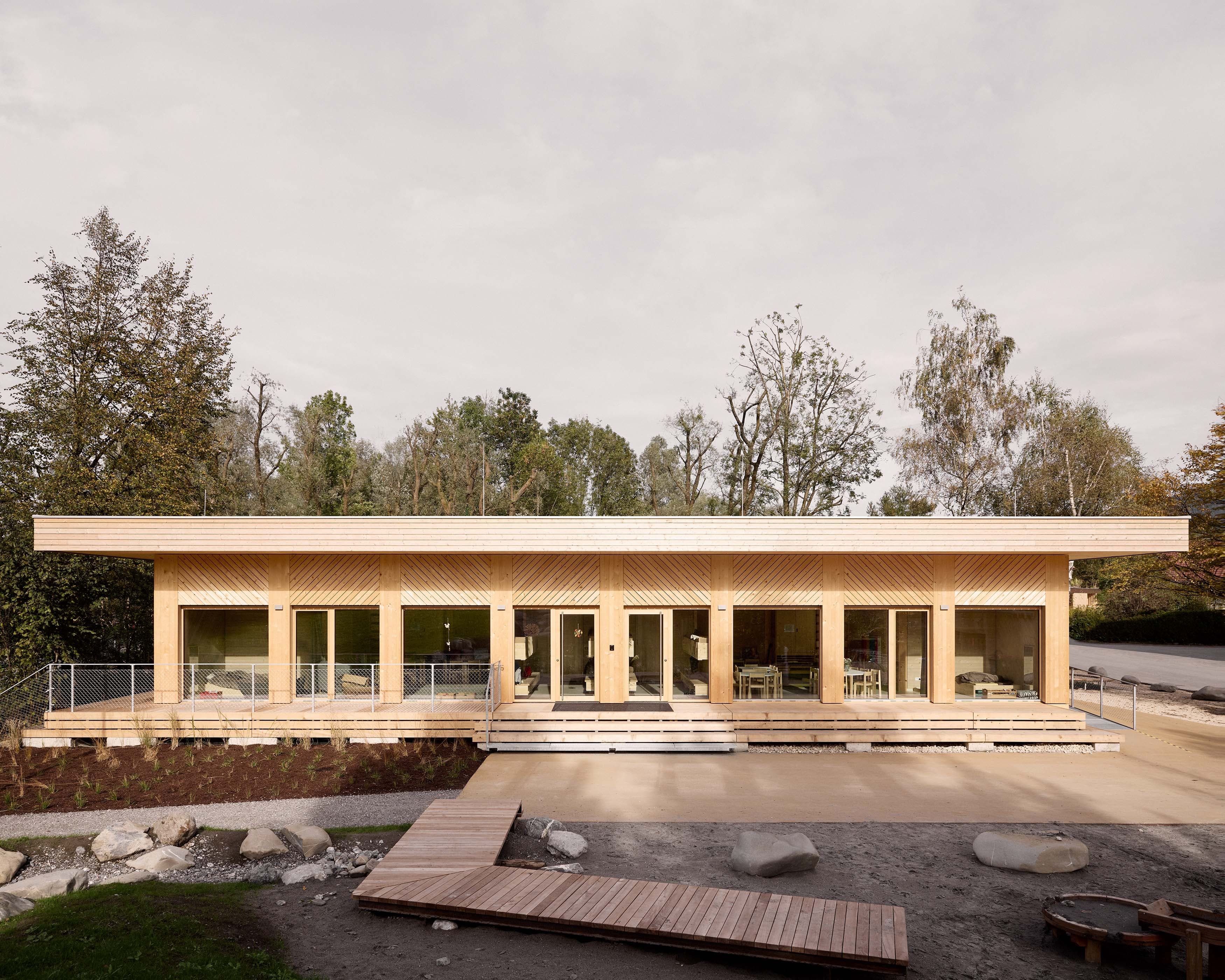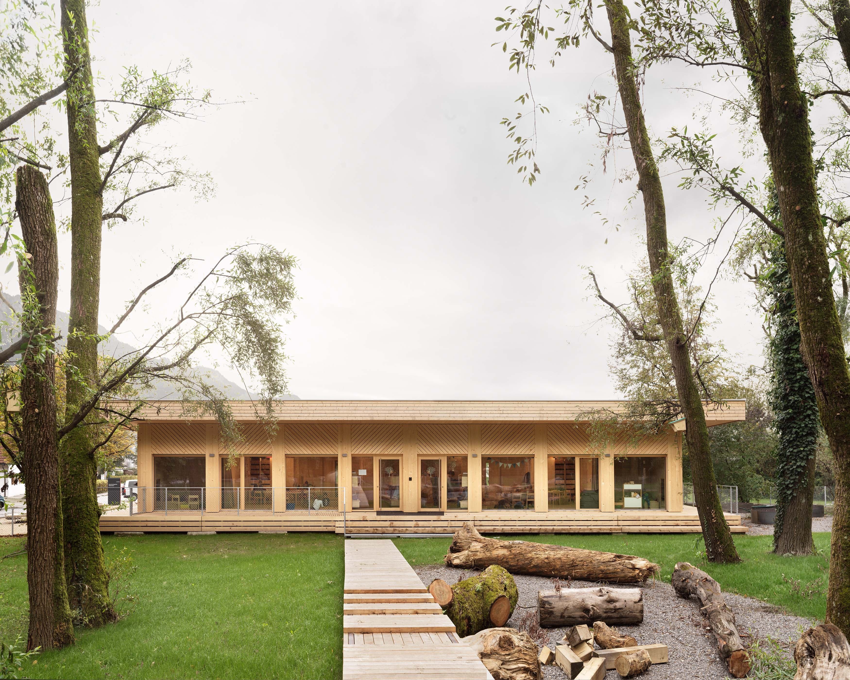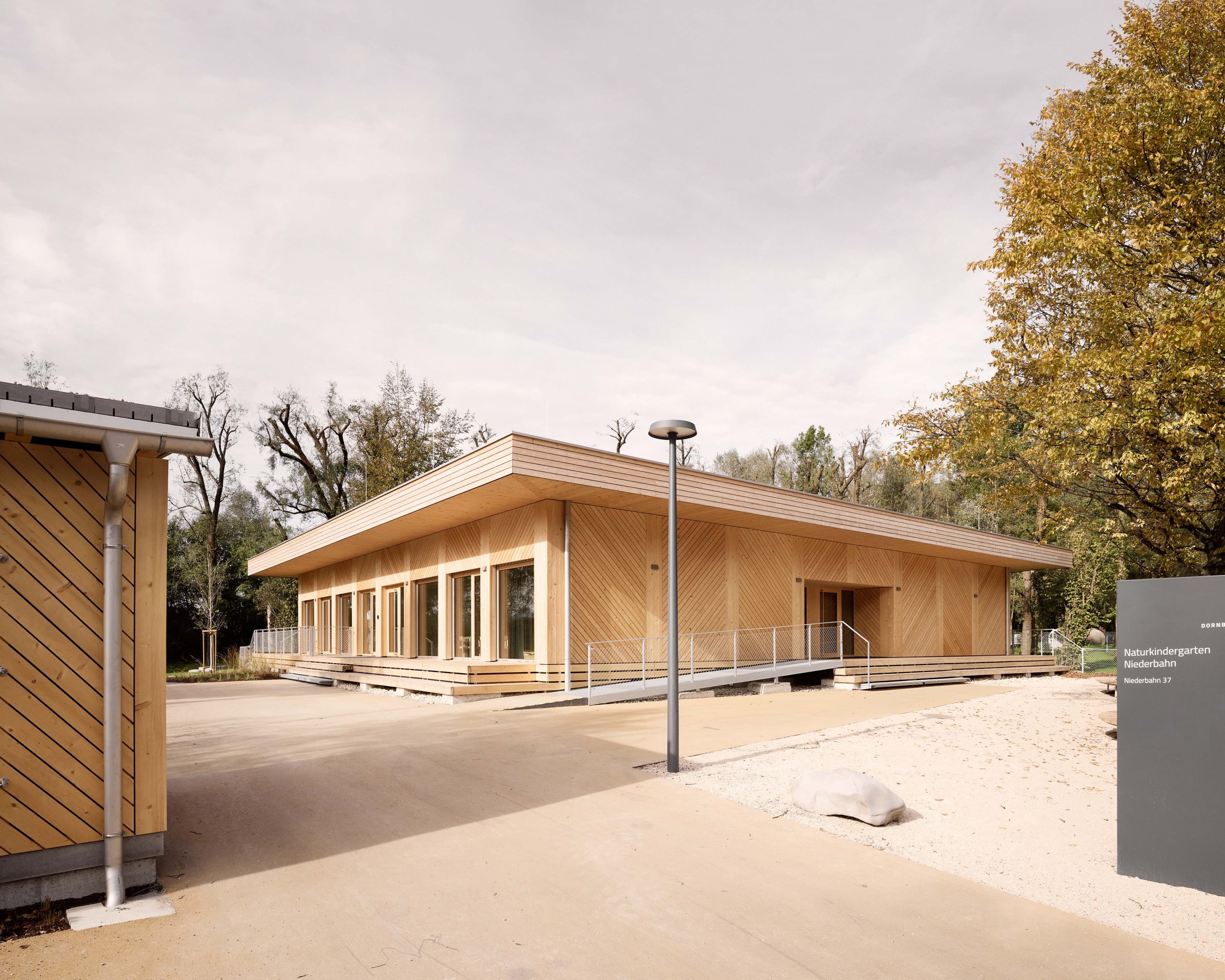 Im Ortsgebiet Niederbahn der Stadt Dornbirn wurde ein Naturkindergarten in Form eines eingeschossigen Pavillons in Holzbauweise errichtet. Das pädagogische Konzept sieht vor, dass die Kinder möglichst viel Zeit draußen verbringen. Aufgrund dieser Regelung, konnten 60 Prozent der Fläche gegenüber einem herkömmlichen Kindergarten eingespart werden. Aufbauend auf diesem Konzept wurde der Kindergarten mit einer umlaufenden, überdachten Zone angelegt, über die jede Gruppe autark von außen erschlossen wird. Im Inneren sind alle vier Kindergartengruppen um den zentralen Multifunktionsraum herum angelegt. Die klare Konstruktion in einem 2,5 m x 2,5 m Raster schafft die Grundlage für eine materialsparende Holzkonstruktion, bei der Vollholzquerschnitte einschließlich der Seitenware verwendet werden, um damit die Materialausbeute pro Baumstamm auf ein Maximum zu erhöhen. Generell wurde ein hoher Anspruch an die Nachhaltigkeit des Gebäudes gesetzt. Holz aus dem städtischen Forst, nicht verklebte, sortenreine und dadurch kreislauffähige Konstruktionsdetails sowie ausschließlich schadstofffreie Produkte, sorgen für ein nachhaltiges, emissionsarmes und gesundes Gebäude. Umlaufende, an der Decke angebrachte, offene Versorgungskanäle ermöglichen eine einfache Wartung der verbauten, ebenfalls sichtbaren, Haustechnik.