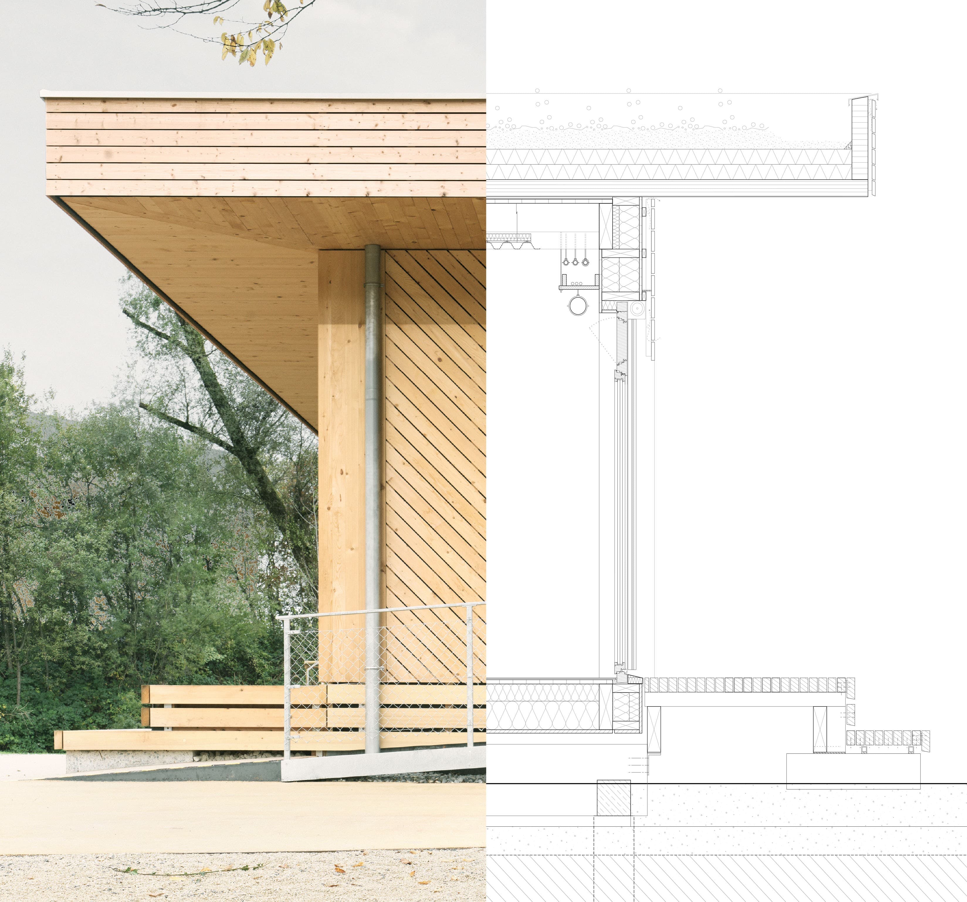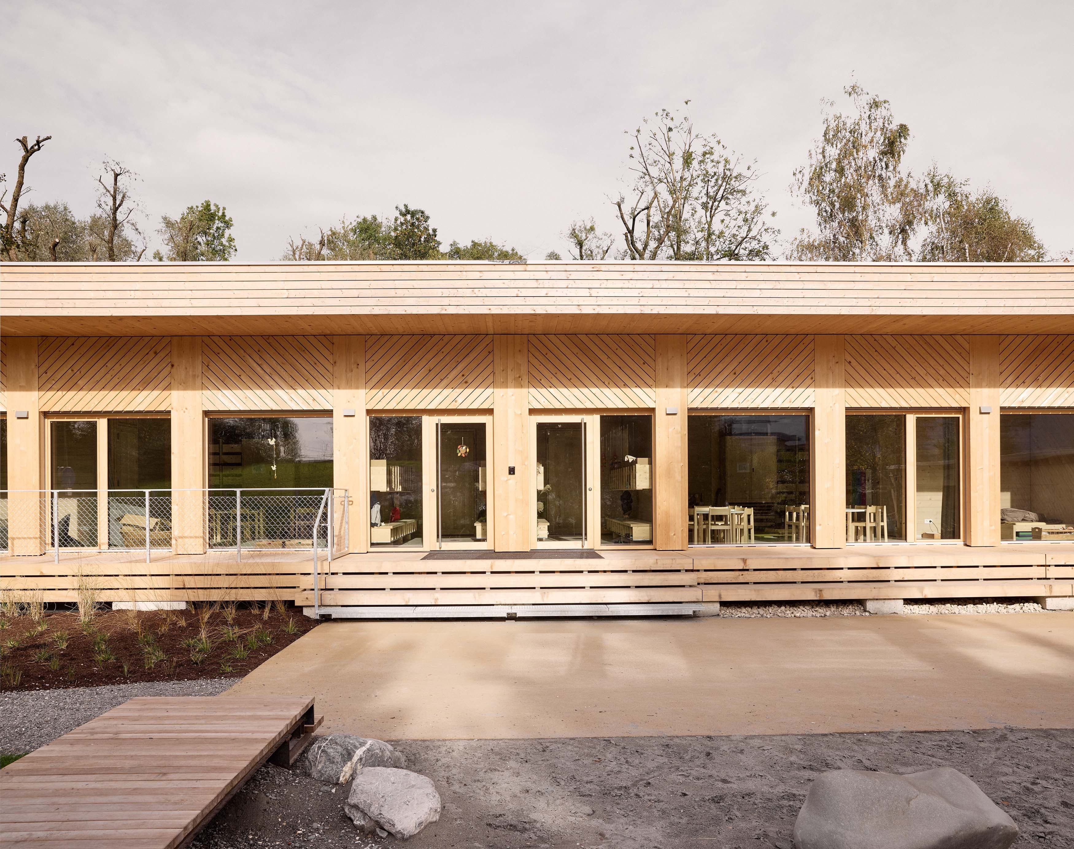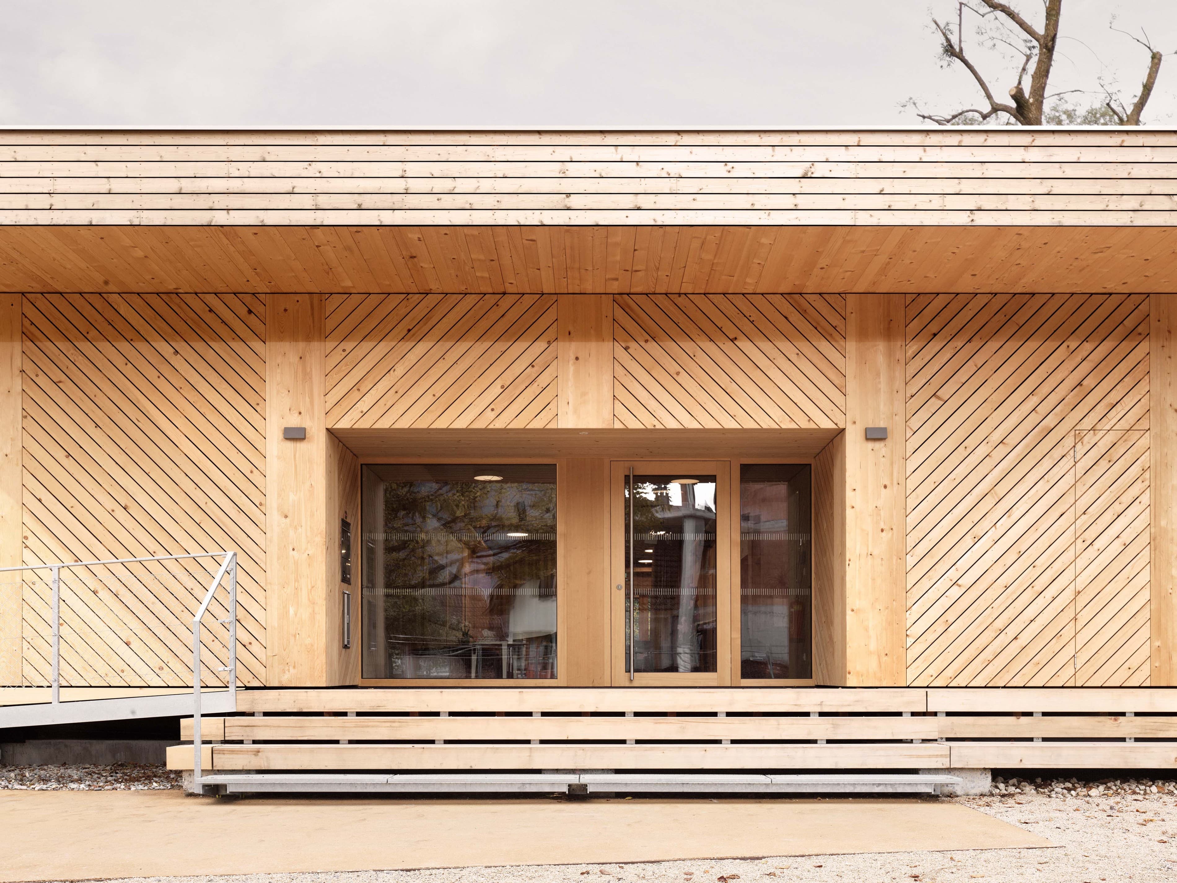 Im Ortsgebiet Niederbahn der Stadt Dornbirn wurde ein Naturkindergarten in Form eines eingeschossigen Pavillons in Holzbauweise errichtet. Das pädagogische Konzept sieht vor, dass die Kinder möglichst viel Zeit draußen verbringen. Aufgrund dieser Regelung, konnten 60 Prozent der Fläche gegenüber einem herkömmlichen Kindergarten eingespart werden. Aufbauend auf diesem Konzept wurde der Kindergarten mit einer umlaufenden, überdachten Zone angelegt, über die jede Gruppe autark von außen erschlossen wird. Im Inneren sind alle vier Kindergartengruppen um den zentralen Multifunktionsraum herum angelegt. Die klare Konstruktion in einem 2,5 m x 2,5 m Raster schafft die Grundlage für eine materialsparende Holzkonstruktion, bei der Vollholzquerschnitte einschließlich der Seitenware verwendet werden, um damit die Materialausbeute pro Baumstamm auf ein Maximum zu erhöhen. Generell wurde ein hoher Anspruch an die Nachhaltigkeit des Gebäudes gesetzt. Holz aus dem städtischen Forst, nicht verklebte, sortenreine und dadurch kreislauffähige Konstruktionsdetails sowie ausschließlich schadstofffreie Produkte, sorgen für ein nachhaltiges, emissionsarmes und gesundes Gebäude. Umlaufende, an der Decke angebrachte, offene Versorgungskanäle ermöglichen eine einfache Wartung der verbauten, ebenfalls sichtbaren, Haustechnik.