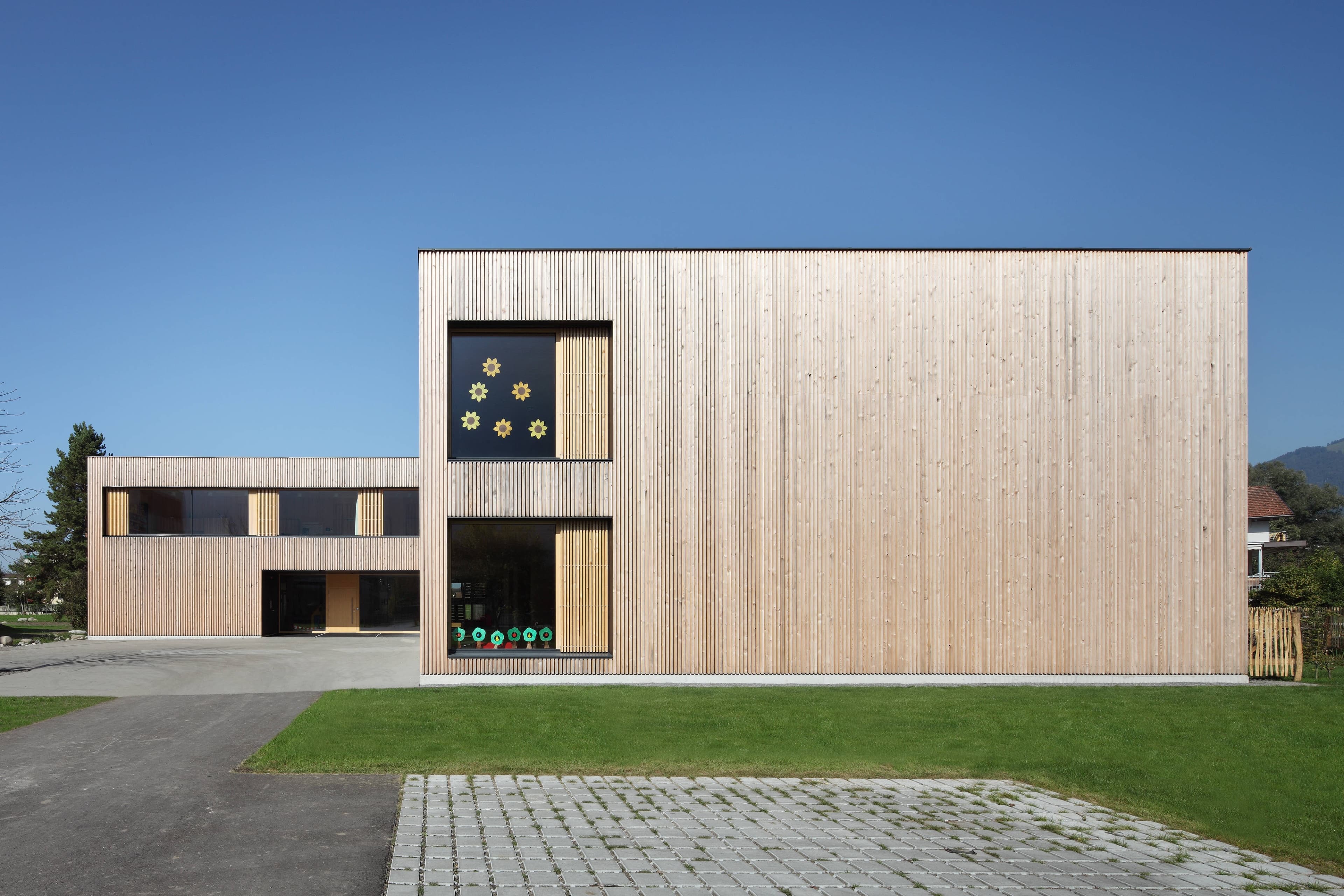 Den zweigeschossigen Kindergarten betritt man über den eingezogenen Eingangsbereich, an dem unmittelbar die vertikale Erschließung angebunden ist. An diesem zentralen Knotenpunkt ist der Gruppentrakt mit dem Allgemeinbereich (Bewegung, Essen, Personal) verbunden.