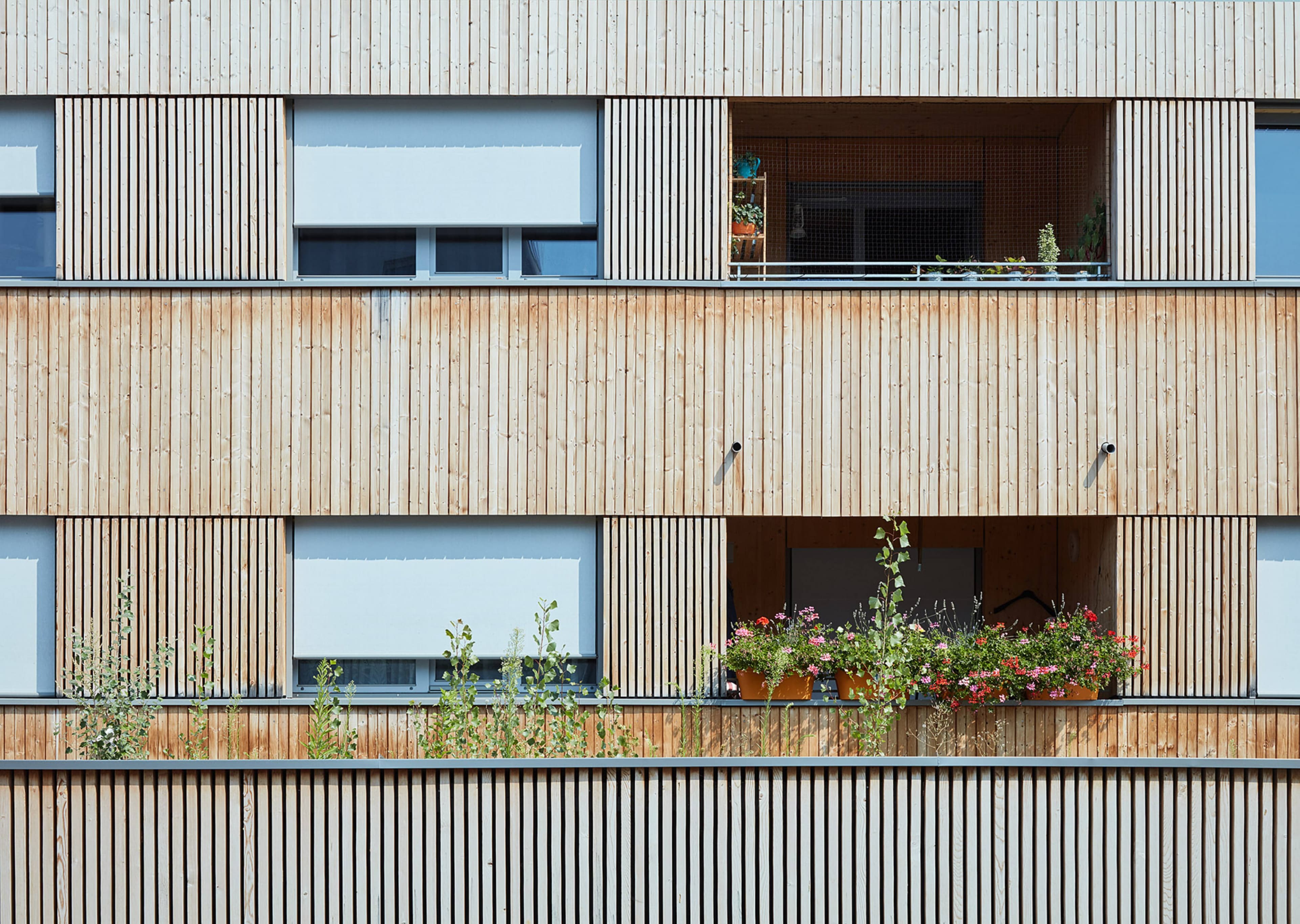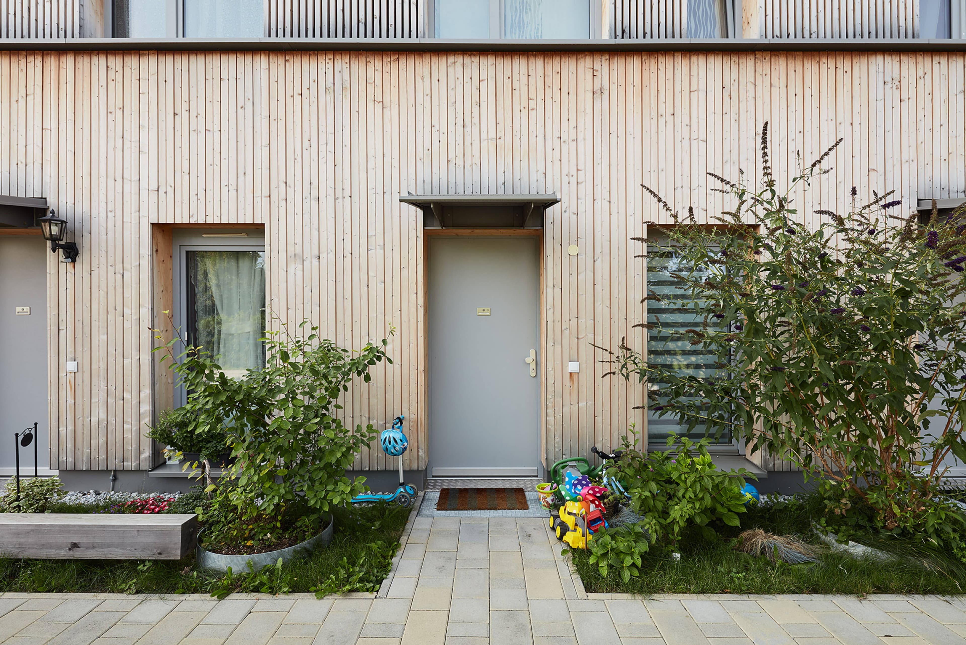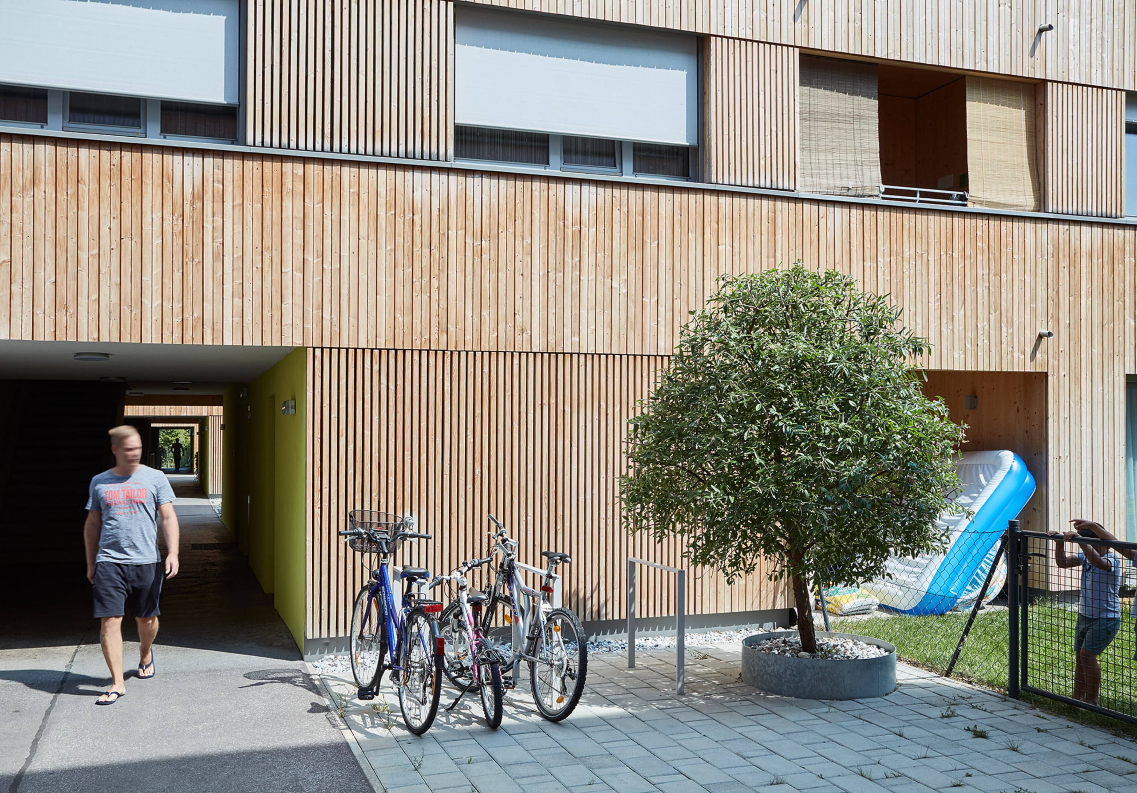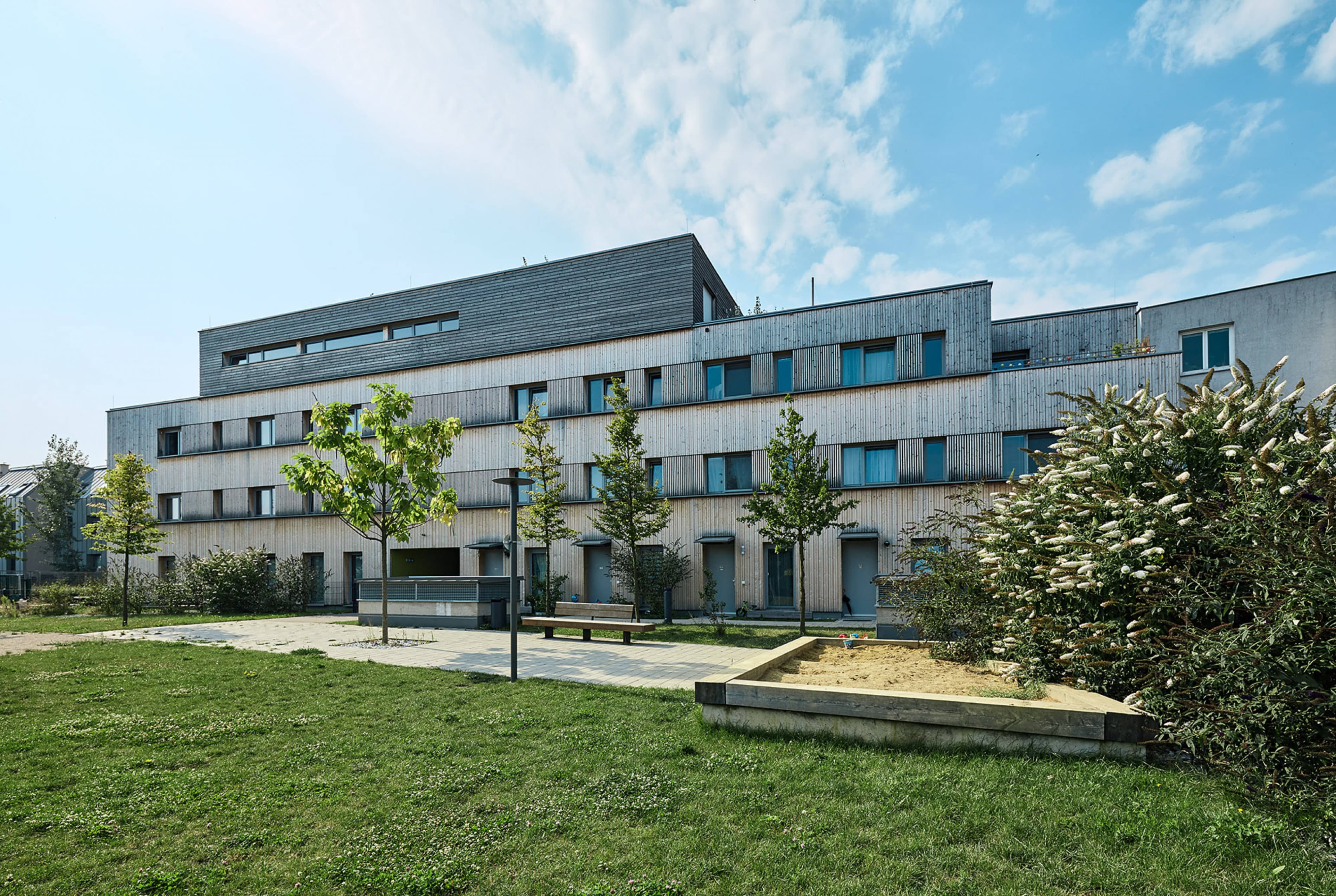 Die städtebauliche Struktur des Gebietes ist geprägt von zeilenartigen Bebauungen. Die vier Häuser nehmen dieses Thema auf und führen es weiter. Den Erdgeschosswohnungen sind Gärten vorgelagert, welche den halböffentlichen vom privaten Raum trennen. Dadurch entstehen in der Erdgeschosszone offene Kommunikationsräume und ein differenzierter, geschichteter Übergang zwischen dem öffentlichen Raum bis hin zur privaten Wohnung. Holz als Bauelement bleibt bewusst im Innen- als auch Außenbereich sichtbar. Dies schafft neben den ökonomischen und ökologischen Vorteilen eine angenehme Wohnatmosphäre und macht den Grundbaustoff sichtbar.