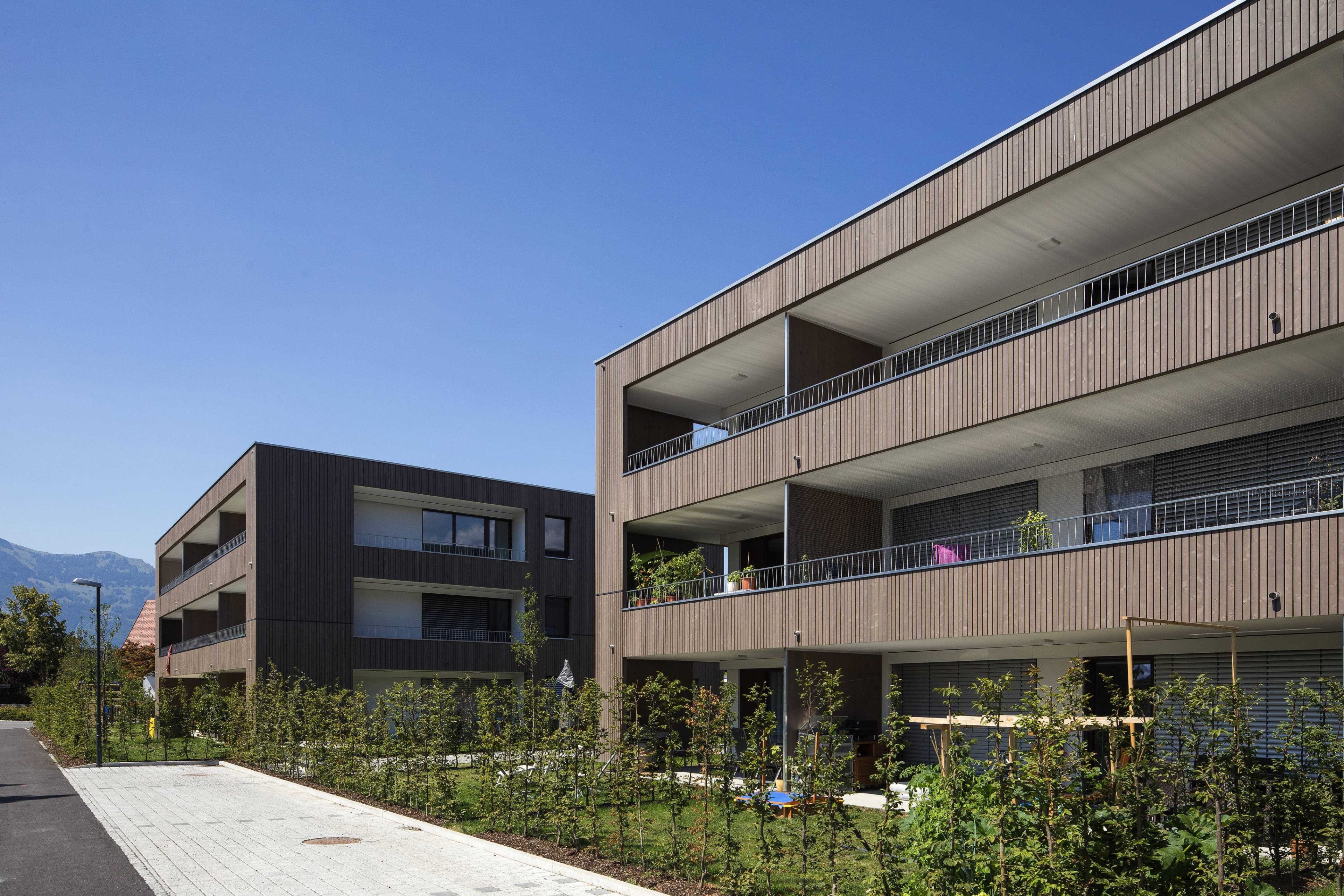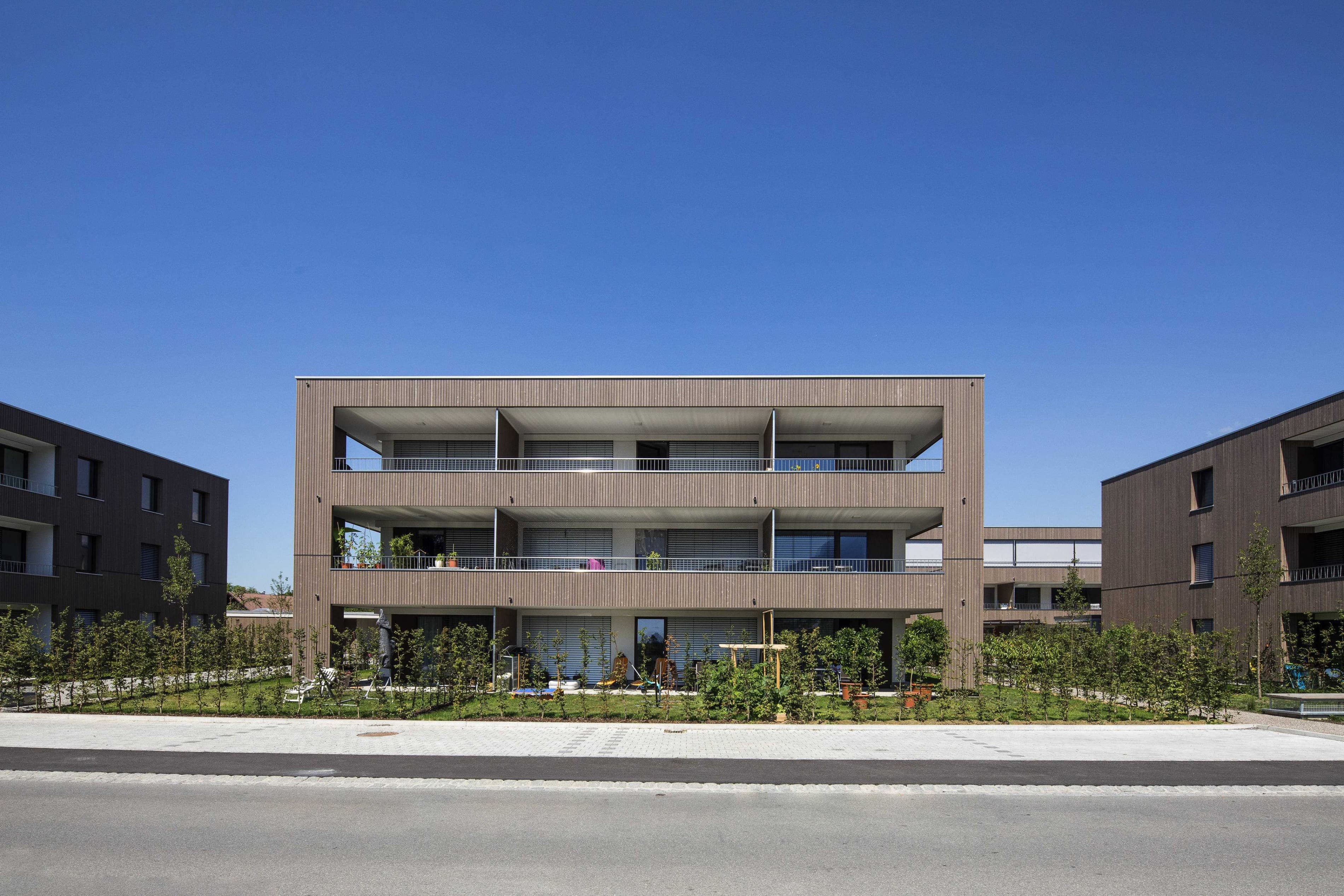 Die vier Baukörper liegen in zentraler und doch ruhiger, ländlicher Lage. Sie sind in ihrer Körnung der angrenzenden und vorherrschenden Einfamilienhausbebauung ein angepasstes Gegenüber. Mit fast siedlungsartigem Charakter, durch gleiche Gebäudetypen suggeriert, ergänzt die Bebauung das nachbarschaftliche Gefüge entgegenkommend. Vor allem im Zusammenspiel mit der hochwertigen Außenraumgestaltung, die nachbarschaftliche Grünflächen einbezieht, wird die Wohnqualität spürbar.