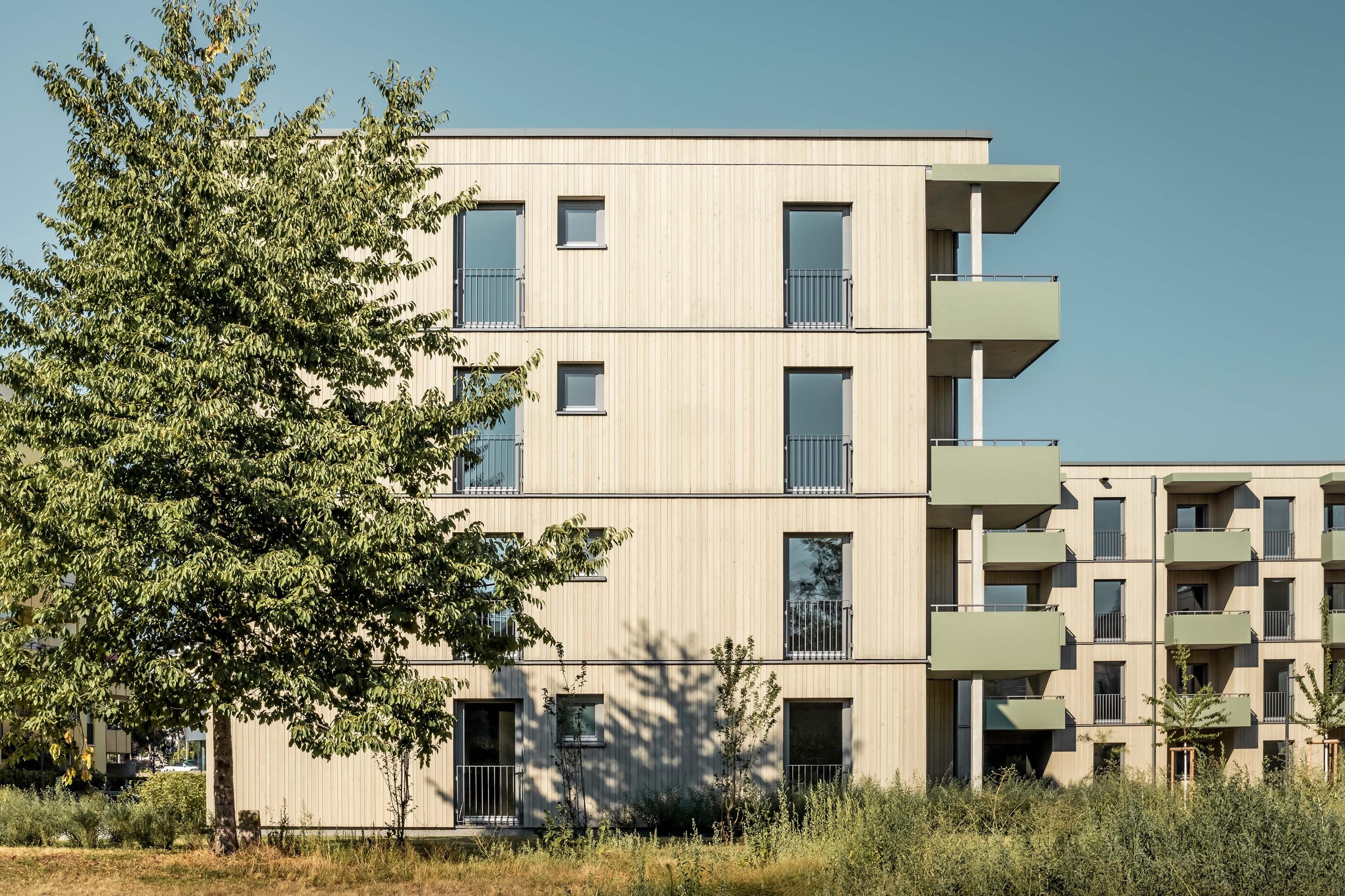 Um ein vielfältiges Wohnungsangebot zu ermöglichen, sind 3 Gebäudepaare als reine Holzbauten konzipiert. Zwei rechtwinkelig zueinanderstehende Gebäude bilden immer ein Paar mit differenzierten Wohnungsgrundrissen. Jedes dieser Gebäude ist mit einem Treppenhaus erschlossen und hat 4 exakt gleiche Regelgeschosse, was speziell beim Holzbau zu empfehlen ist. Nach intensiver Kostenbetrachtung ist dann die Wahl auf einen reinen Holzbau gefallen.