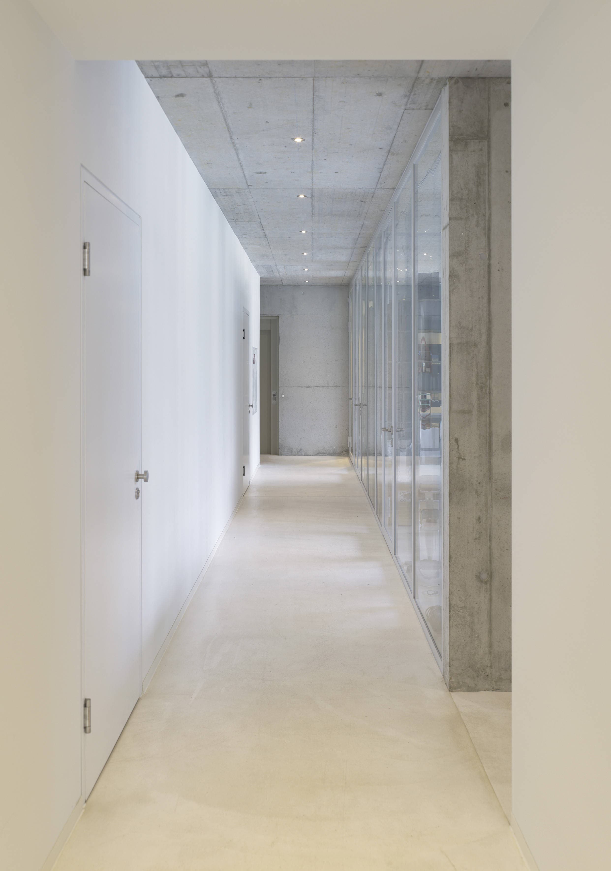 Die Bürozone ist zum Innenhof vollständig und Produktion hin teilweise verglast. Die umlaufende Produktionsfläche ist in der unteren Hälfte der Fassadenhöhe ebenfalls über weite Strecken verglast, der obere Fassadenteil ist mit Metallsandwichpaneelen ausgeführt. Die Gebäudehülle des Neubaus wurde mit einem offenen, vertikalen Holzschirm ausgeführt.