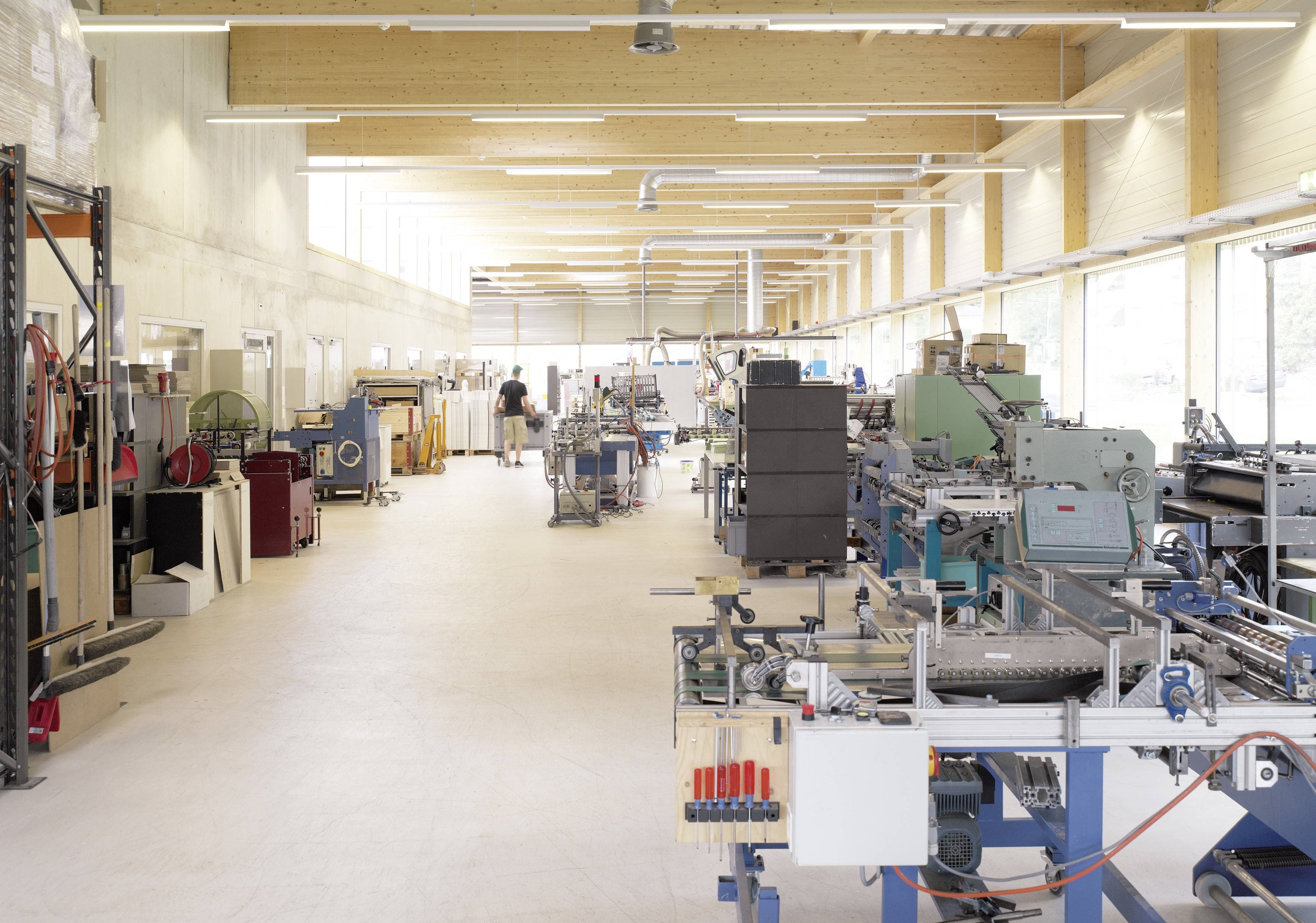 Die Produktionshalle besteht aus einem Skelettartigen Holztragwerk, bestehend aus Stützen und Träger, über das sich ein schallabsorbierendes Trapezblech spannt. Die Holzkonstruktion ist ohne Anforderungen an den Brandschutz geplant.