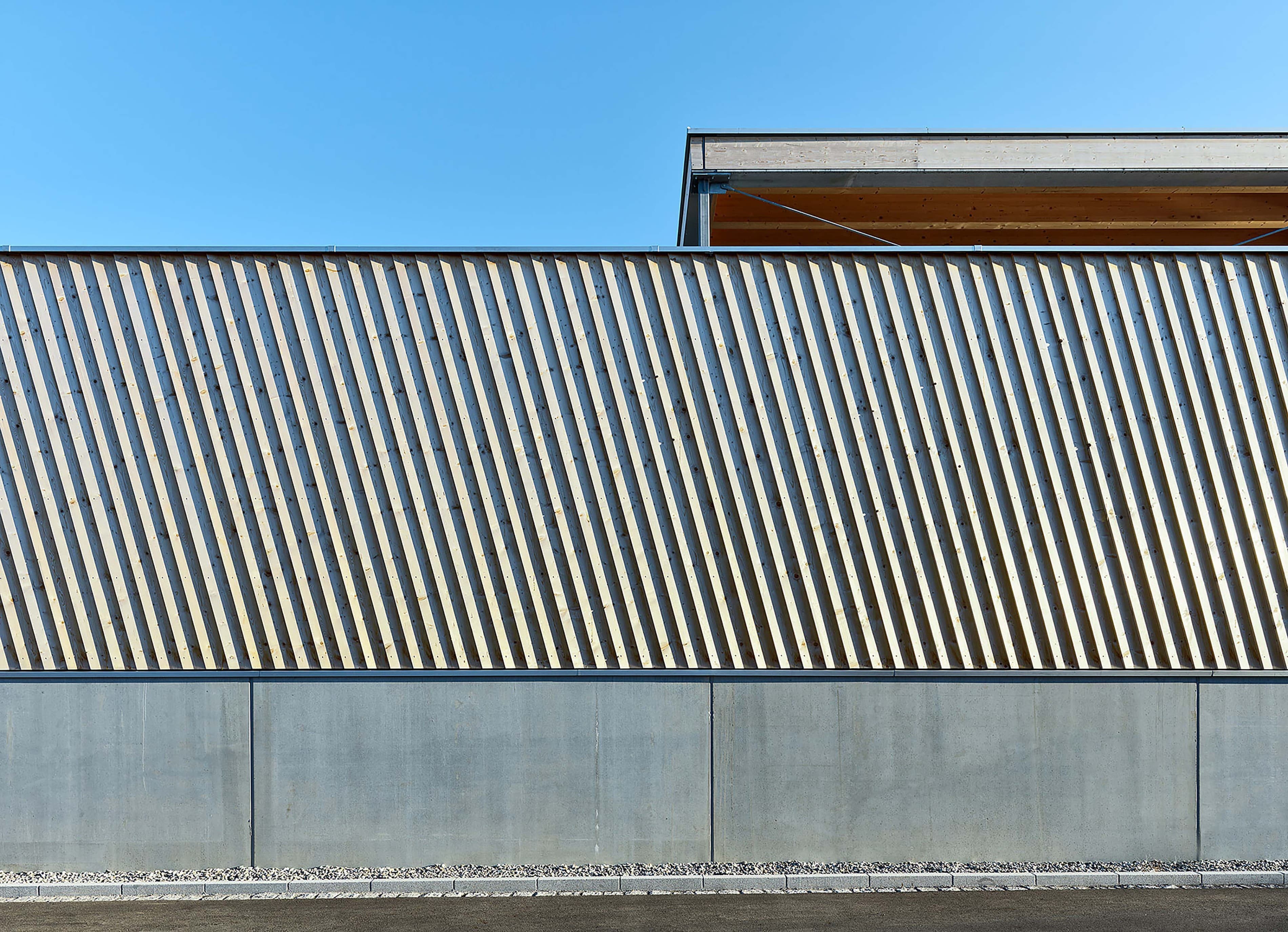 Ein umlaufendes Betonband fasst die gesamte Anlage und übernimmt sowohl gestalterische als auch konstruktive Aufgaben. Es dient als Hofmauer, wird in die Gebäude fortgeführt und verleiht den stark beanspruchten Bereichen die nötige Robustheit. Darüber hinaus treten die Baukörper in Holzbauweise in Erscheinung – außen wie innen ist die Konstruktion zugleich sichtbare Oberfläche. Die Kombination aus Beton im Sockelbereich und Holz in den oberen Zonen schafft eine klare, funktionale Gliederung und eine warme, natürliche Atmosphäre.