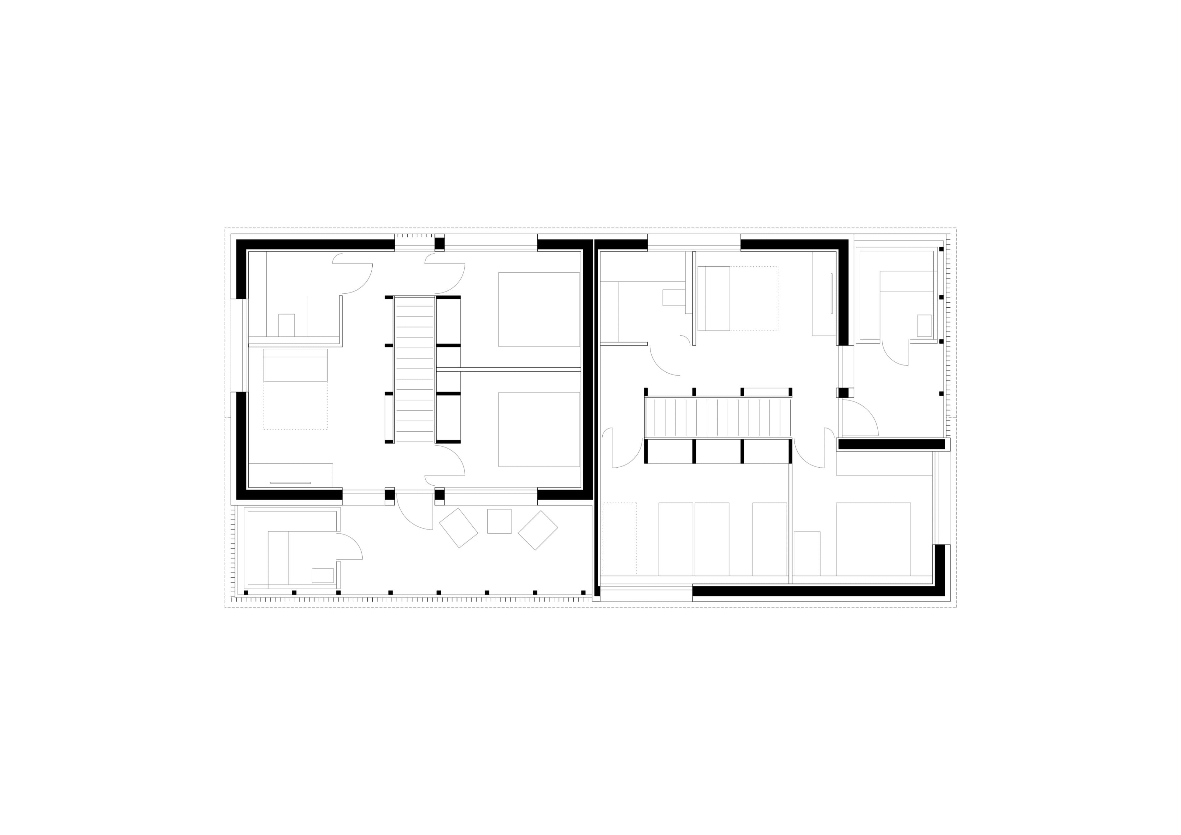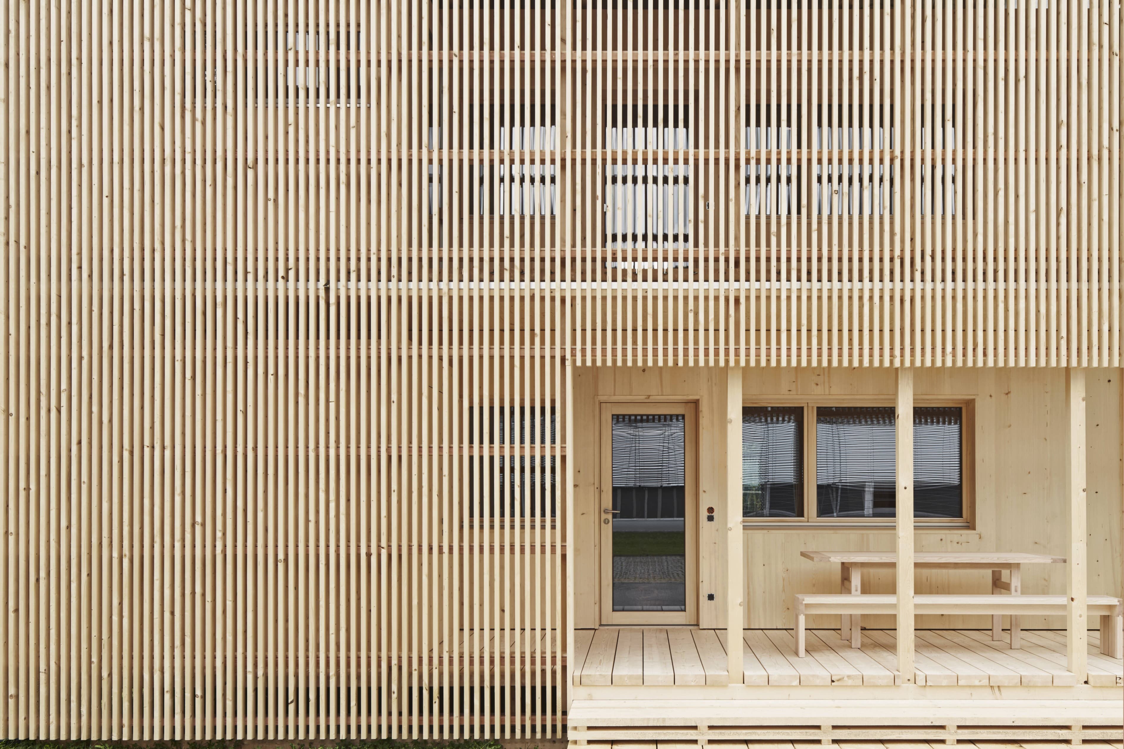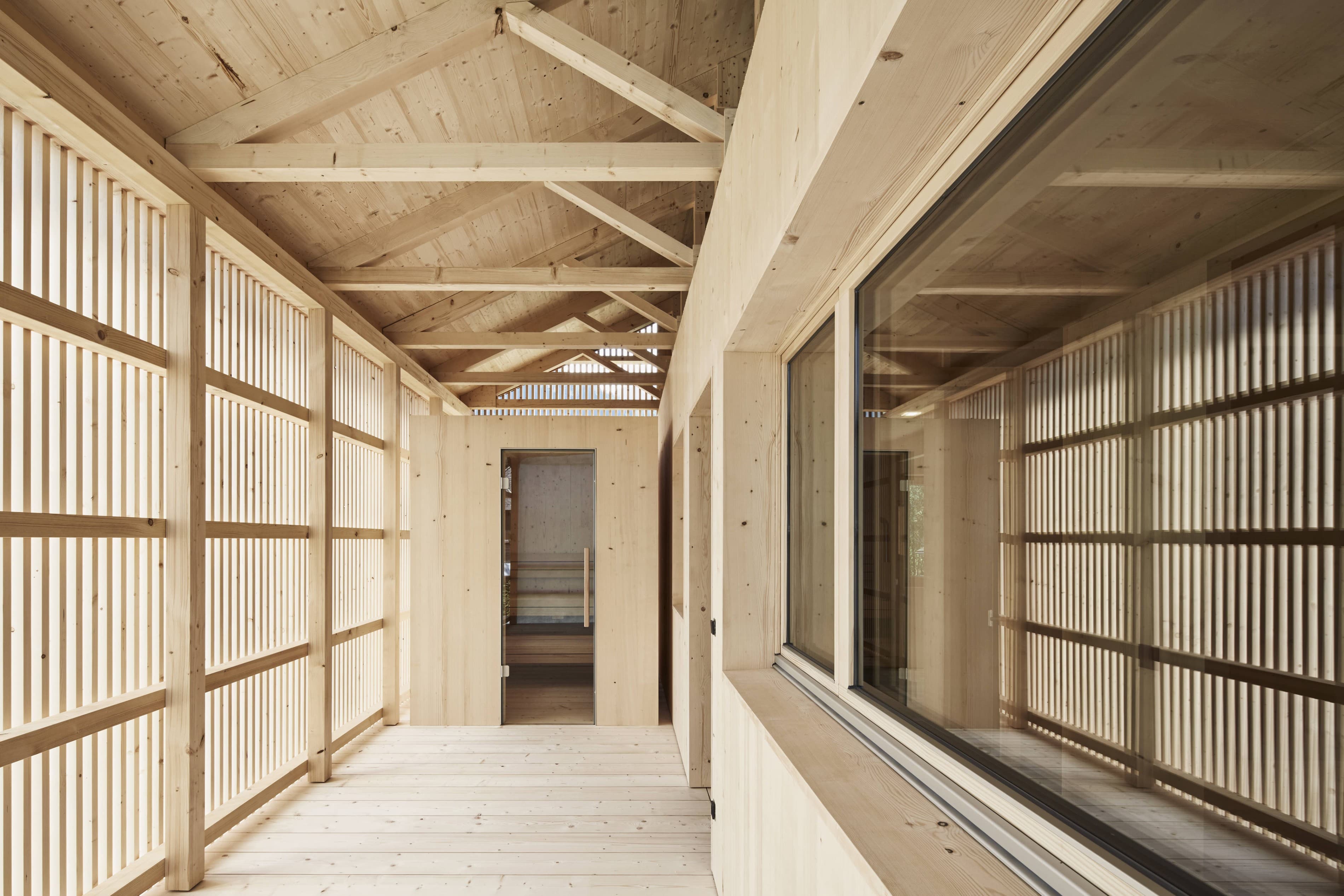 Der zweigeschossige Baukörper mit Giebeldach setzte sich aus vier vorgefertigten Modulboxen aus Holz zusammen. Ihnen ist ein für den Bregenzerwald typischer Schopf vorgelagert. Dieser übernimmt wichtige Funktionen, wie den Zugang ins Haus, bietet zudem Platz für einen gemütlichen Hock, für eine Sauna und für Stauraum.