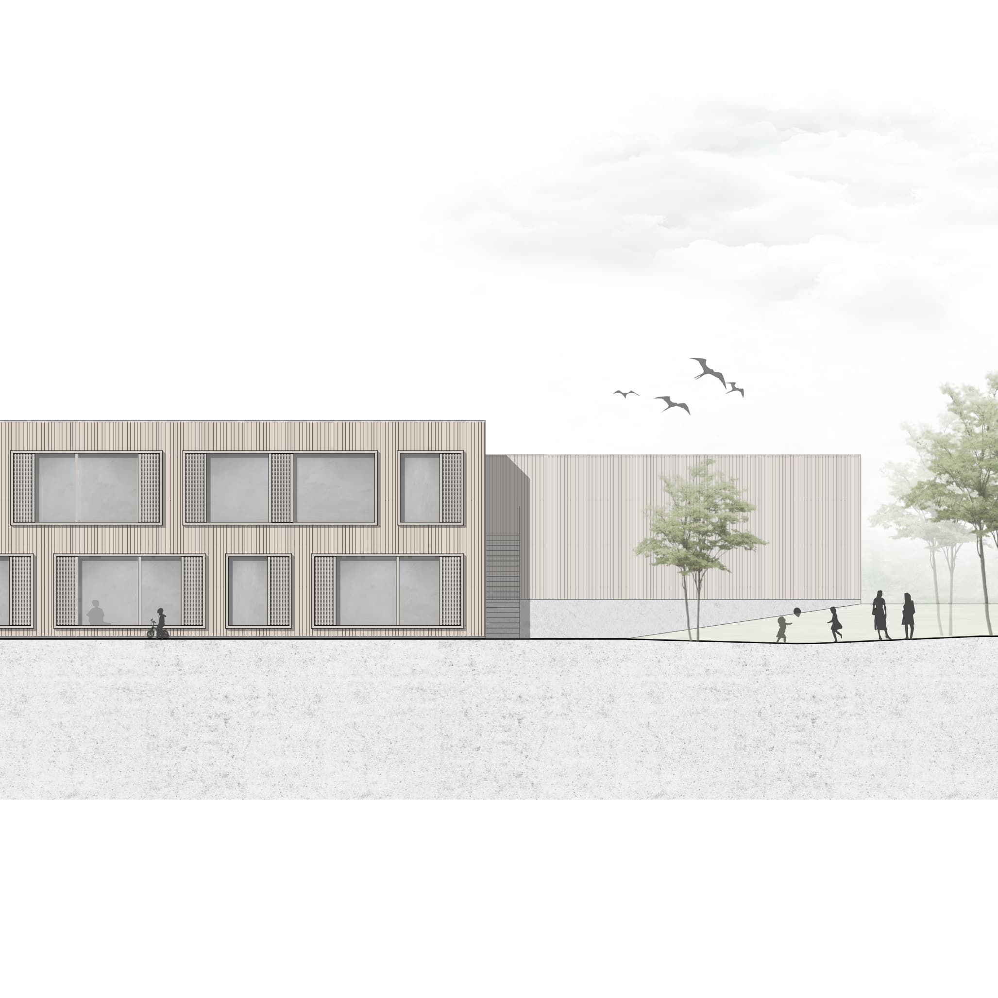 Der Entwurf basiert auf einem Niveauversatz des Eingangsgeschosses, welcher dem natürlichen Geländeverlauf folgt. Aus diesem Ansatz resultiert ein zweigeschossiger Baukörper zum Garten hin und ein eingeschossiger, bezogen auf die Gebäudehöhe, sehr massstäblich erscheinender Baukörper zur Elisabethenstrasse. Durch die einfühlsame Überleitung vom Eingangsfoyer zu den Freianlagen wird eine hohe innenräumliche Qualität und eine willkommene Zonierung im Gebäude erzeugt. Sehr ausgewogen ist auch die Anordnung und Verteilung der einzelnen Gruppen im Gebäude. Durch den gemeinsamen Luftraum und die Anordnung, Ausformung und Belichtung der Erschliessungszonen mit ihren unterschiedlichen Blickbeziehungen wird eine hohe räumliche Qualität erzeugt.