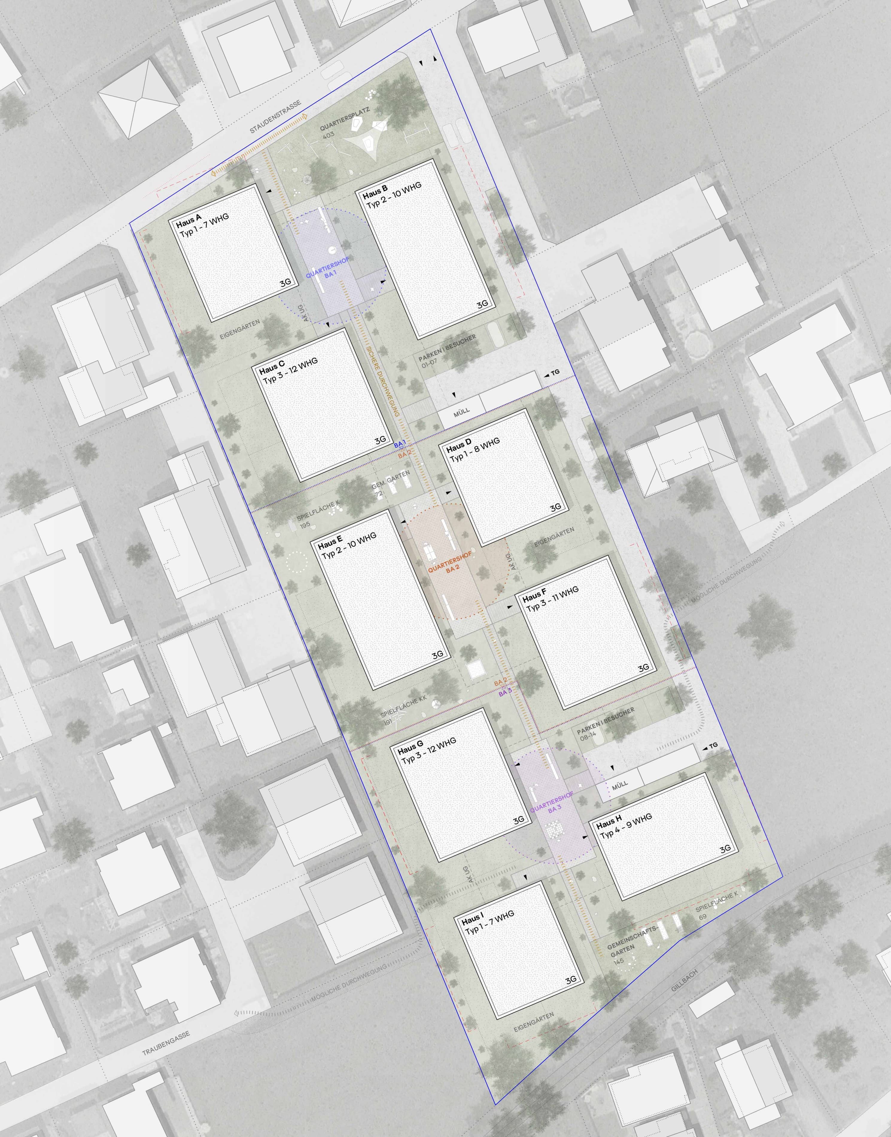 Der erste Bauabschnitt liegt direkt an der Staudenstraße, da hier der Quartiersspielplatz realisiert wird und aus städtebaulicher Sicht die Nachverdichtung von der Staudenstraße zum Gillbach hin stattfinden sollte. Die folgenden Bauabschnitte sind jeweils durch öffentliche Grünflächen leicht voneinander abgerückt, um eine Beeinträchtigung der Bewohner und Bewohnerinnen zu verringern.