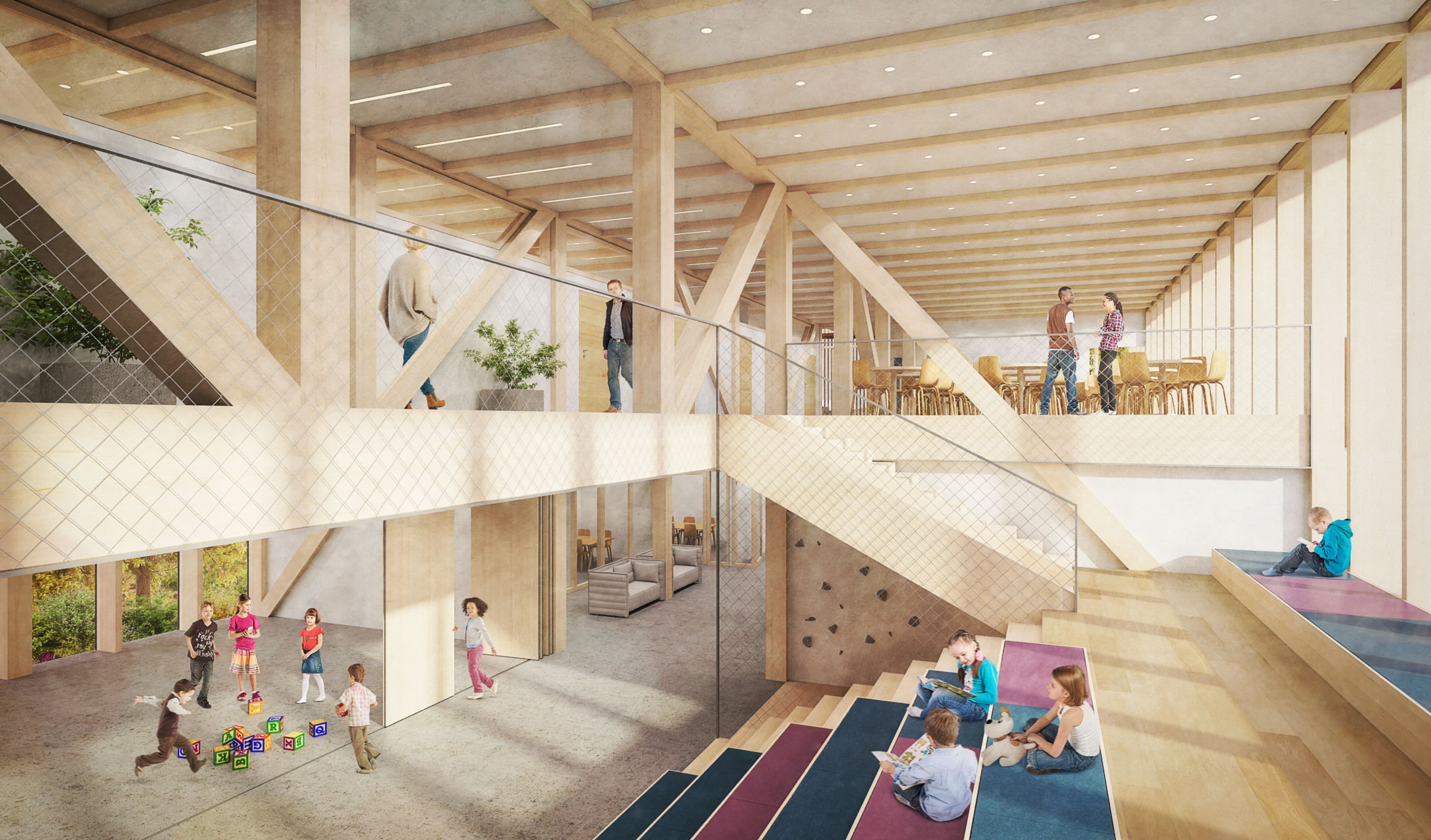 "Der Wettbewerbsbeitrag setzt die ostseitig zeilenförmige Bebauungsstruktur auf dem Wettbewerbsgrundstück mit einem markanten 6-7 geschossigen Längsbaukörper fort, der in reiner Holzkonstruktion angedacht ist. Die Zugangssituation erfolgt über einen großzügig gestalteten Freiraum zur Forachstraße, mit gelungenem Einbezug des Industriekanales Müllerbach, als wichtiges Landschaftselement. Über eine mögliche Begegnungszone in einem Teilabschnitt der Forachstraße, entsteht eine starke Verwebung mit dem westseitigem Forachwäldchen. Grundrisslich und funktional überzeugt das Projekt insbesondere im Erdgeschoss mit klar zonierten Abläufen und hohen Innenraumqualitäten, die sich über Sitzstufen und großzügig dimensionierter Treppenanlage im 1. Obergeschoss, mit den Gemeinschaftsräumen und der Verwaltung, fortsetzen. Die weiteren Obergeschosse nehmen die Kernlernbereiche und Fachraumbereiche gekonnt auf. Das geforderte pädagogische Konzept wird vollumfänglich erfüllt und auch seitens der Pädagoginnen wird die innere Organisation und der Entwurfsansatz als spannender, souveräner Beitrag beurteilt. Die klar getrennte Zugänglichkeit zum Sportbereich ermöglicht eine flexible außerschulische Nutzung."