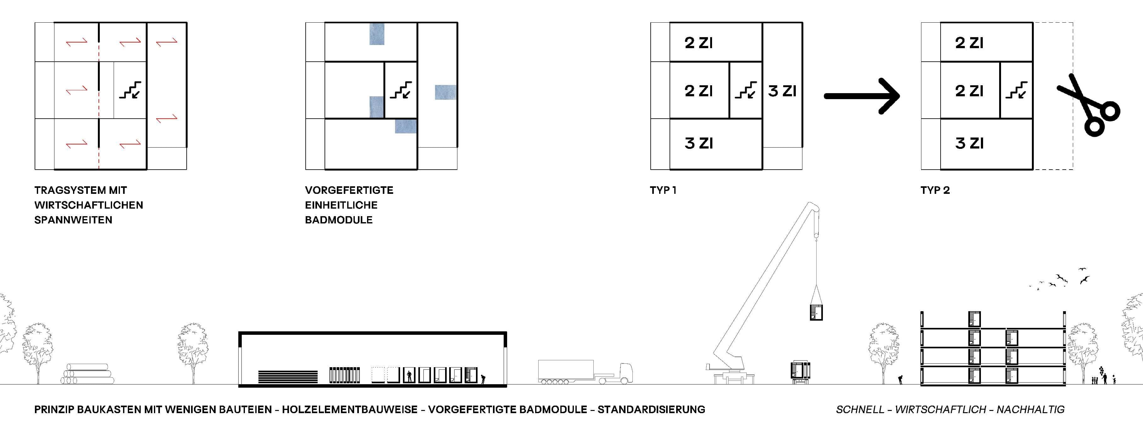 Durch die Reduktion auf wenige Haus- und Wohnungstypen und dem Aufbau eines Baukastens von Details und Bauteilen sind ein hoher Vorfertigungsgrad und damit eine kurze Bauzeit und wirtschaftliche Umsetzung des Projektes möglich. Einheitliche, vorgefertigte Badmodule, ein vorwiegend genutztes Fensterformat, einheitliche Spannweiten und sich wiederholende Wandelemente sind die Bestandteile des Baukastens.