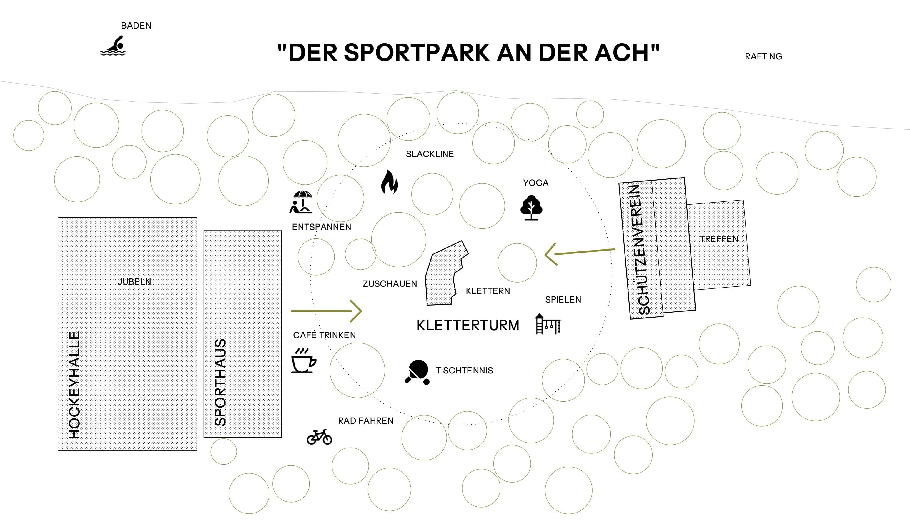 Durch die bewusste Verortung des neuen Baukörpers im direkten Anschluss an die Hockeyhalle wird der Außenraum zwischen dem Neubau und dem Gebäude des Schützenvereins maximiert und zu einem qualitätsvollen Außenraum vereint – gespickt mit Sport- Aufenthalts-, Kleterflächen. Das nahe Umfeld des Sporthauses ist parkartig und naturnah angedacht. Die gekonnte Ausformulierung des Holzbaus mit seinen fein gegliederten Fassadenrippen zeugt von gestalterischem Feingefühl.