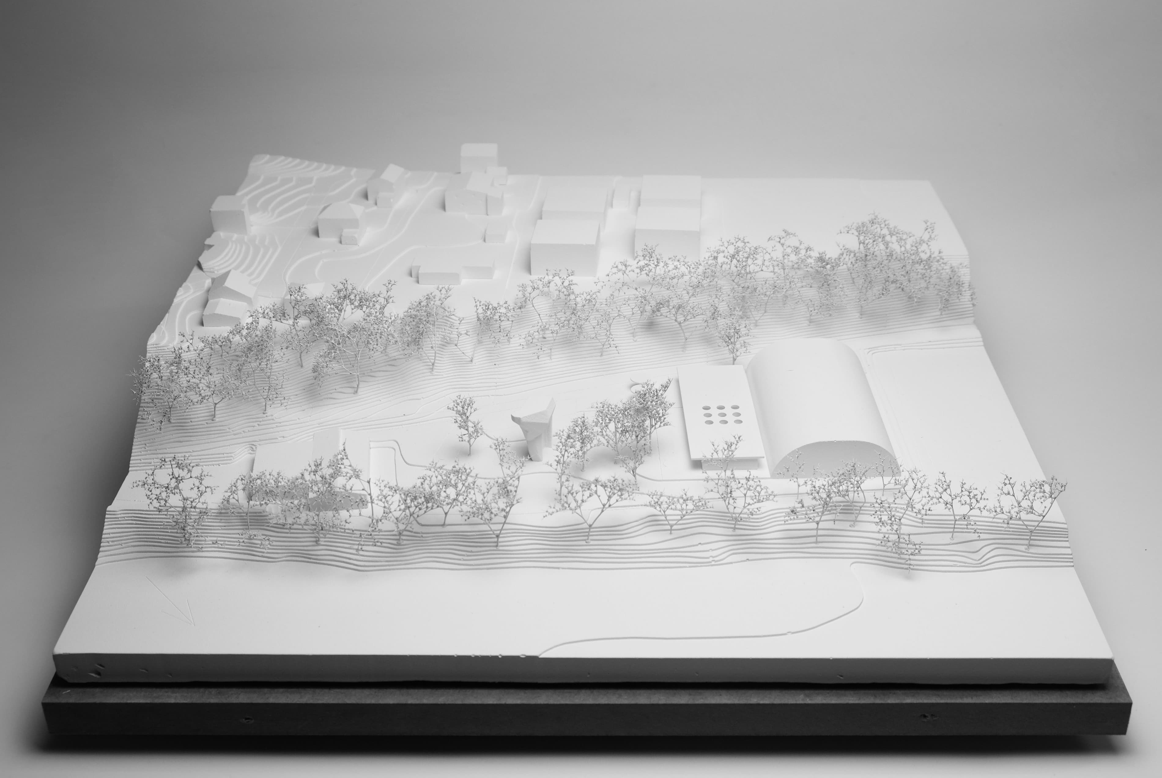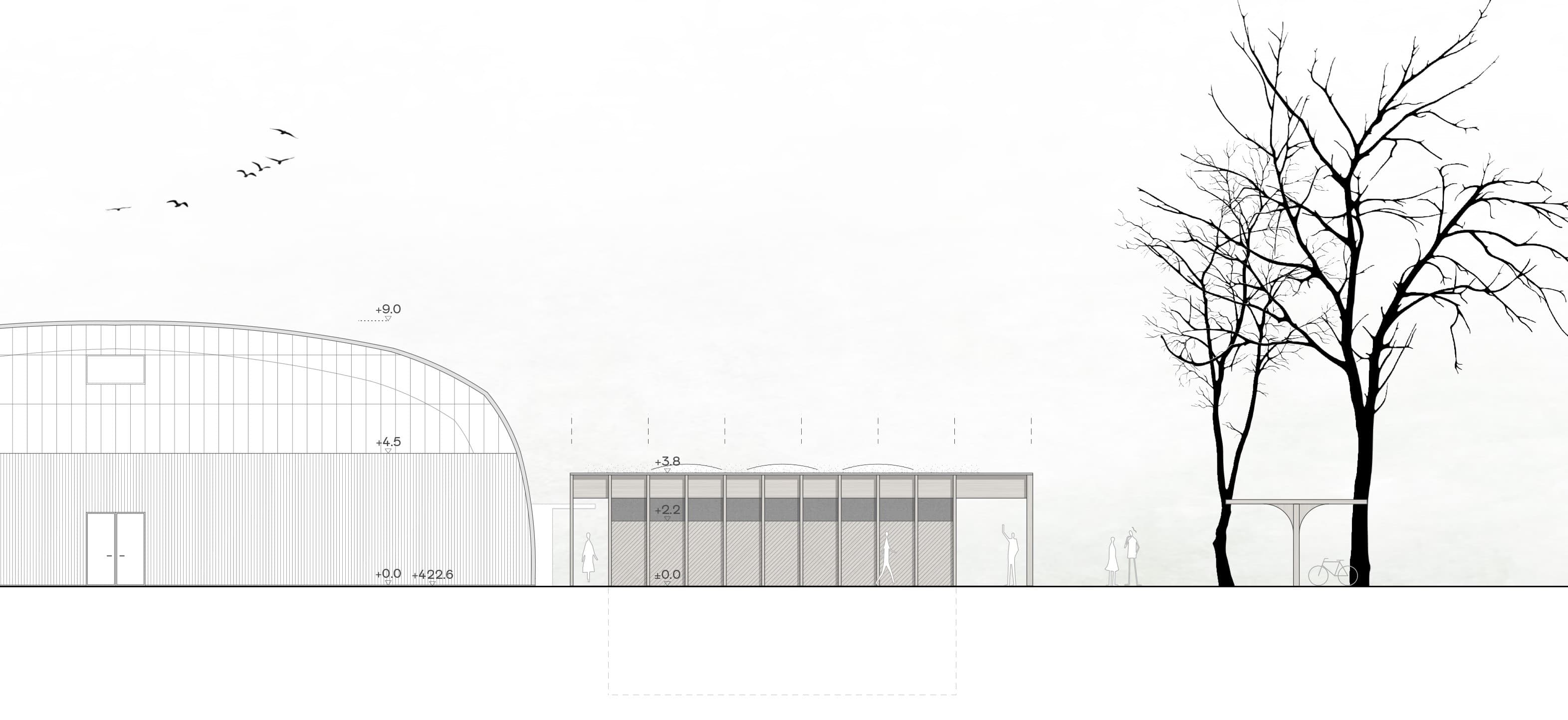 Die VerfasserIn sieht einen rechteckigen Baukörper, parallel zur Hallenlängswand vor. Dieser neue Baukörper ist voll unterkellert und schmiegt sich präzise, aber abgesetzt durch eine Fuge, an die Eingangsseite der Halle an. Die oberirdisch angeordneten Nutzungen sind in zwei Volumen aufgeteilt und werden von einem gemeinsamen Flachdach überspannt. Durch das Auseinanderrücken der beheimateten Nutzungen, wird die Eingangssituaion der Halle aufgewertet und eine Adresse gebildet. Unterstützt wird die neue Adressbildung durch die Einbringung von Tageslicht mitels Tageslichtkuppeln im neuen großzügigen Eingangsbereich.