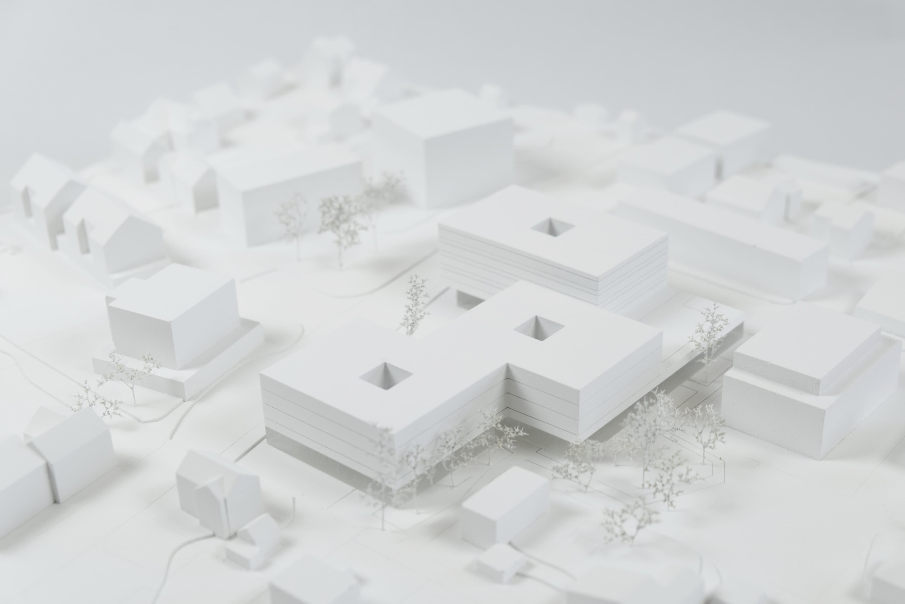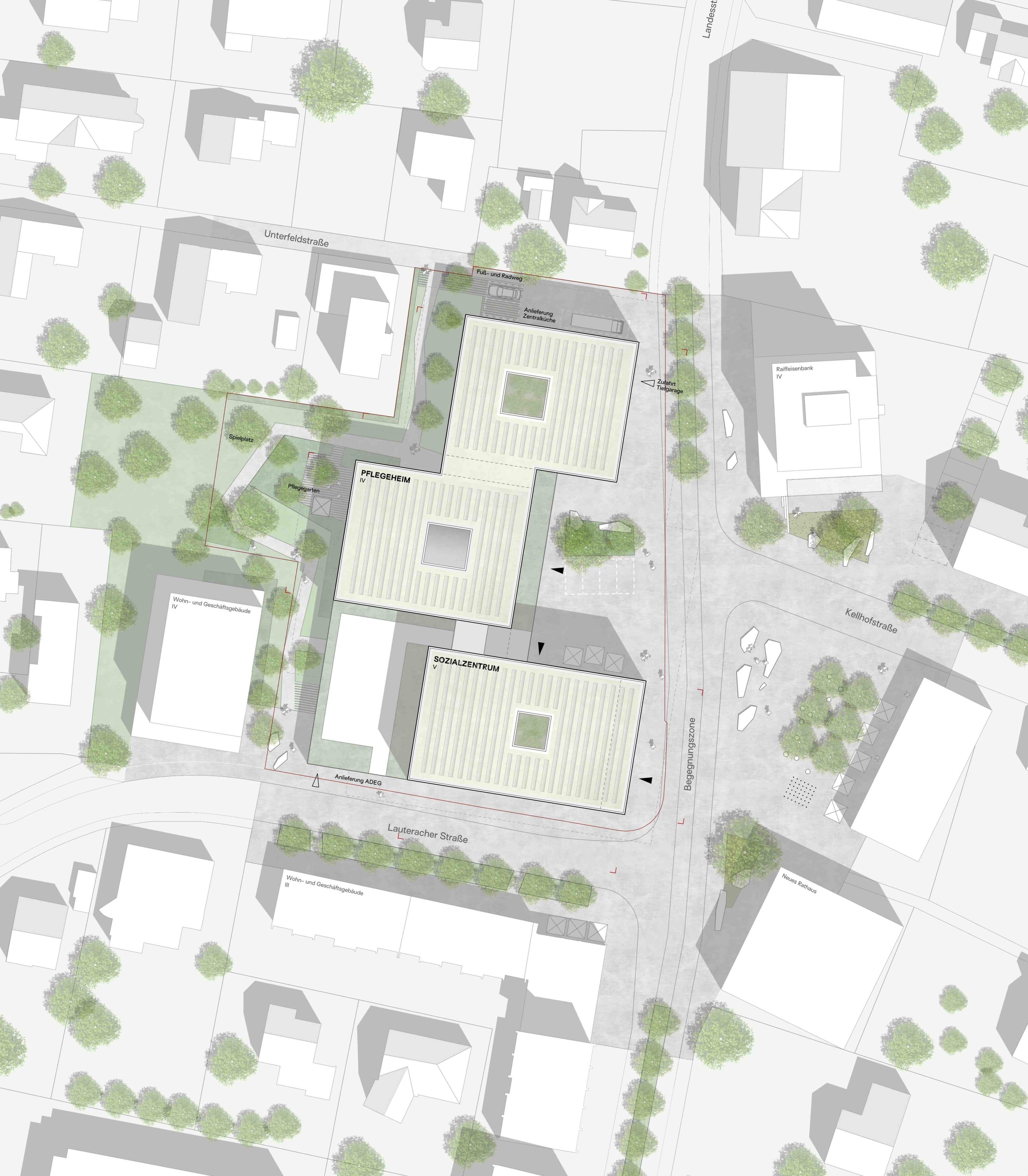 Durch die Gliederung der Baumasse in Teilvolumen werden die Gebäudelängen des Gesamtkomplexes entlang Landesstraße und Lauteracher Straße maßstäblich gegliedert und können sich so gut in die umgebende städtebauliche Körnung einfügen. Durch den Versatz zwischen Pflegeheim und Sozialzentrum entsteht darüber hinaus in Verlängerung der Kehlhofstraße eine Raumtasche zum zukünftigen Platz, die sich als neuer Endpunkt über eine Raumfolge bis in die historische Ortsmitte verbinden kann und als zentraler Erschließungsbereich für die neuen Programme anbietet.