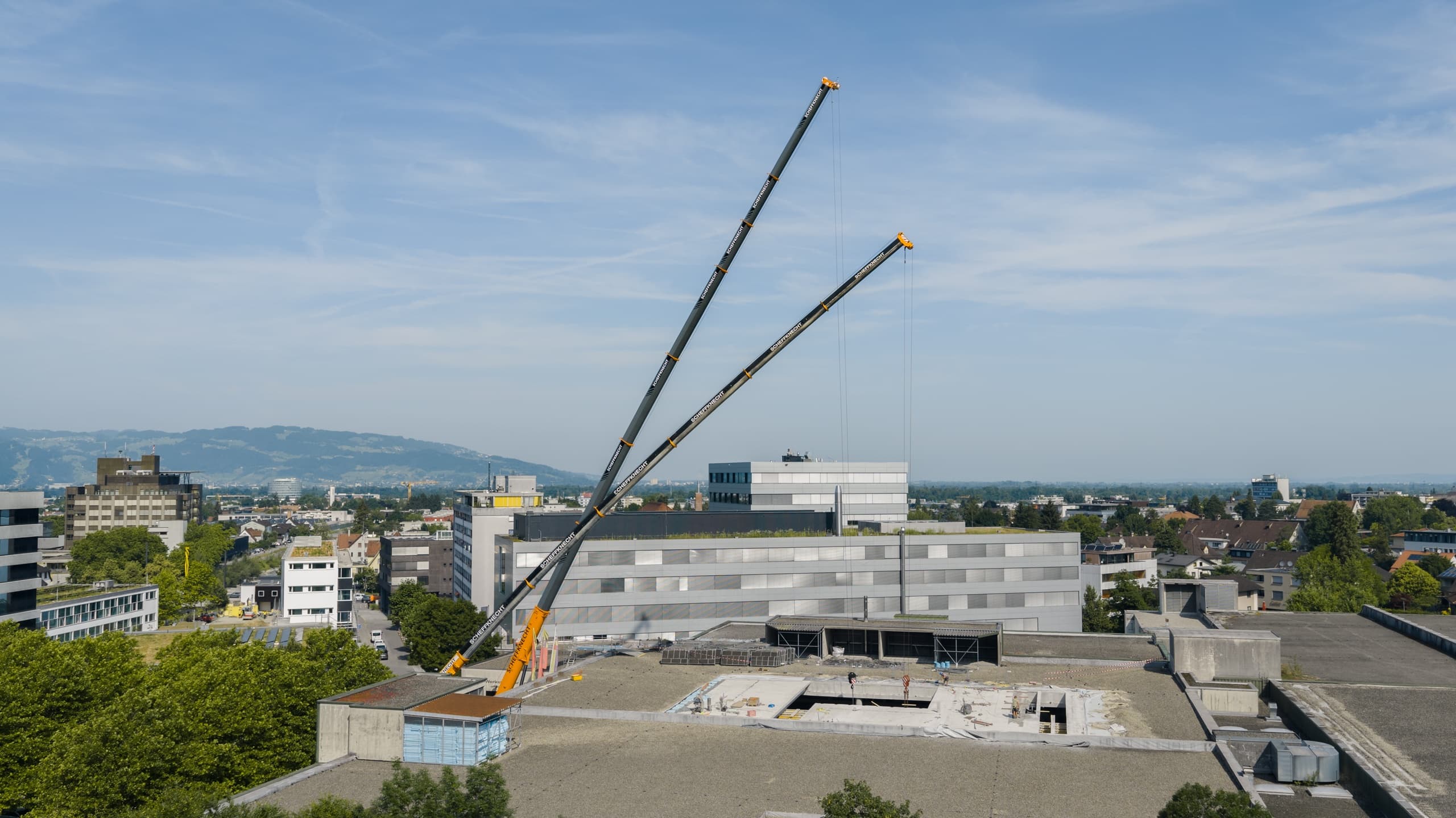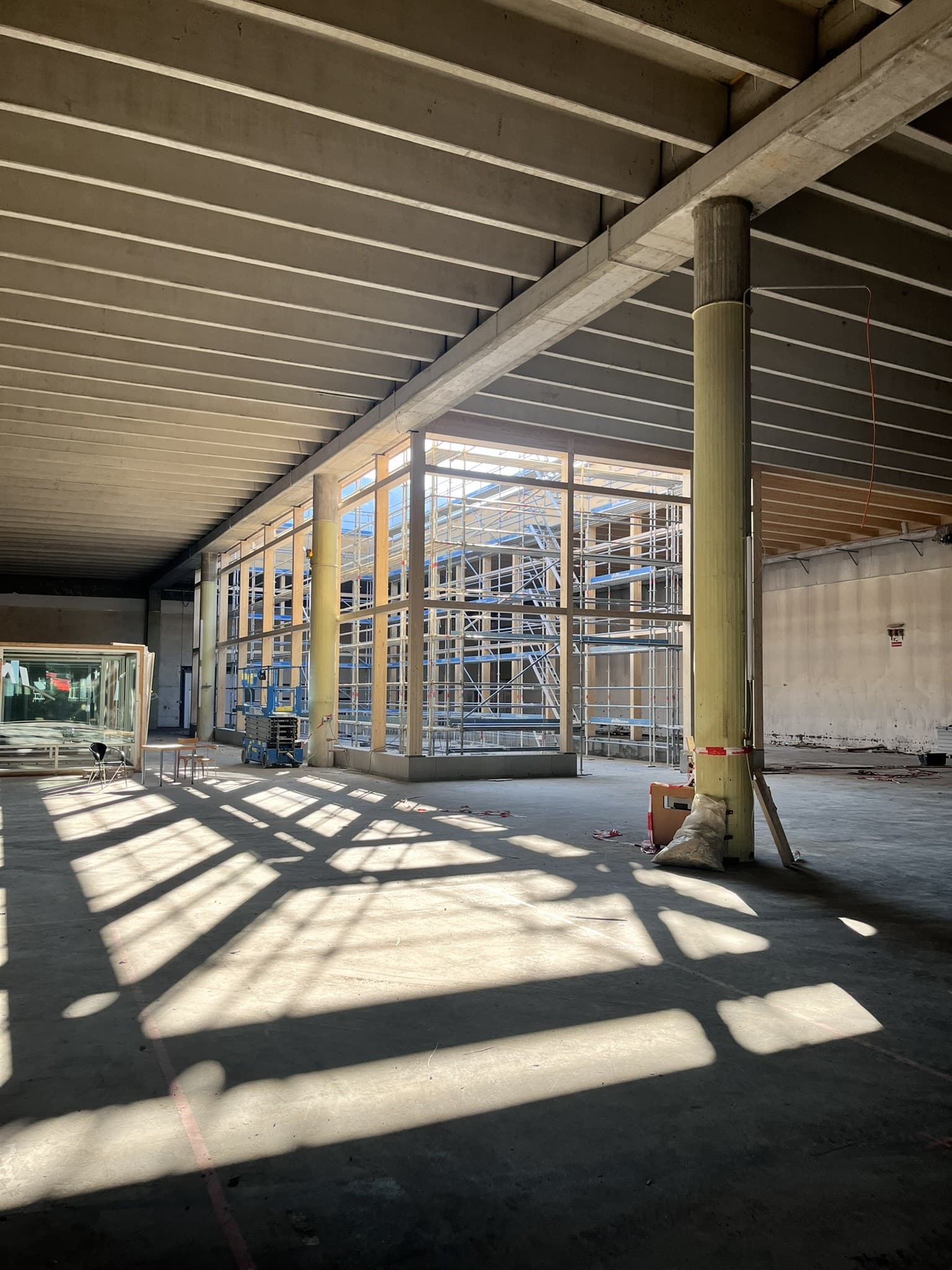 Im Bereich des offenen Daches entsteht ein Innenhof, der später mit drei Bäumen bepflanzt wird – ein grünes Herzstück, das die Aufenthaltsqualität maßgeblich prägen wird. Die Verglasung des Innenhofs ist bereits fast fertiggestellt. Die Fenster stammen zu einem großen Teil aus dem Nachbargebäude der FHV. Dort wurden die Fenster ausgetauscht, in den Hallen der CampusVäre restauriert und wiederverwendet. Damit erhält das Projekt nicht nur einen einzigartigen Charakter, sondern setzt auch ein starkes Zeichen für ressourcenschonendes Bauen.