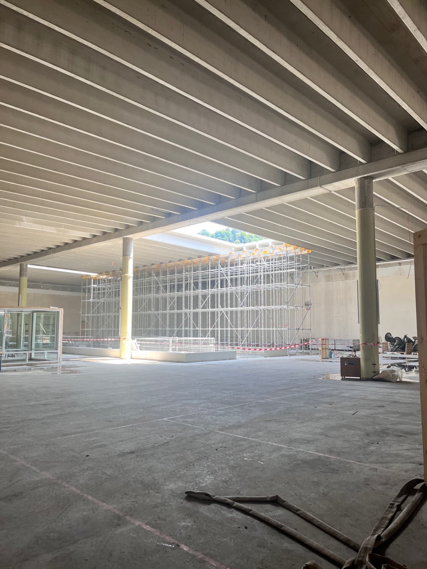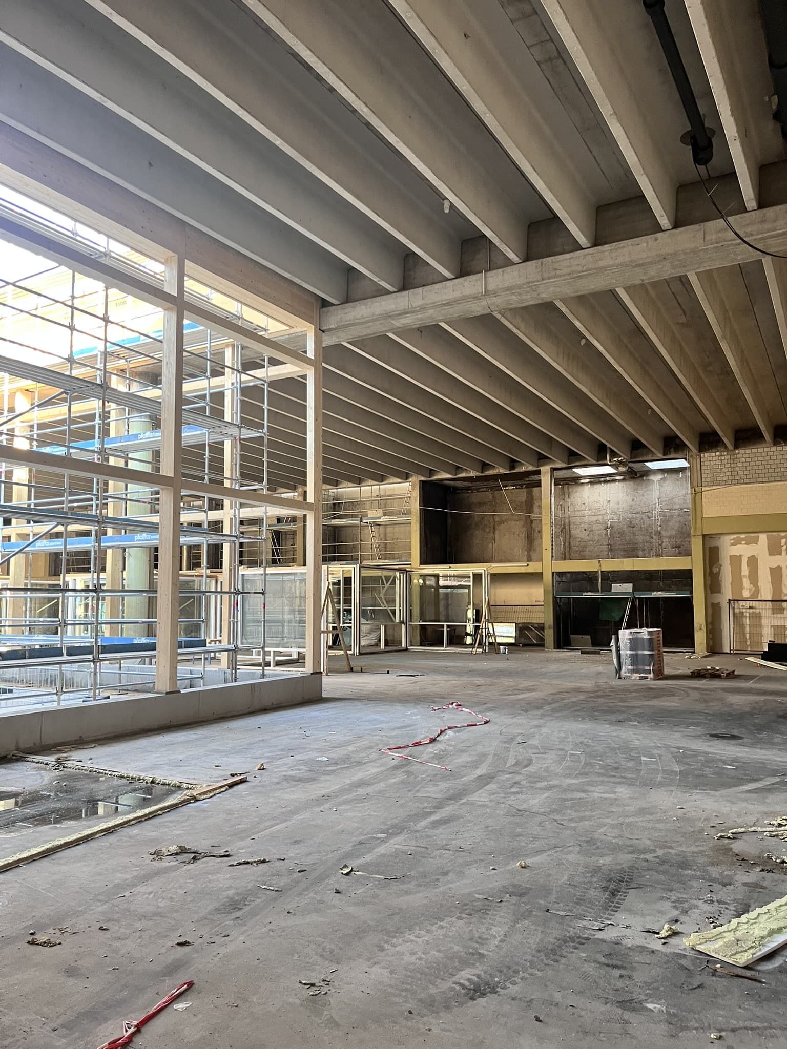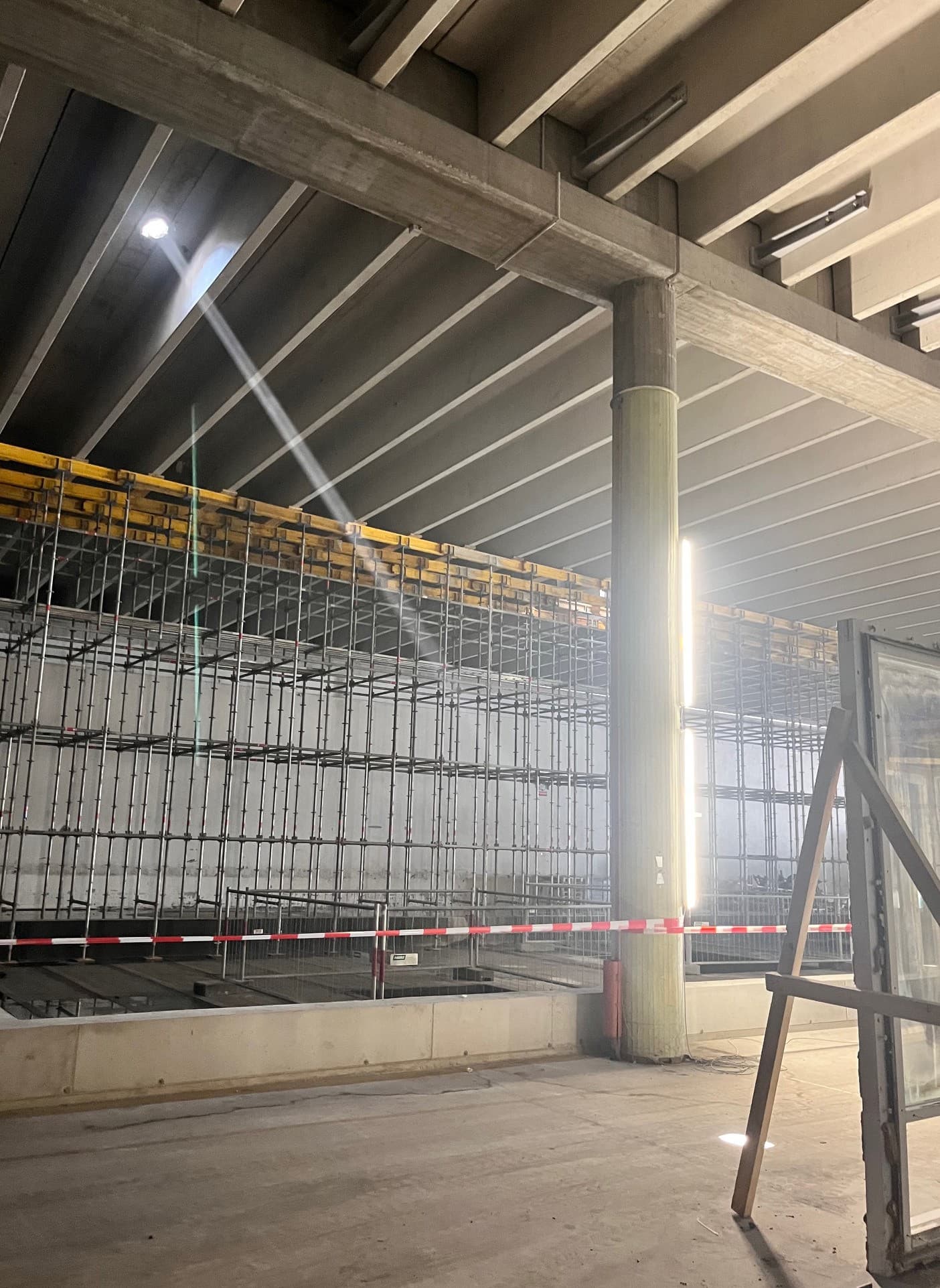 Ein besonderer Meilenstein war das Öffnen des Daches, durch das nun Licht in das Gebäude fällt. Mit zwei großen Mobilkränen wurde das massive Dach Stück für Stück ausgebaut. Die Betonelemente sind aktuell zwischengelagert und kommen beim Bau von Sitzstufen im Eingangsbereich wieder zum Einsatz.