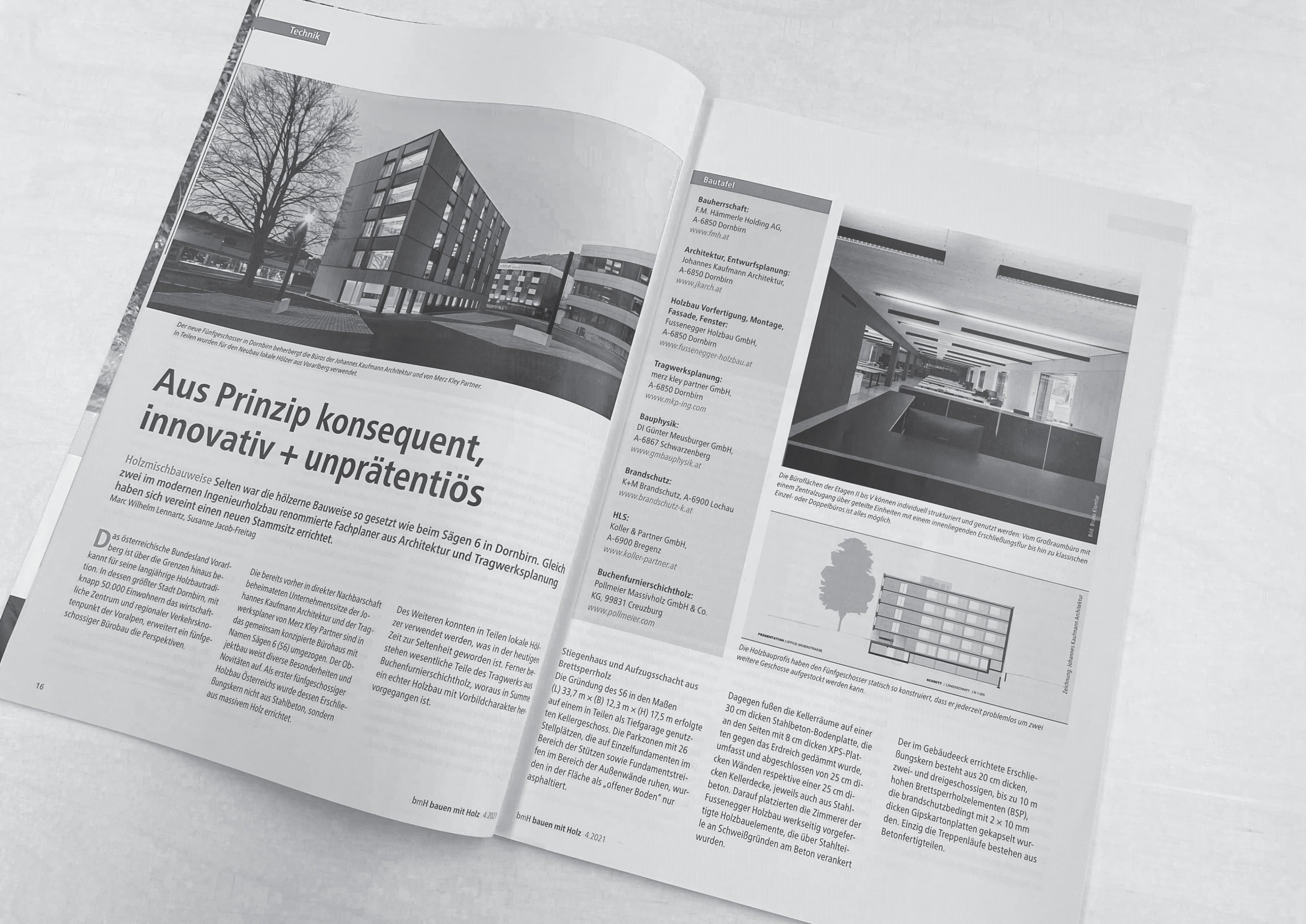 Holzmischbauweise, selten war die hölzerne Bauweise so gesetzt wie beim Sägen 6 in Dornbirn. Gleich zwei im modernen INgenieurholzbau renommierte Fachplaner aus Architektur und Tragwerksplanung haben sich vereint einen neuen Stammsitz errichtet.