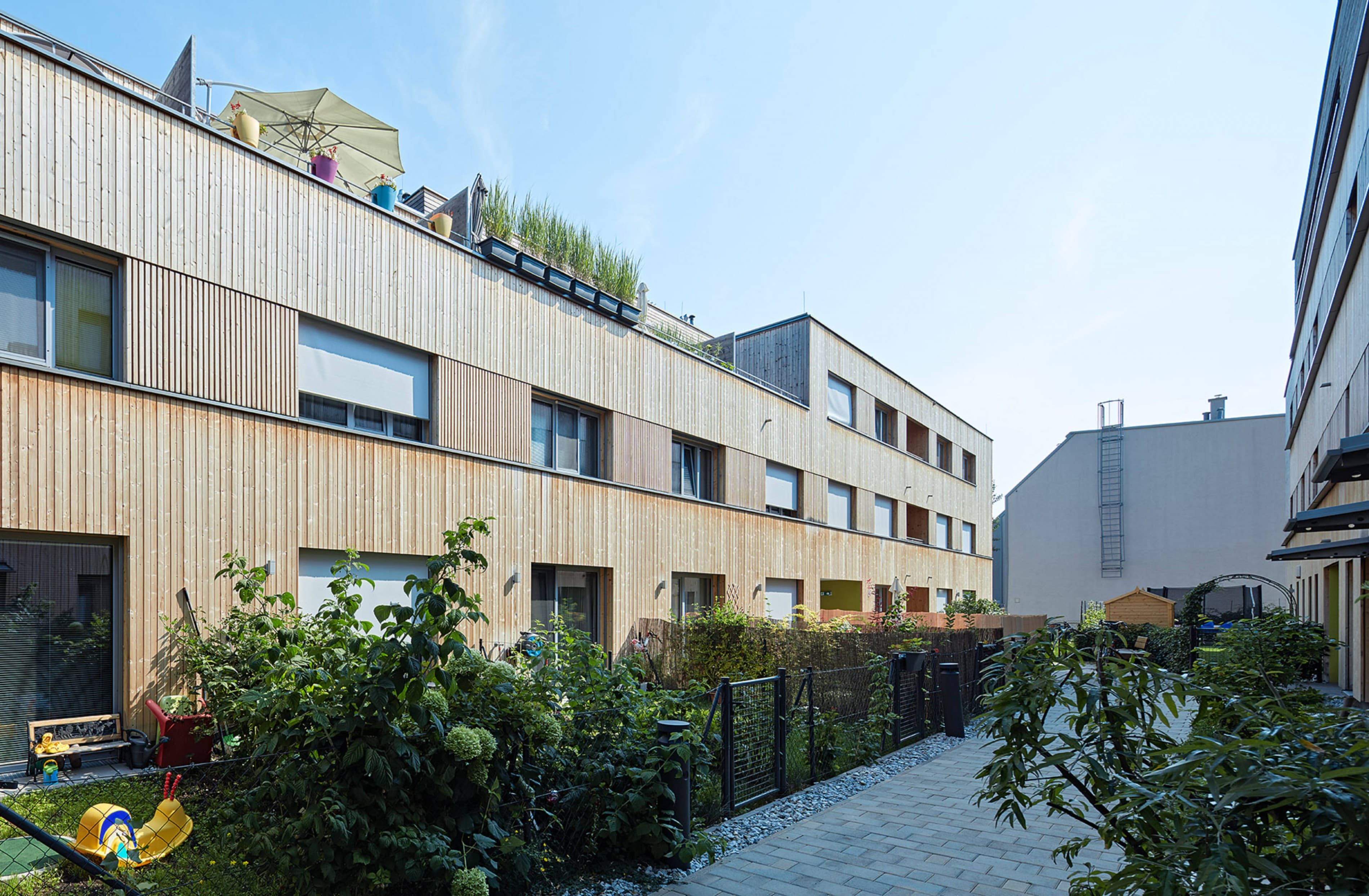 Die Wohnanlage in der Paulasgasse setzt für den mehrgeschossigen Holzbau in Wien ein wichtiges Signal: Nach längerer Pause hat eine gemeinnützige Wohnbaugenossenschaft hier erstmals wieder eine größere Wohnanlage in Holzbauweise errichtet, was im Rahmen des straffen Kostenrahmens eindrucksvoll gelang. Der dreigeschossige Wohnbau mit Staffelgeschoss überzeugt nicht nur durch seine städtebauliche Integrität und ein differenziertes Freiraumangebot, sondern auch in seiner holzbautechnischen Umsetzung. Die vier Zeilen docken direkt an die Nachbarbebauung an und definieren ein durchlässiges Wohnquartier. Ein quer zu den Zeilen verlaufender offener Weg dient als Haupterschließung. Bis auf die betonierten Stiegenhäuser sind die Trakte reine Holzbauten aus vorgefertigten vollgedämmten Holzrahmenbauwänden und Brettsperrholzdecken. Im Inneren bleibt der Werkstoff teilweise an den Decken sichtbar, außen ist der Bau vollflächig mit unbehandeltem Lärchenholz verschalt. Obwohl der Wohnbau schon einige Jahre steht, wirkt er dank seines geringen Vergrauungsgrads bzw. seines sehr einheitlichen Vergrauens noch fast wie neu.