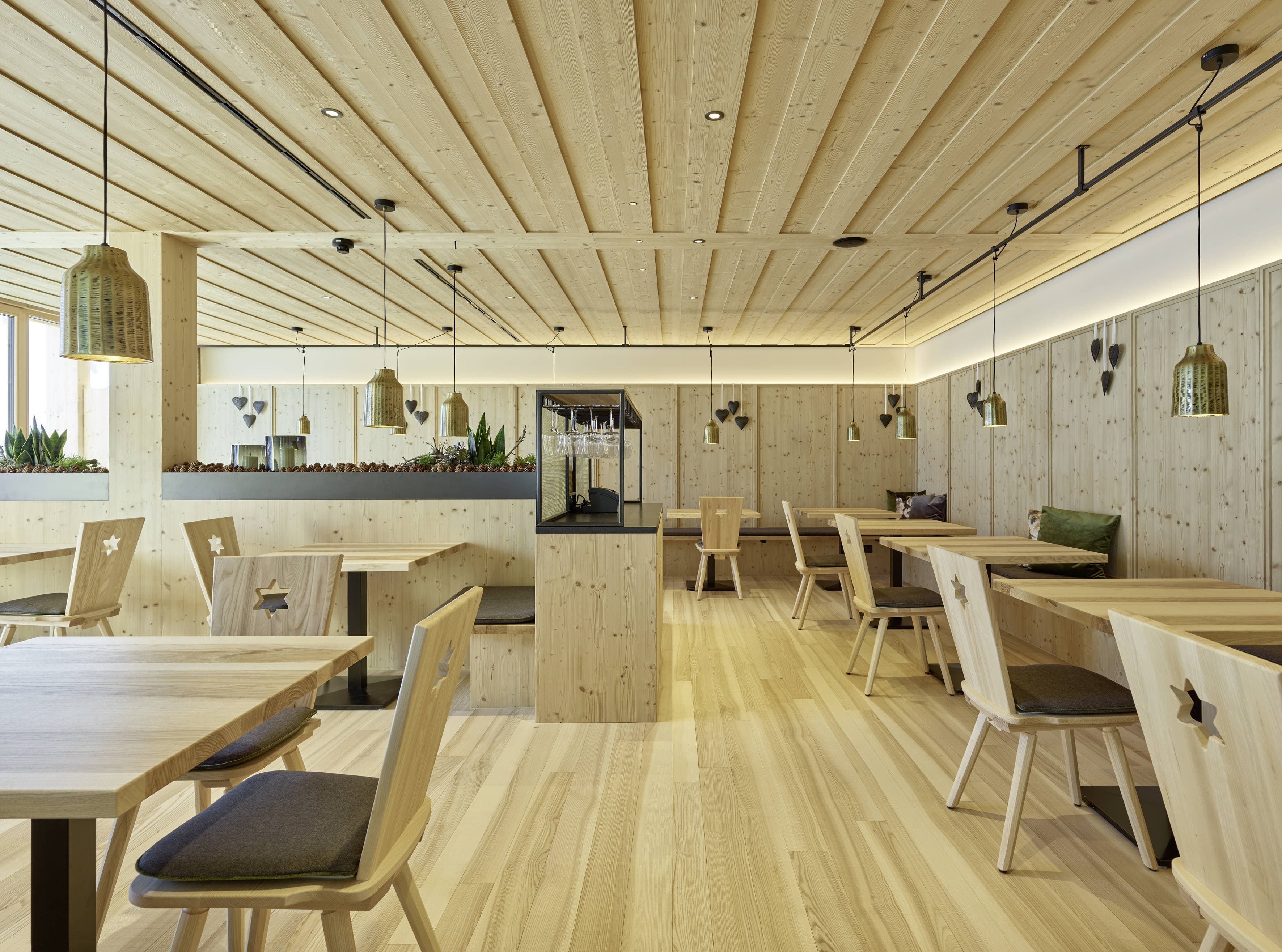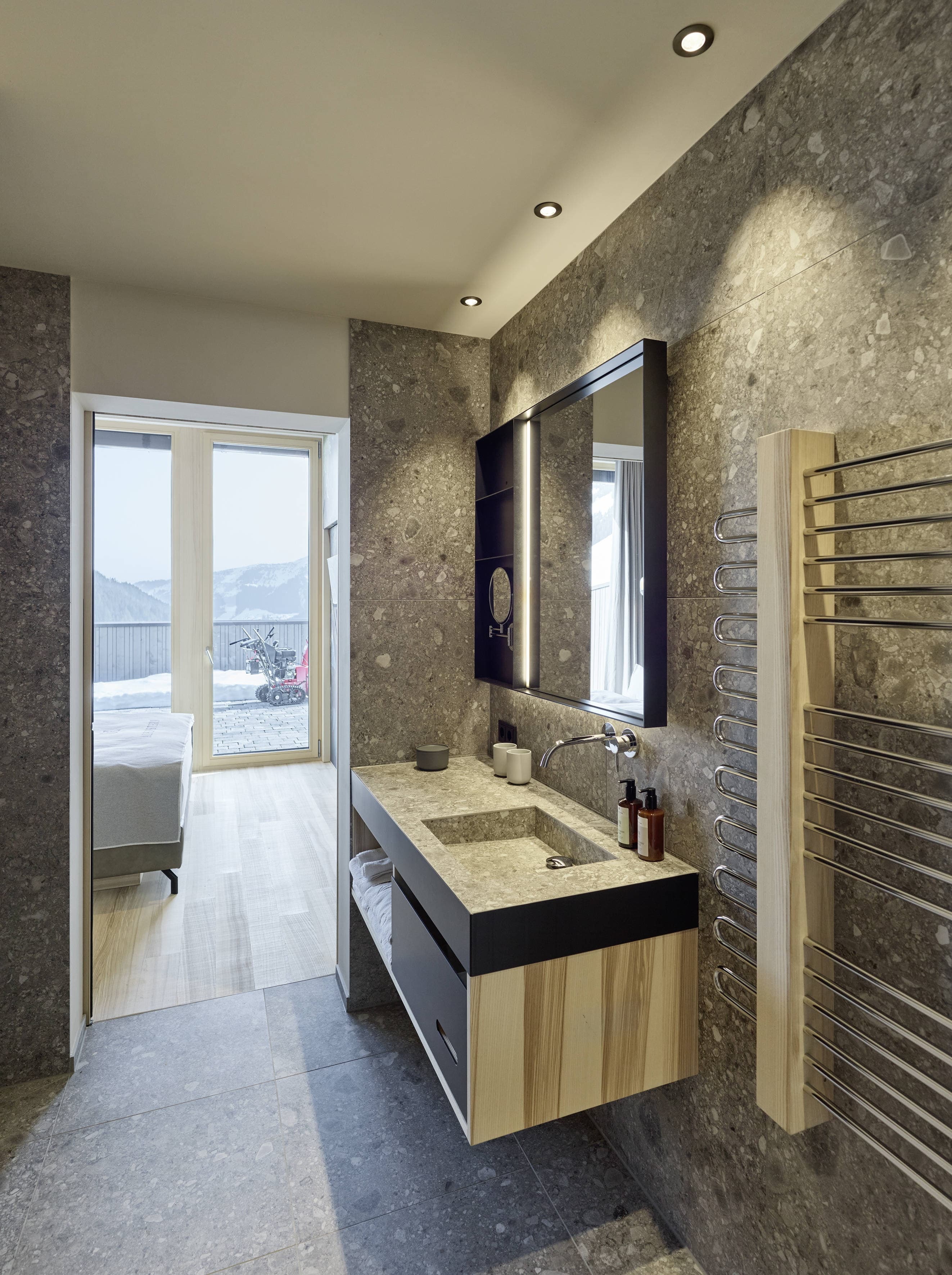 In Form und Material orientiert sich das Projekt an der traditionellen Bauweise mit massiven Sockeln, hölzernen Obergeschossen und geneigten Dächern, interpretiert diese jedoch neu und der Gebäudegröße angepasst.