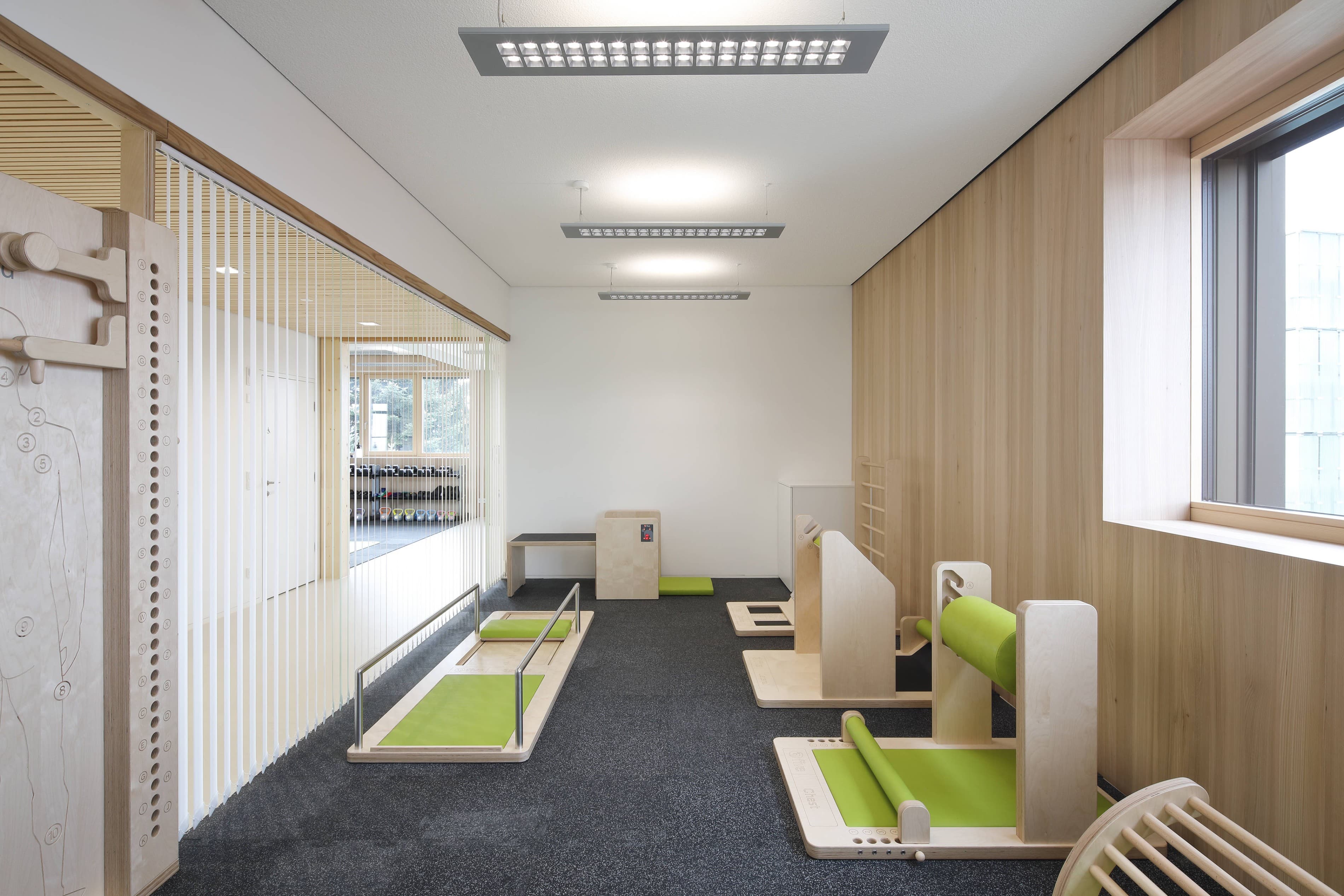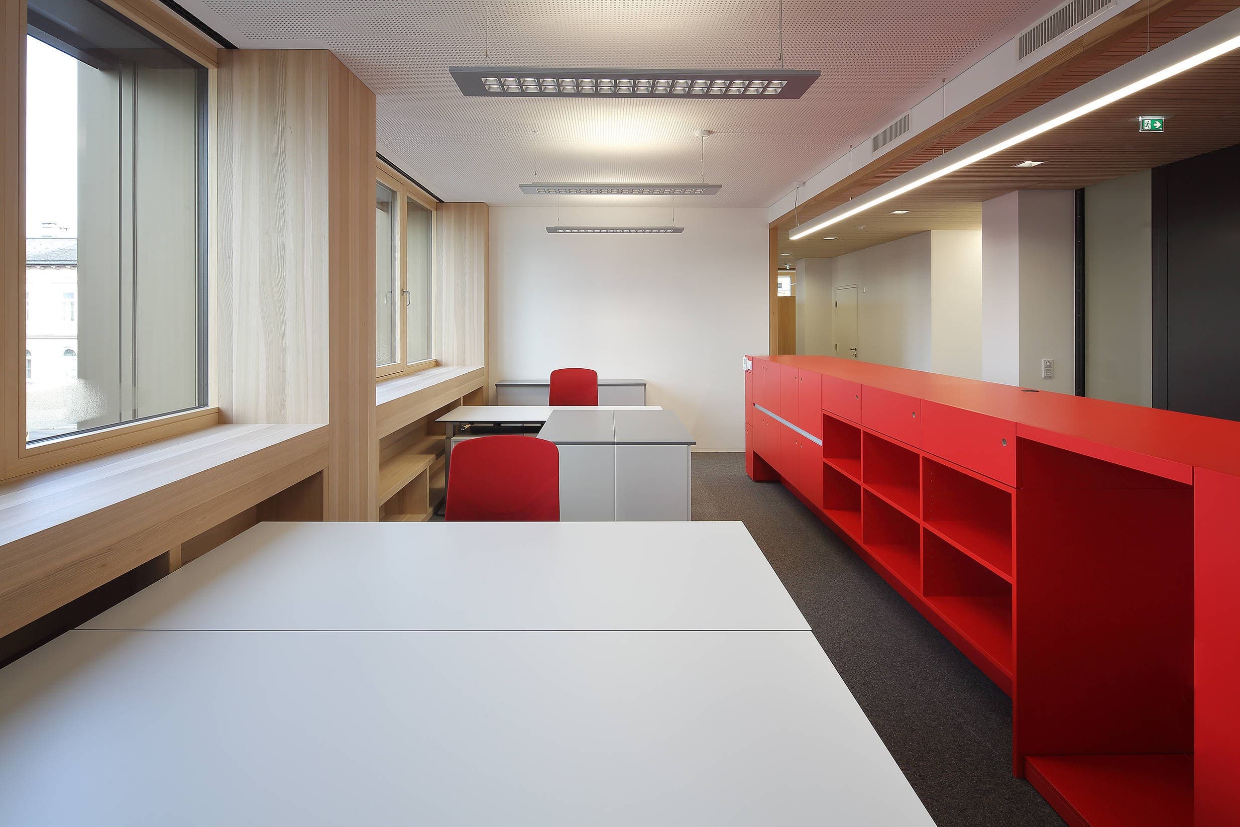 Die Gebäudehülle des Massivbaues wurde dabei thermisch saniert und gesamthaft verbessert. Dabei wurden die bestehenden Putzflächen mit einem Vollwärmeschutz versehen. Die Fensterflächen wurden durch 3-fach verglaste Holz-Alu-Fenster ersetzt. Die Fassadenbereiche um die Fenster werden ergänzt durch außenseitig aufgesetzte Holzrahmenkonstruktionen, mit gedämmten Brüstungs- und Sturzbereichen und integriertem Sonnenschutzanlagen.