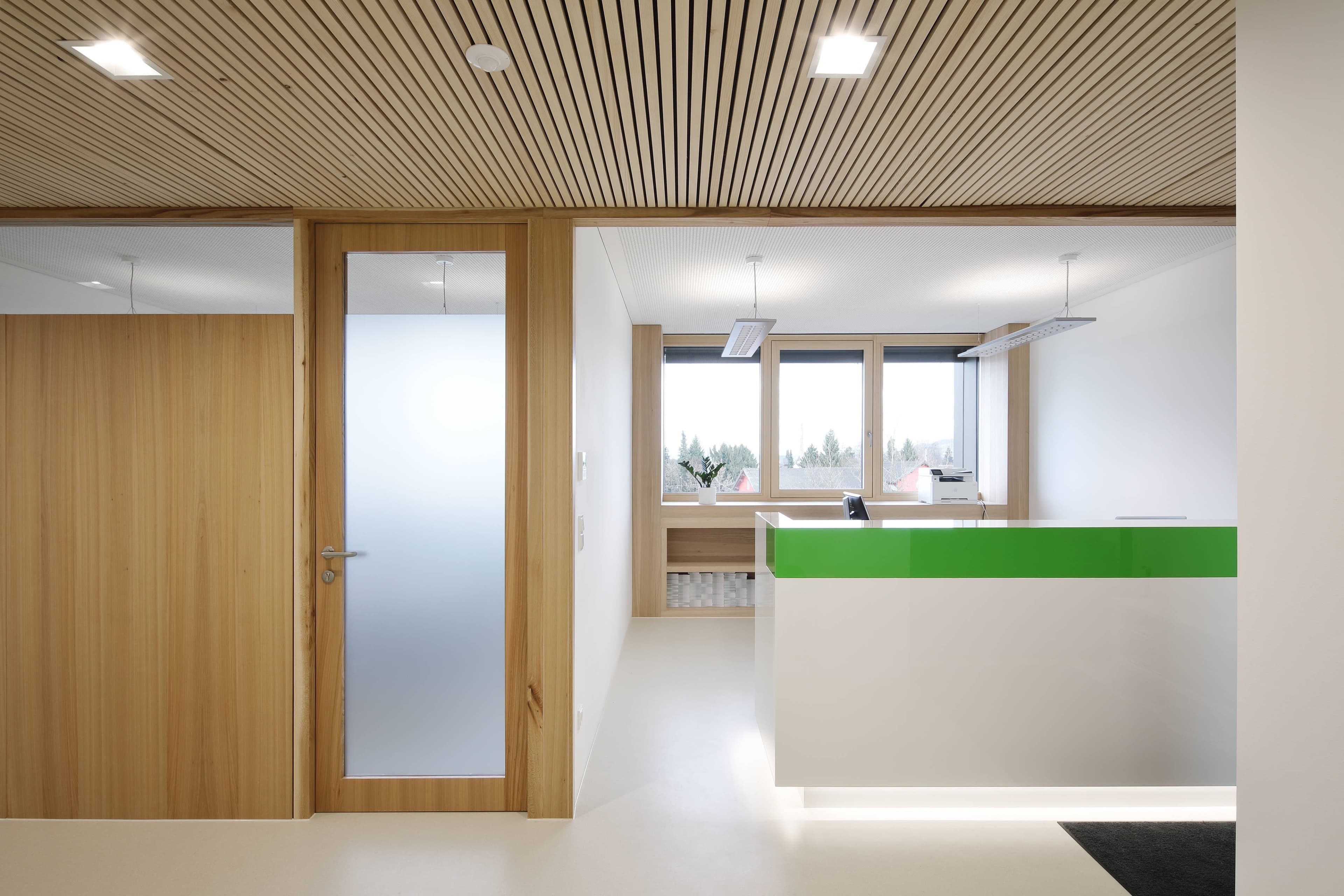 Eine weitere architektonische Tiefenwirkung wird durch die, im Bereich der Fensterelemente, nochmals um eine Ebene zurückversetzten Öffnungsflügel erreicht. Die Rahmenkonstruktionen sind mit Verblechungen aus farblich eloxierten Aluminium gegenüber den Putzflächen abgesetzt.