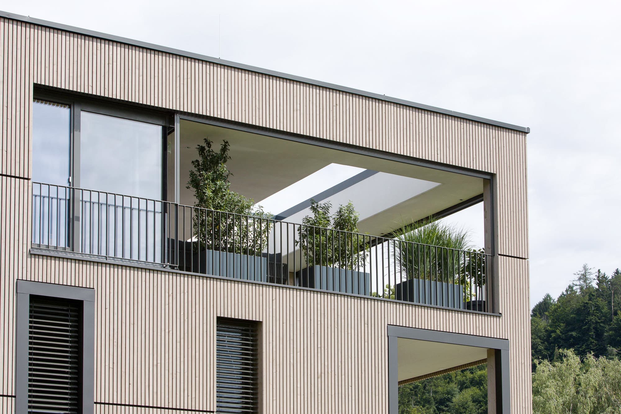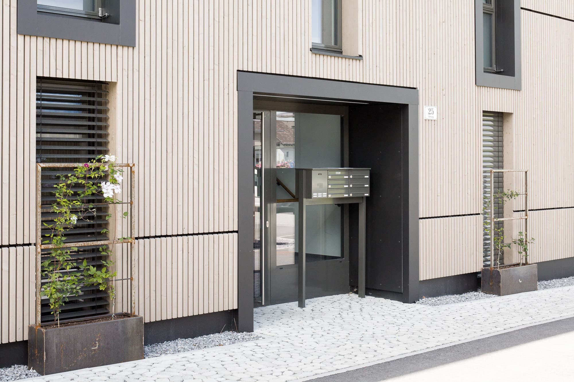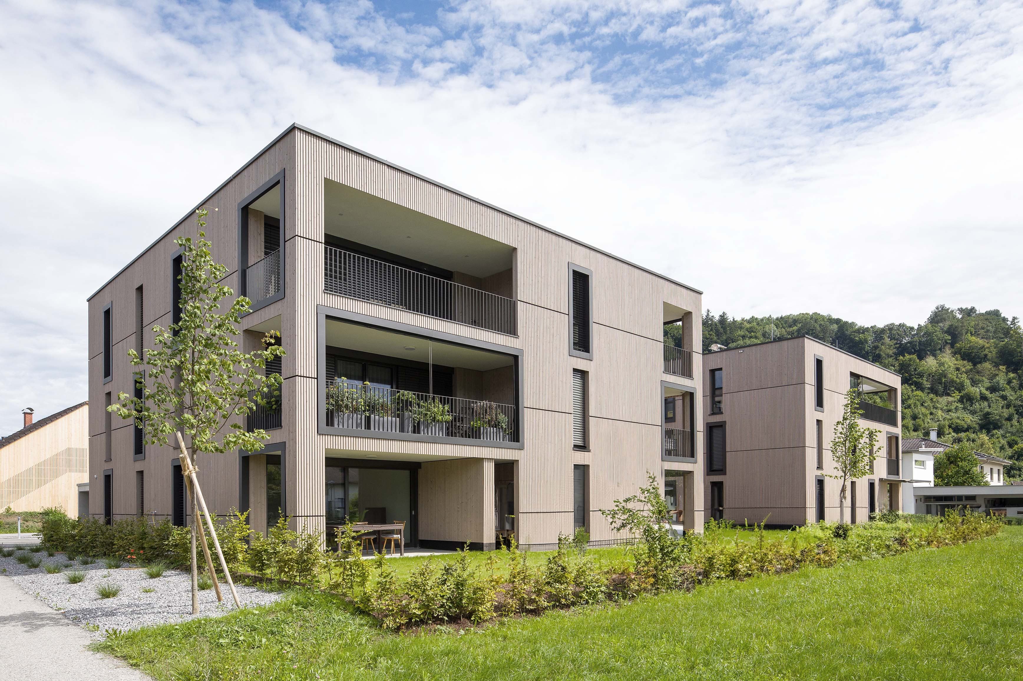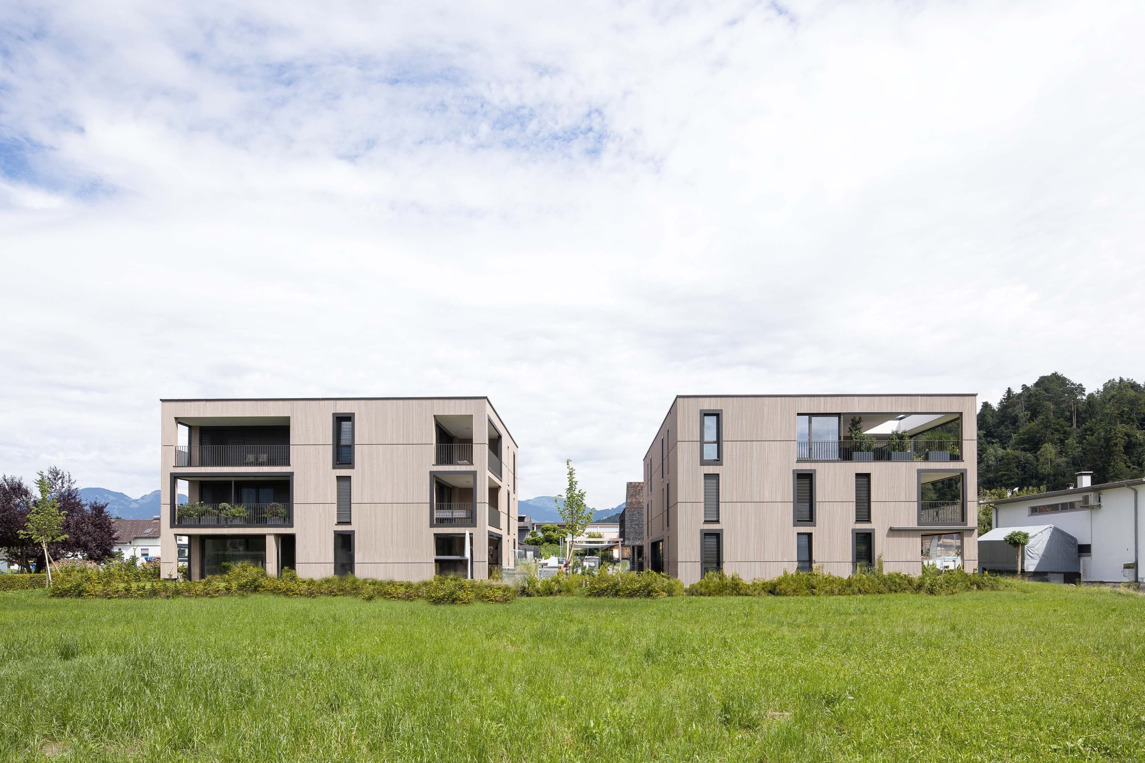 Inmitten der dörflichen Einfamilienhausstruktur in Feldkirch Nofels wurde die Kleinwohnanlage Bittweg mit zwei dreigeschossigen Gebäuden in Massivbauweise errichtet. Der Städtebau orientiert sich an der umliegenden Bebauung und schafft damit eine Brücke zwischen der Typologie „Einfamilienhaus“ und der eines Mehrfamilienhauses. Die gradlinige Architektursprache mit Holzfassade soll dem Ensemble einen zeitlosen und eleganten Charakter geben und somit zu einer Aufwertung der Umgebung beitragen.