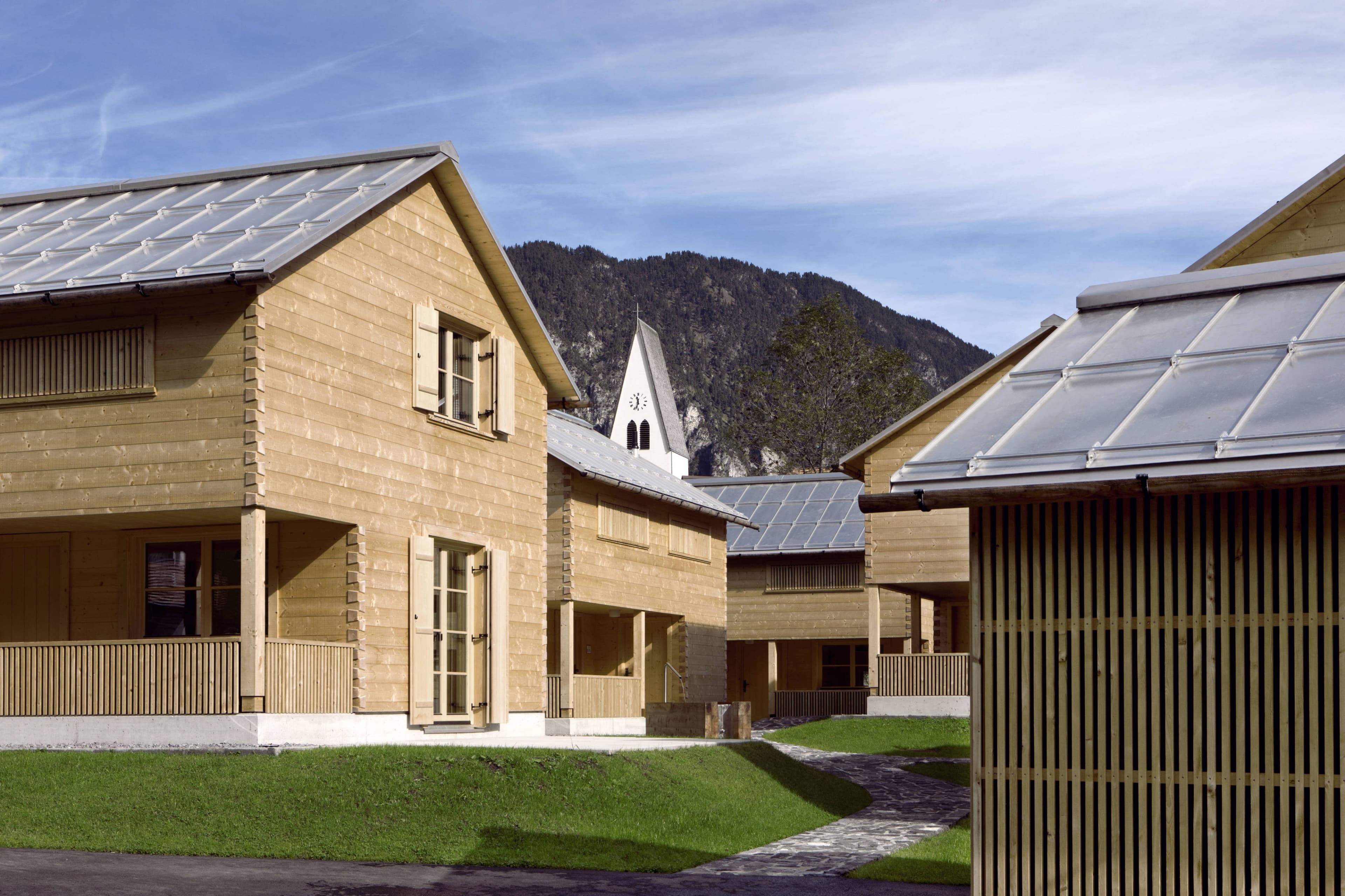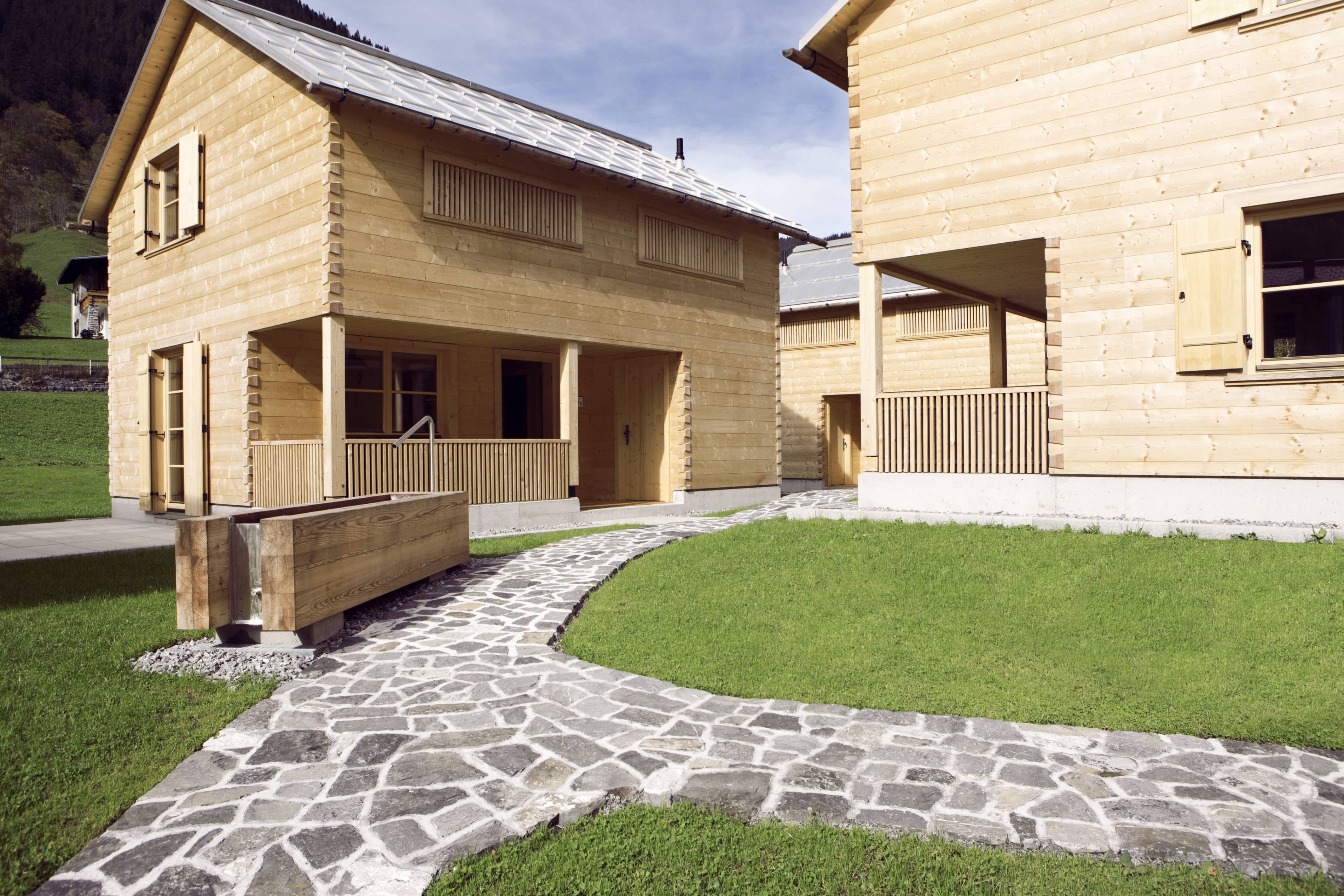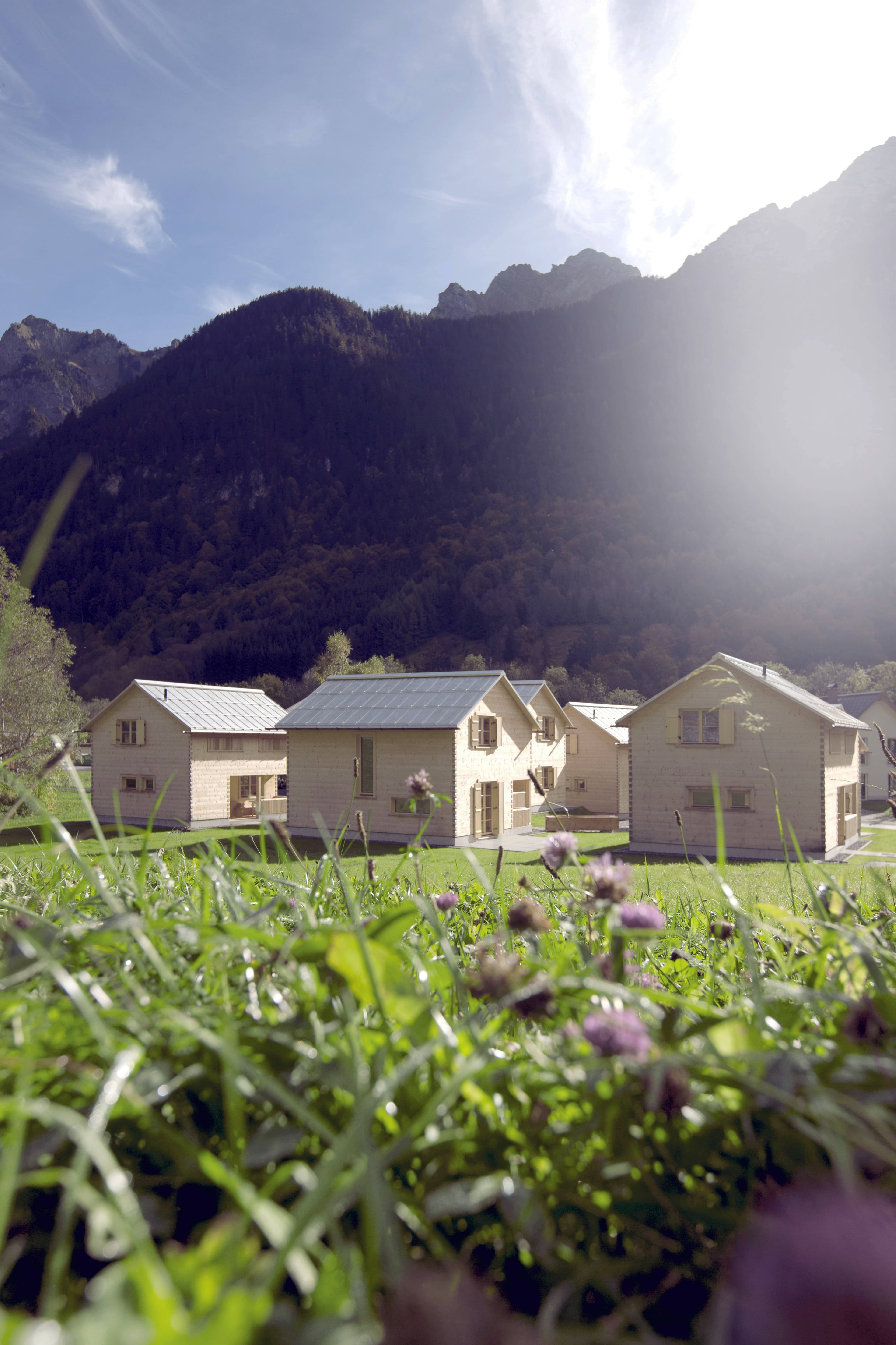 Die Ferienhausanlage liegt in mitten der Gemeinde Brand. Die sechs Hütten passen sich in die dörflich gewachsene Struktur sehr gut ein und sind abwechslungsweise nach Südosten bzw. Südwesten ausgerichtet.