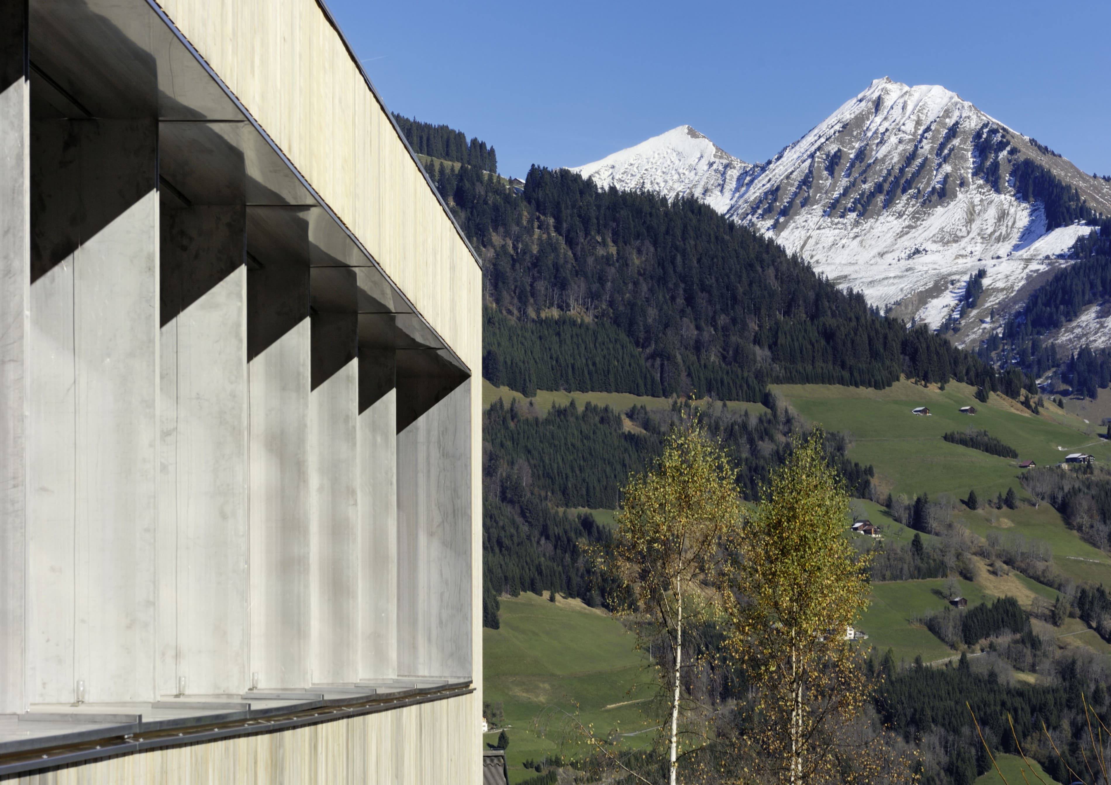 Das Gebäude tritt nach außen hin insbesondere mit einer Holzfassade und wenigen, aber großzügigen Öffnungen in Erscheinung. Das Dach wurde als zweiseitig geneigtes Pultdach in Blech ausgeführt. Im Inneren spielt Holz neben wenigen anderen Materialien die wesentlichste Rolle. Für Wand-, Deckenverkleidungen und Einrichtung wurden fast ausschließlich massive Weißtannenplatten verwendet, die zusammen mit den großzügigen Raumhöhen und Verglasungen eine angenehme Raumatmosphäre erzeugen.