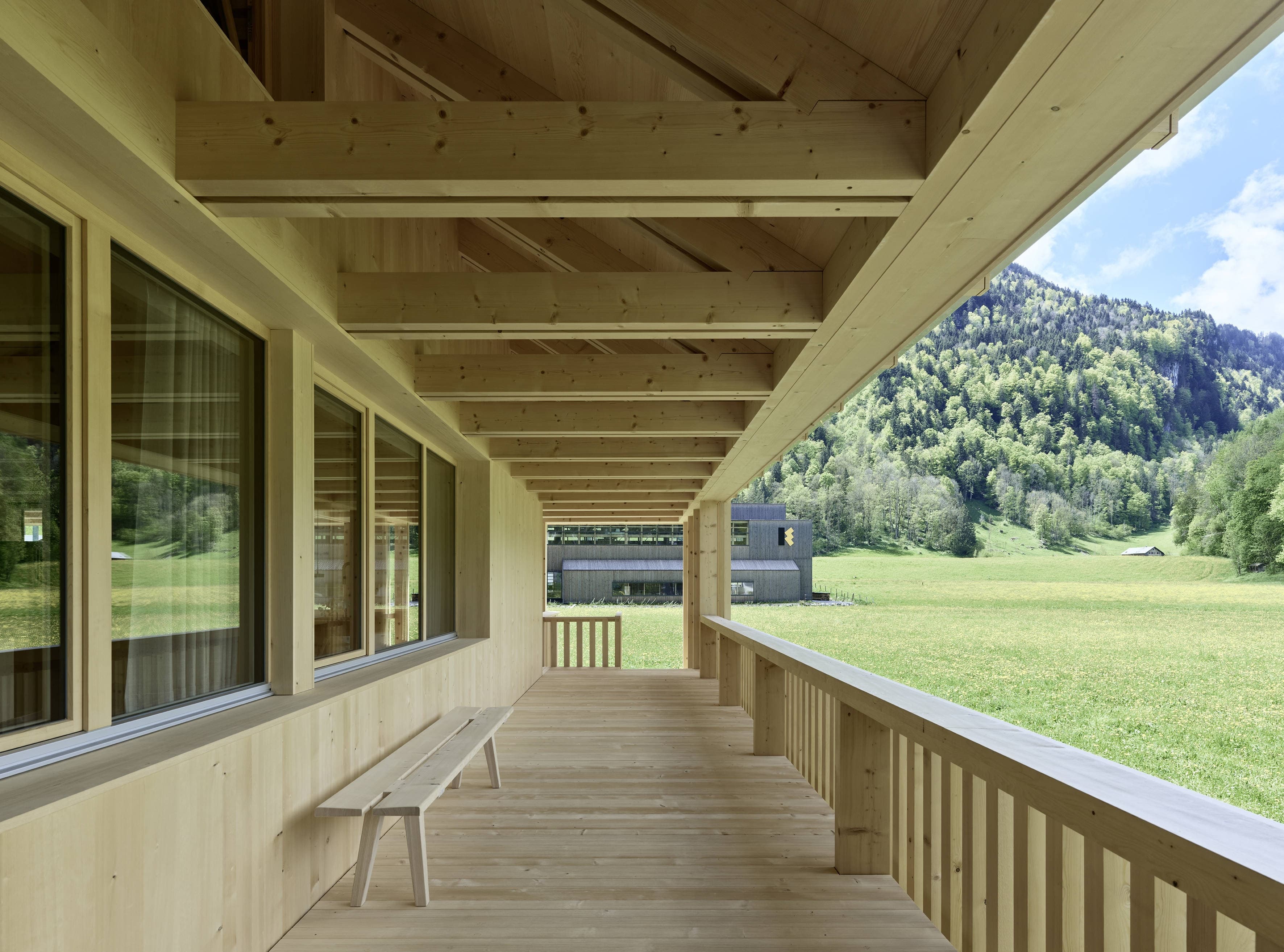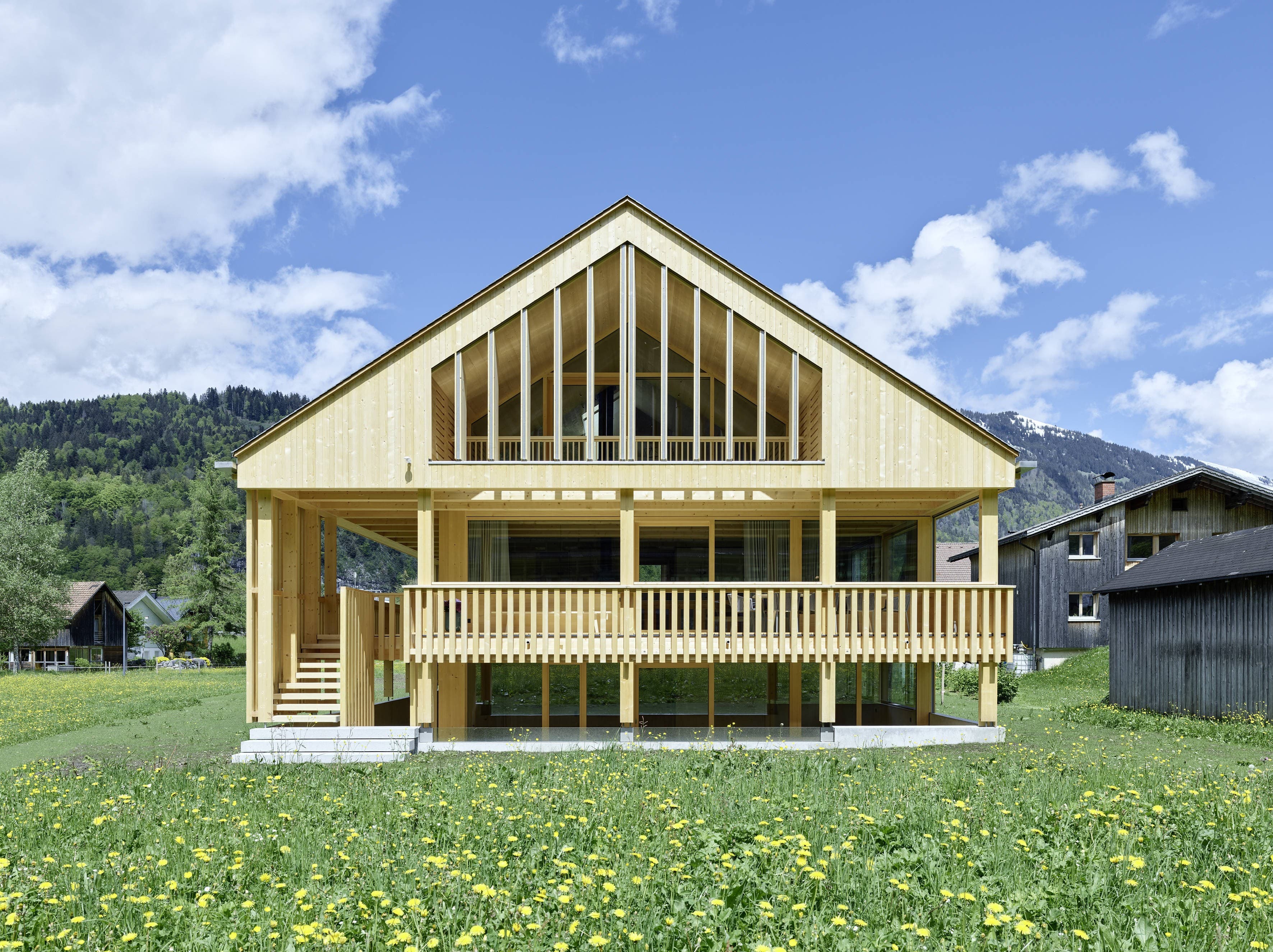 Ursprünglich sollte ein klassisches EFH entstehen, im Laufe der Planung entwickelte sich daraus ein flexibel nutzbares Gebäude mit mehreren Wohneinheiten. Eher zufällig ergaben sich viele Ähnlichkeiten zu der traditionellen Bautypologie eines Bregenzerwälder Hauses. Proportion und Größe sind vergleichbar. Auch das UG ist wie beim traditionellen Wälderhaus nur halb im Erdreich eingebettet, um eine natürliche Belichtung zu ermöglichen. Auch die Traufhöhe von 5 m mit einem vorgelagerten "Schopf" ergeben den Übergang zwischen Freiraum und Gebäude, wie beim traditionellen Bautypus. Und die Erschließung erfolgt über eine Mittelerschließung ergänzt durch ein "Hinterhaus" mit Garage und Mitarbeiterwohnung sind vergleichbar.