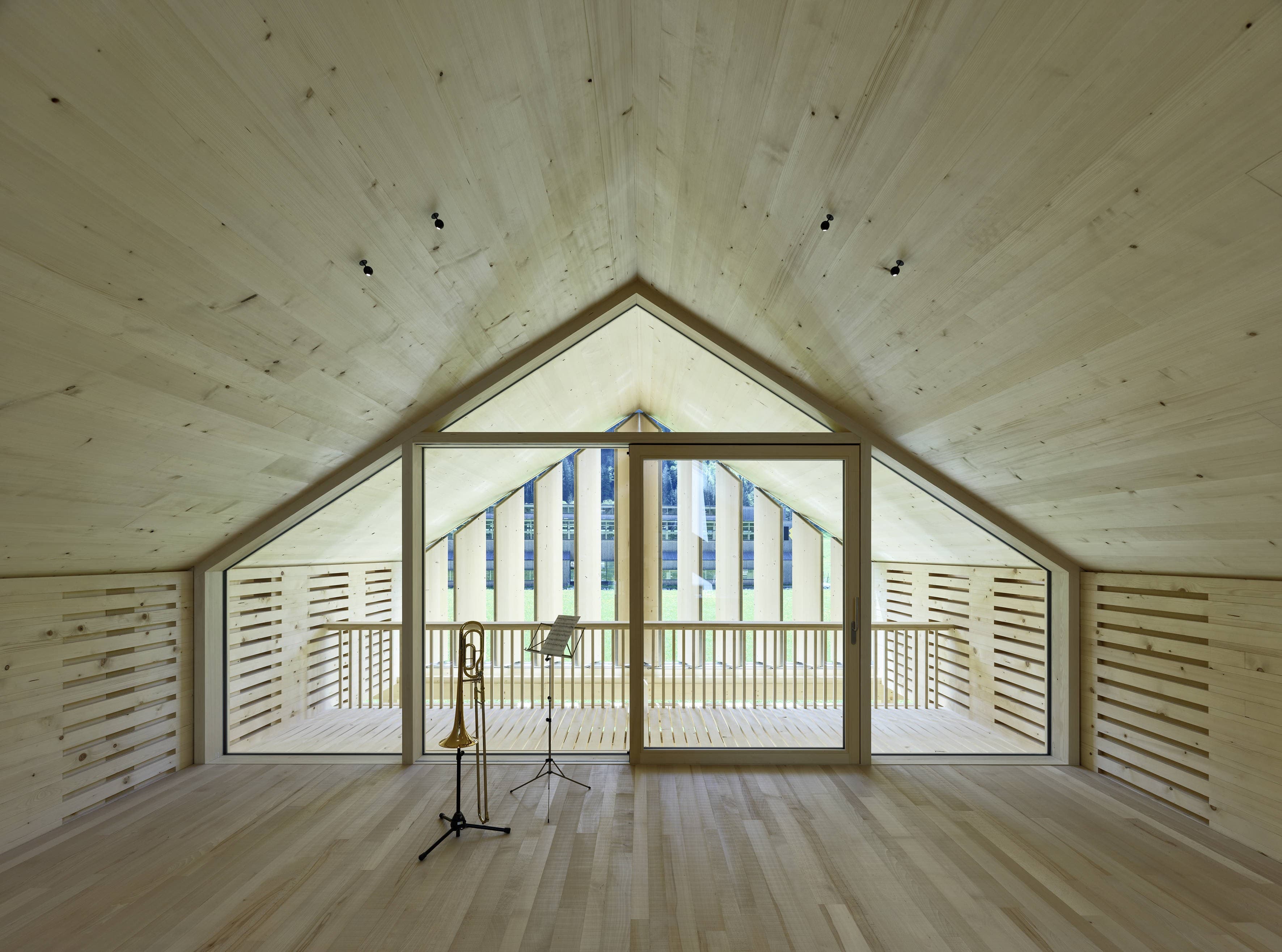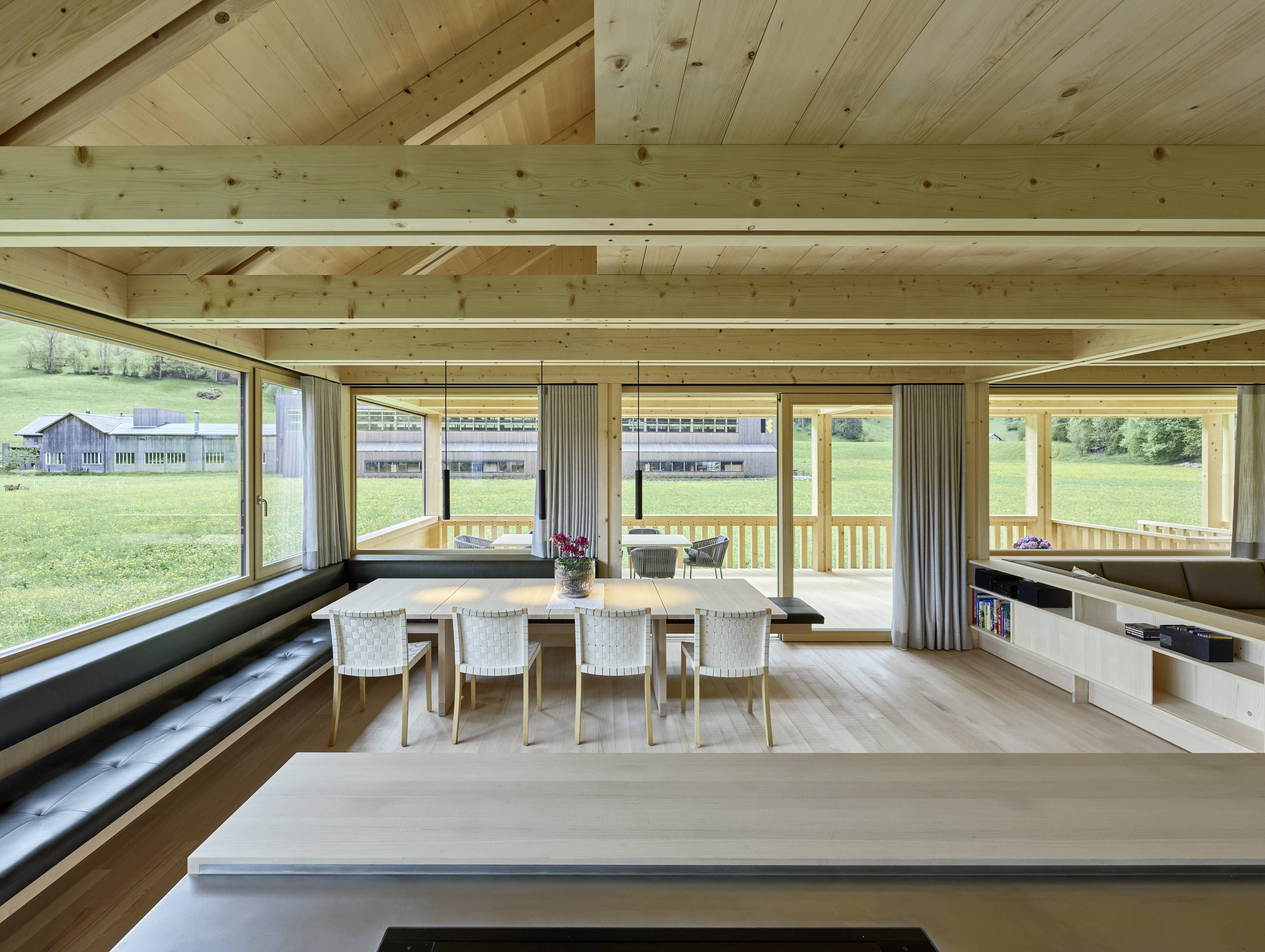 Das Holz, aus nordseitig am Hang gewachsenen Fichten, wurde mit nur ganz wenigen Querschnitten eingeschnitten. Das beste Holz wurde für die sichtbaren Balkenquerschnitte und Dielen verwendet. Aus dem Rest machte man Diagonalschalungen, Lattungen etc. Jeder Kubikzentimeter des Baumes fand seine Anwendung. Mit Ausnahme ganz weniger Dreischichtplatten, wurde alles leimfrei konstruiert. Beim Holz für die Tischlermöbel im Innenraum wurde ergänzend zur Fichte heimisches Buchenholz verwendet.