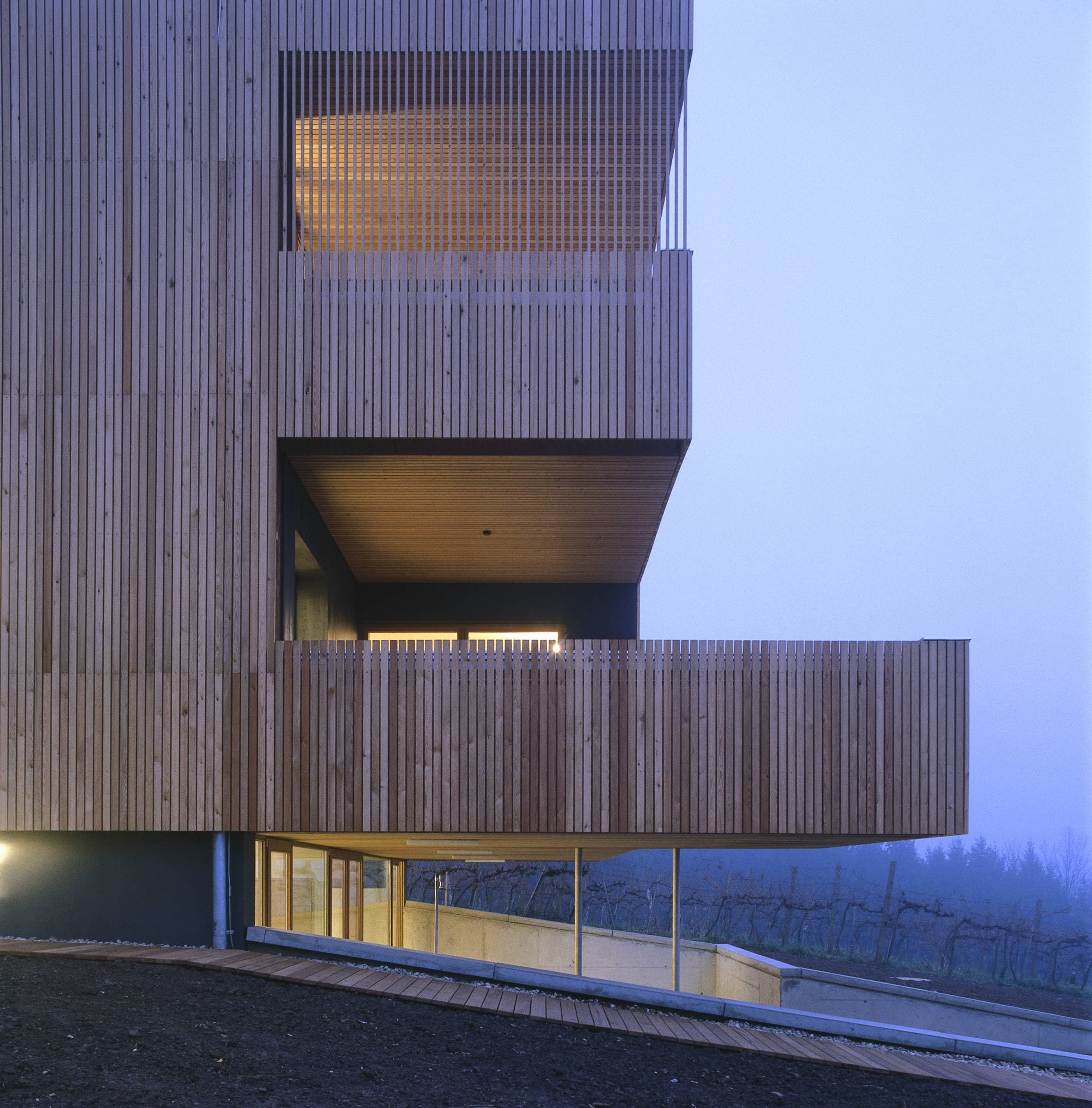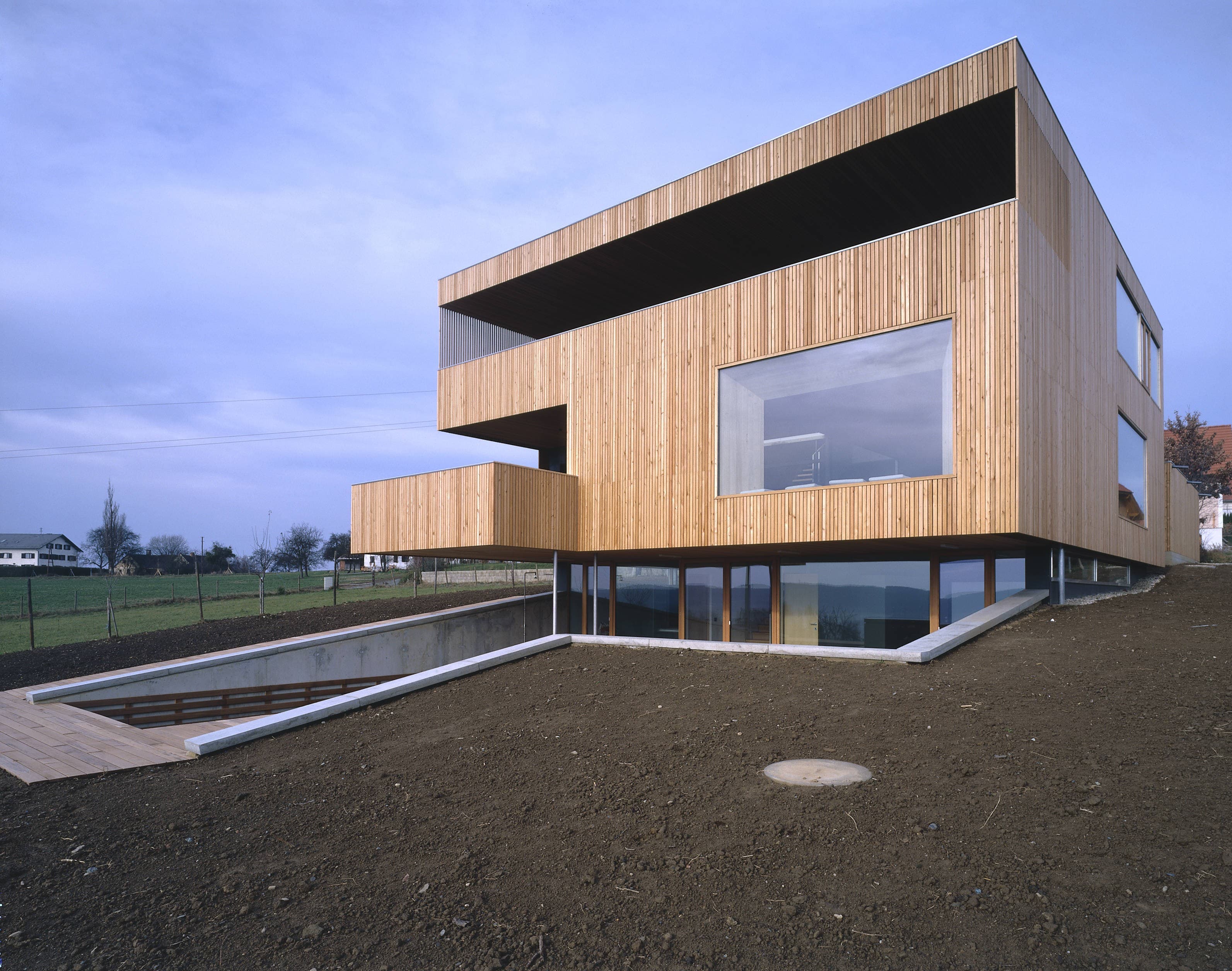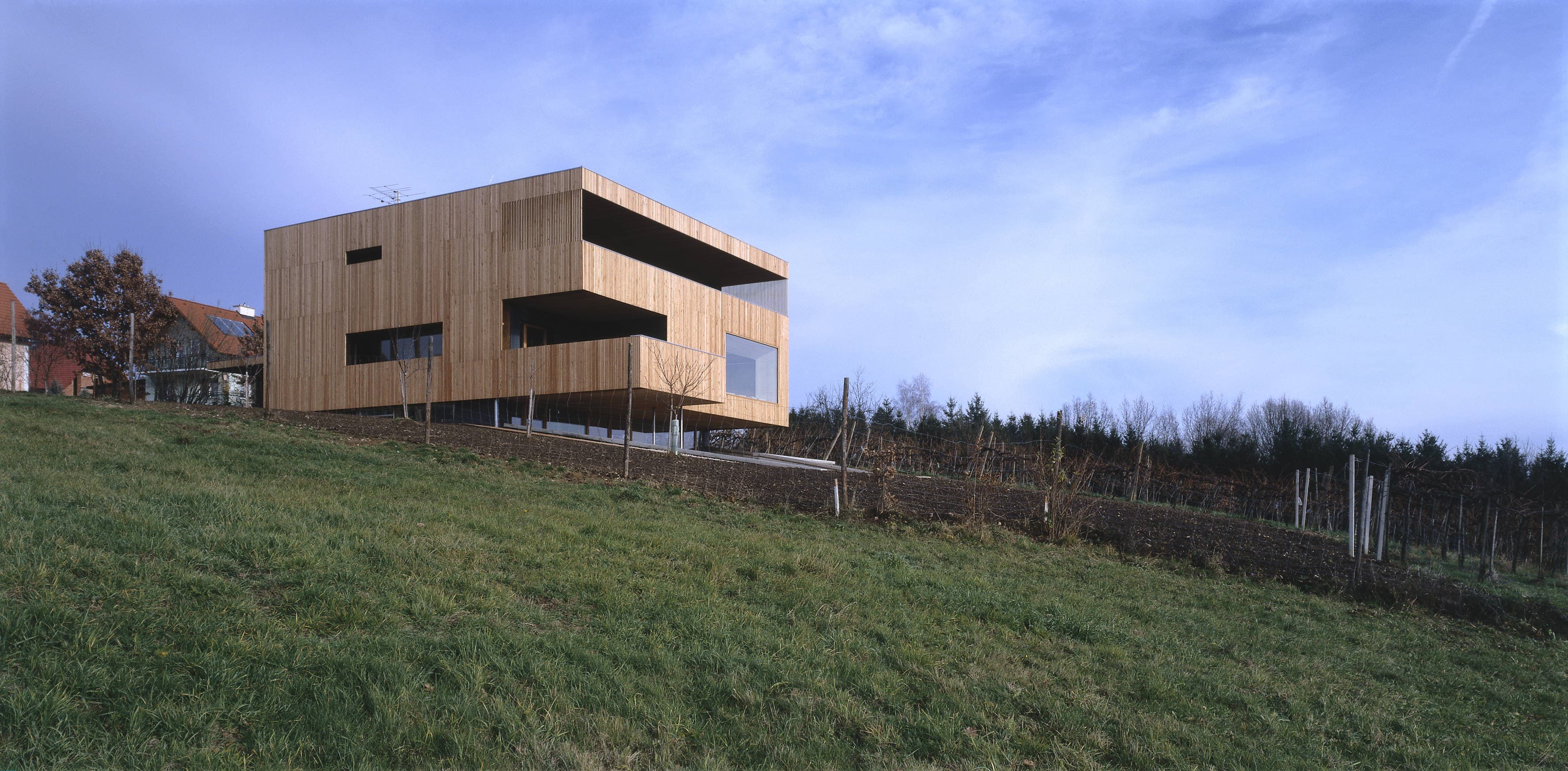 Das Grundstück: ein südlich abfallender, schmaler Streifen in einem Weinberg über Bad Waltersdorf. Die Erschließung erfolgt von Norden über eine schmale Zufahrt, die in den oberen flacher geneigten Bauplatz mündet. Man betritt das dreigeschossige Haus auf der mittleren Ebene, die auf der Südseite weit auskragt, während das in Massivbau errichtete Untergeschoss im rückwärtigen Teil zur Gänze im Hang sitzt und sich Richtung Pool und Talgrund öffnet. Das Obergeschoss, ebenso wie das Erdgeschoss in Holzbauweise ausgeführt, besitzt eine integrierte Terrasse, die sich ebenfalls über die gesamte Südseite erstreckt. Die Grundrisse sind durch einen mittigen Erschließungsstreifen gedrittelt, der eine funktionale Absonderung einzelner Funktionsbereiche ermöglicht. Die Sekundärbereiche sind in den nördlichen Teilen des Hauses untergebracht, Wellness und Wohnen dehnen sich nach Süden aus.