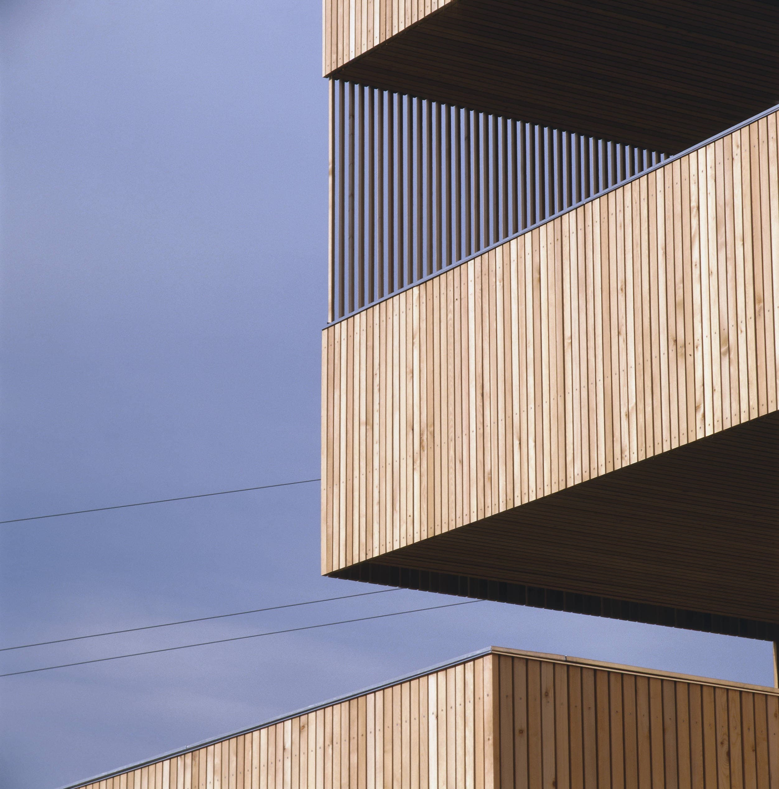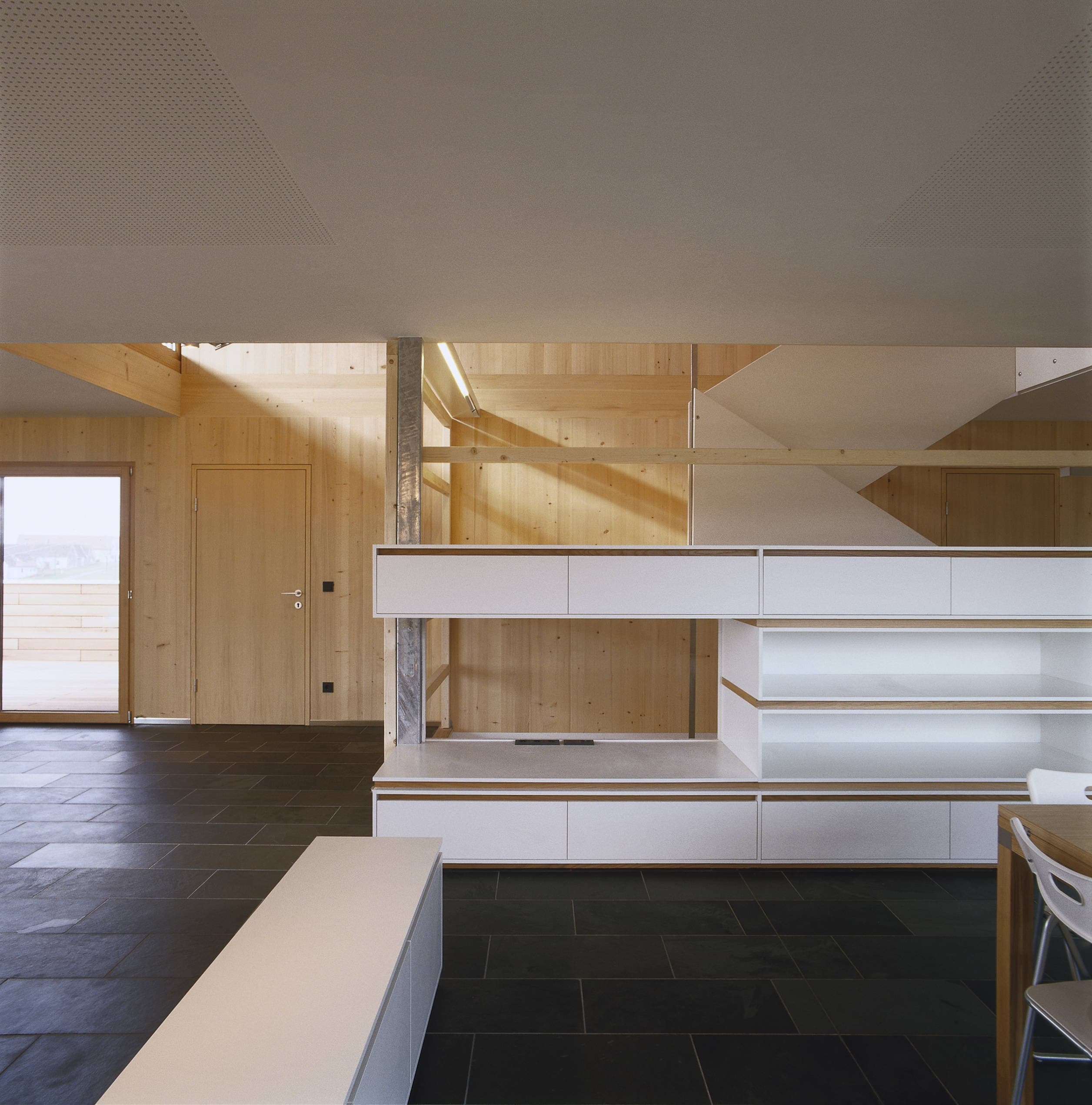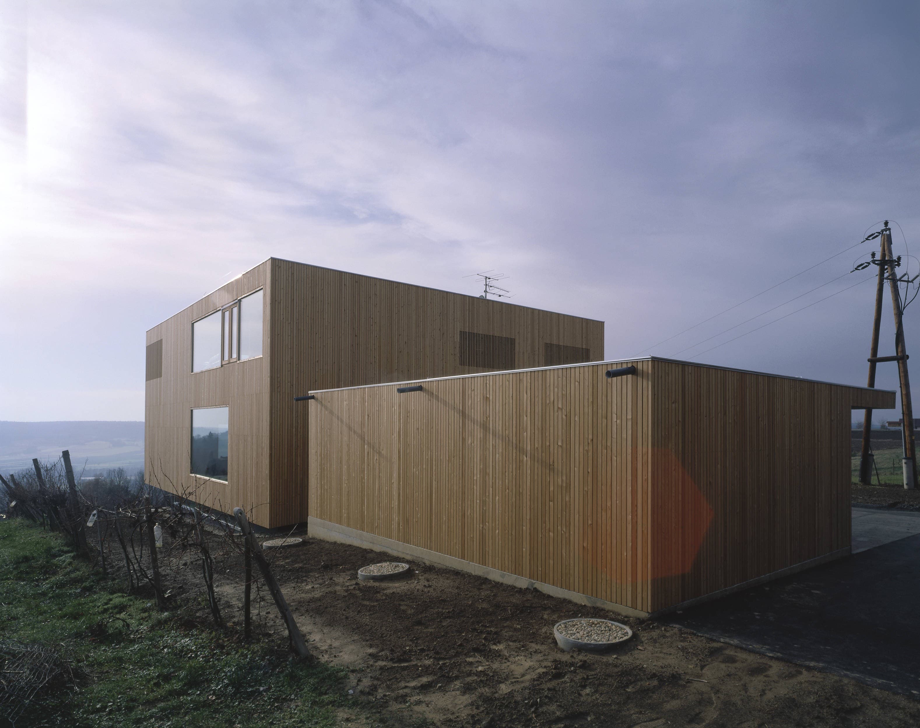 Das Grundstück: ein südlich abfallender, schmaler Streifen in einem Weinberg über Bad Waltersdorf. Die Erschließung erfolgt von Norden über eine schmale Zufahrt, die in den oberen flacher geneigten Bauplatz mündet. Man betritt das dreigeschossige Haus auf der mittleren Ebene, die auf der Südseite weit auskragt, während das in Massivbau errichtete Untergeschoss im rückwärtigen Teil zur Gänze im Hang sitzt und sich Richtung Pool und Talgrund öffnet. Das Obergeschoss, ebenso wie das Erdgeschoss in Holzbauweise ausgeführt, besitzt eine integrierte Terrasse, die sich ebenfalls über die gesamte Südseite erstreckt. Die Grundrisse sind durch einen mittigen Erschließungsstreifen gedrittelt, der eine funktionale Absonderung einzelner Funktionsbereiche ermöglicht. Die Sekundärbereiche sind in den nördlichen Teilen des Hauses untergebracht, Wellness und Wohnen dehnen sich nach Süden aus.